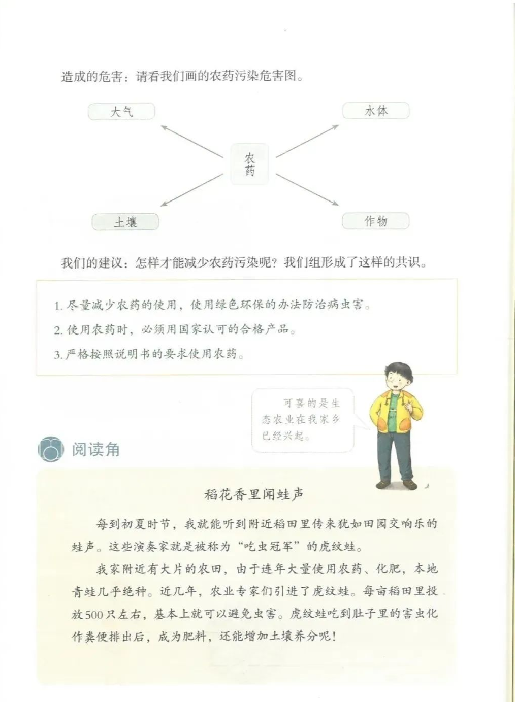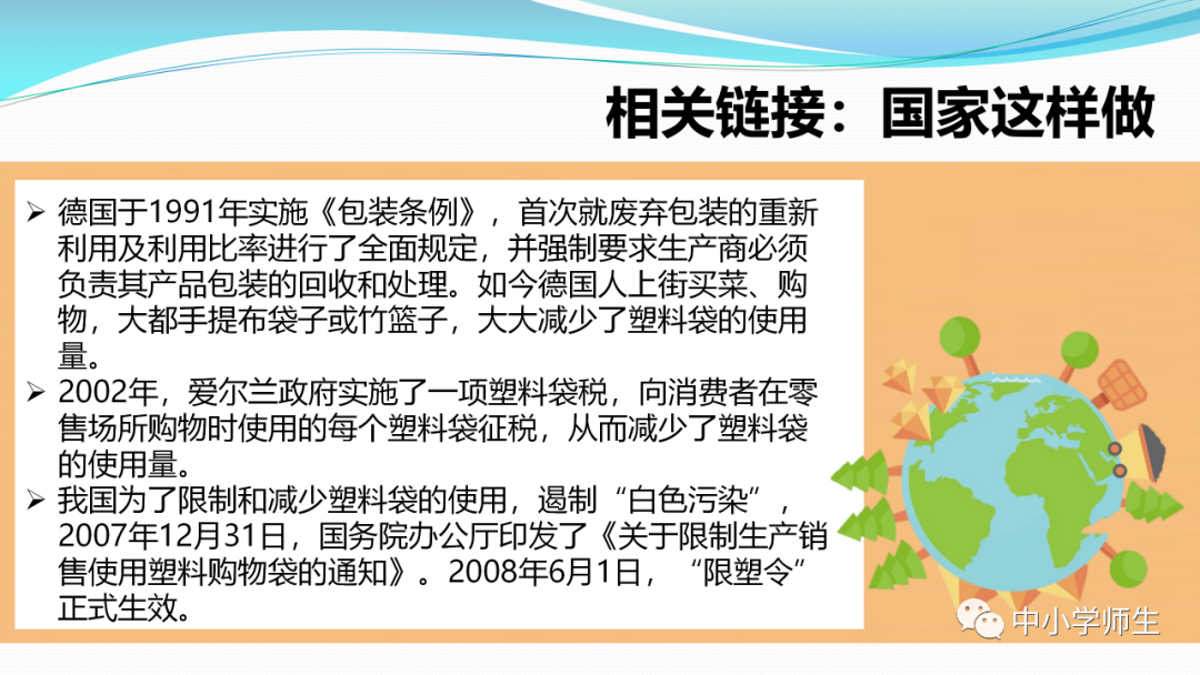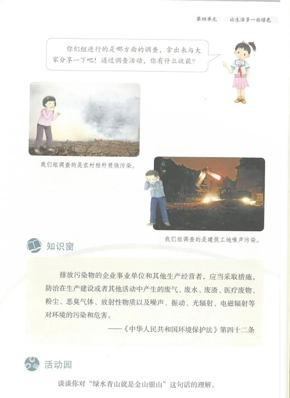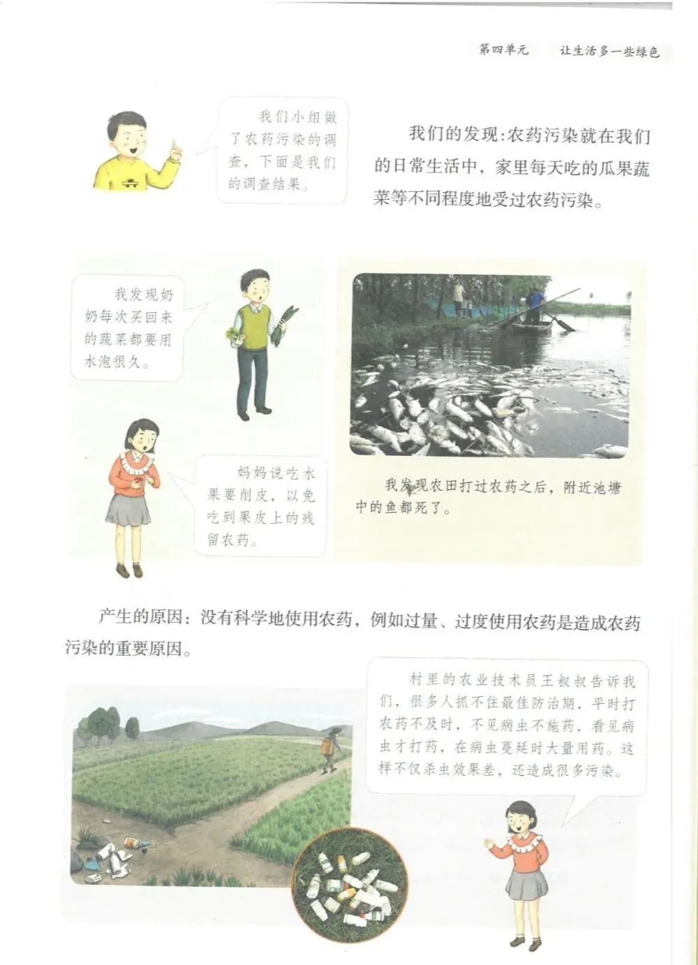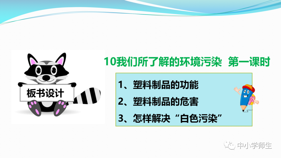 获取配套课件教案习题试卷请拉到文末微课讲解电子课本知识点一、知识点。1. 在日常生活中,塑料制品随处可见。塑料制品给我们的生活带来了很多便利,但塑料垃圾也给我们带来了很多困扰,甚至被人们称为白色污染。2. 我们的生活离不开塑料,可塑料垃圾又给环境带来那么大,那么长久的危害,我们必须合理的有节制的使用塑料制品,只有这样才能减少塑料垃圾的产生。3. 为了解决这个矛盾,人们找到了很多塑料制品的替代品,这些替代品的推广可以有效的减少白色污染。4. 在我们的生活中除了白色污染,还有空气污染、水质污染等环境污染。5. 绿水青山就是金山银山。二、简答题。1. 塑料垃圾(白色污染)危害有哪些?严重影响我们的身体健康;危害环境;使土壤环境恶化,严重影响农作物的生长;若把废塑料直接进行焚烧处理,将给环境造成严重的二次污染。2. 怎样解决塑料垃圾(白色污染)?我们必须合理的有节制的使用塑料制品,找到塑料制品的替代品,只有这样才能减少塑料垃圾的产生。3. 我家的“减塑”方案。应尽量减少一次性塑料餐具和纸制餐具的使用;应拒绝使用塑料袋买菜或盛装食物,买菜可用菜篮子或布袋避免使用上的一次性,减少对环境的污染;加强环保宣传,提高全家的环保意识。4. 在我们的生活中除了白色污染,还有哪些环境污染呢?环境污染主要包括:空气污染,水质污染,固体废物污染,噪声污染,其他污染,主要是电磁辐射污染、光污染。图文讲解教学设计10《我们所了解的环境污染》教学设计教学目标知识与能力:1.引导学生从日常生活经验出发,探究认识体会塑料的广泛用途,知道塑料废弃品对环境的污染及其危害。2.能了解其他环境污染情况,如农药污染,水污染,大气污染,噪音污染等,树立环保意识。过程与方法:通过自身体验、阅读感悟、情境体验、制订减塑方案、环境污染大搜索、调查研究、讨论等活动教学,培养学生动手实践能力,培养学生环保意识。情感态度与价值观:培养学生环保意识。教学重难点1.重点:了解塑料制品对环境污染的危害,了解其他农药污染,水污染等树立环保意识。2.难点:树立环保意识。学情分析。四年级的学生处于从中年级向高年级的过渡期,他们经过前三年课程的学习,对环境污染感受较少、对其危害性认识不够,没有环保意识,对人和事物的认识逐渐摆脱形象思维的特点,初步具备抽象思维的能力,再根据以上教材分析,为此,确定以下教学方法。教法和学法。1.教法:启发式、小组合作探究2.学法:自主学习法及活动与探究3.教学准备:教师制作PPT课件及搜集资料,学生课前准备好参与活动的资料教学过程。第一课时(一)导入。1.师出示视频及图片:白色污染。生看后回答问题:上述视频反映了什么问题?2.生自由回答。(塑料垃圾及其危害)3.师:同学们回答得很好。今天我们就来探索白色污染的问题。板书课题。(二)讲授新课目标导学一:从白色污染说起活动与探究一:看一看(1)生阅读教材第72页内容(2)小组合作,探究问题☆你知道什么是白色污染吗?☆你见过哪些塑料产品?(3)先在小组内交流,各组推荐代表,全班交流与分享(4)师小结活动与探究二:认真看一下第73面的阅读角(1)生阅读教材第73页内容(2)小组合作,探究问题☆你知道为什么会被称为白色污染吗?☆根据上述大王如果是你,你会怎么办?(3)先在小组内交流,各组推荐代表,全班交流与分享(4)师小结活动与探究三:研究一下第74面的相关链接(1)生阅读教材第74页内容(2)小组合作,探究问题☆但是污染这么严重,我们可以完全不使用白色污染吗?☆如果不使用这些白色污染,我们的生活会变成怎样?(3)先在小组内交流,各组推荐代表,全班交流与分享(4)生完成教材P74空格内容,师指导、补充活动与探究四:想一想(1)生阅读教材第75页内容(2)小组合作,探究问题☆在你的周围有哪些是可以替代塑料产品呢?☆你有什么好的方案?(3)先在小组内交流,各组推荐代表,全班交流与分享(4)生完成教材P75空格内容,师指导、补充第二课时(一)复习导入。(二)讲授新课。目标导学二:环境污染大搜查活动与探究一:查一查(1)生阅读教材第76页内容(2)小组合作,探究问题☆你认为白色污染会对环境造成怎样的危害?☆如果你发现了白色污染,你会怎样处理?(3)先在小组内交流,各组推荐代表,全班交流与分享。(4)生完成教材P76空格内容,师指导、补充活动与探究二:看一看(1)生阅读教材第77页内容(2)小组合作,探究问题☆你认为造成这些因素的原因是什么?☆如果你遇到这种情况,你会怎么办?(3)先在小组内交流,各组推荐代表,全班交流与分享(4)师小结活动与探究三:好好看一下第78面的阅读角。(1)生阅读教材第78页内容(2)小组合作,探究问题☆你认为怎样做才能减少农药污染?☆读了上述材料,你有何体会?(3)先在小组内交流,各组推荐代表,全班交流与分享(4)师小结活动与探究四:看一看第79面的阅读窗和活动园。(1)生阅读教材第79页内容(2)小组合作,探究问题☆通过此次调查你有什么收获?☆请你谈谈对绿水青山就是金山银山这句话的理解。(3)先在小组内交流,各组推荐代表,全班交流与分享(4)师小结(三)师总结:认识体会了环境污染的现状及其危害,在日常生活中我们要有环保意识。板书设计。10.我们所了解的环境污染白色污染:现状及危害其它污染:现状及危害同步习题一、判断题:1.塑料制品给我们的生活