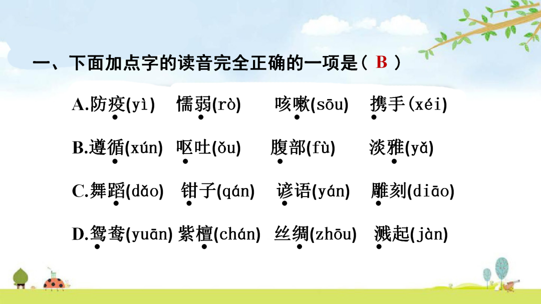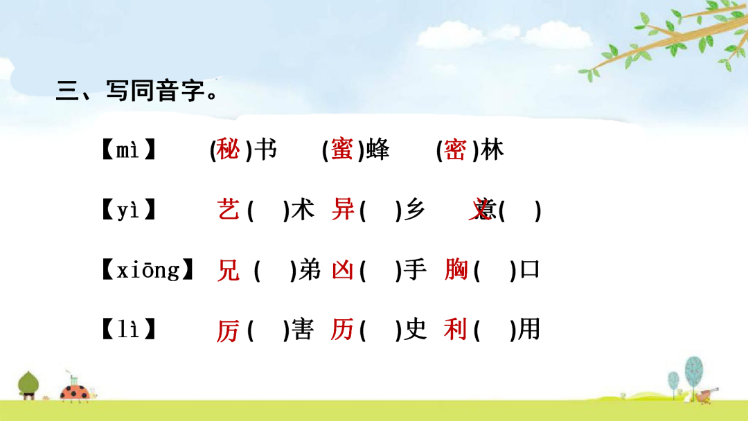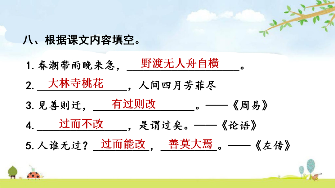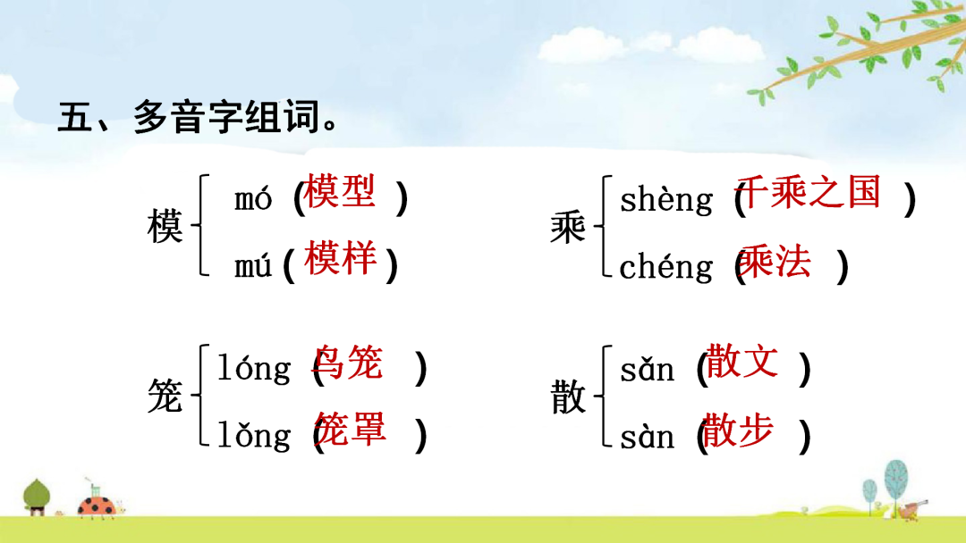 似sì(似乎)shì(似的) 纤qiān(光纤)xiān(纤细) 散 sàn(散步)sǎn(闲散) 挨 āi(挨挨挤挤) ái(挨打) 为wéi(作为)wèi(为什么)折shé(折本)zhé(折断)朝zhāo(朝霞)cháo(王朝)盛shèng(盛开)chéng(盛东西)倒dǎo(跌倒)dào(倒茶)禁jìn(禁止)jīn(不禁)撒sǎ(撒落)sā(撒手)挣zhēng(挣扎)zhèng(挣脱)称chēng(称号)chèn(匀称)划huà(划分)huá(划船)难nàn(苦难)nán(难过) 应yīng(应该)yìng(应答)累lěi(积累)lèi(劳累) 鲜xiān(新鲜)xiǎn(朝鲜)爪zhǎo(前爪)zhuǎ(爪子) 济jǐ(济南)jì(同舟共济)便pián(便宜)biàn(便利)种zhǒng(种子)zhòng(种花)号háo(号叫)hào(记号)闷mèn(愁闷)mēn(闷热)都dū(首都)dōu(都是)背bēi(背东西)bèi(背部)长chánɡ(长短)zhǎng(长大)系jì(系鞋带)xì(关系)担dàn(挑担子)dān(担心)背bēi(背包)bèi(后背)扇shàn(扇子)shān(扇风)钻zuàn(电钻)zuān(钻洞)斗dǒu(一斗)dòu(战斗)处chù(好处)chǔ(处置)差chà(差劲)cī(参差不齐)和huò(和弄)huó(和面)薄bò(薄荷)bó(厚此薄彼)散sàn(散步)sǎn(散文)弹tán(弹琴)dàn(子弹)教jiào(教室)jiāo(教书)模mú(模样)mó(模型)降xiáng(投降)jiàng(降落)宁nìng(宁愿)níng(宁静) 参cēn (参差)shēn(人参)卷juàn (卷子)juǎn(卷住)藏zànɡ(宝藏)cánɡ(收藏)嚷rǎnɡ(叫嚷)rānɡ(嚷嚷)旋xuán(旋涡)xuàn(旋风)涨zhǎnɡ(涨潮)zhànɡ(头昏脑涨)折shé (折了)zhé(折断)1. 《 绝 句 》作者( )( )代,( )( )江 山 丽,( )( )花草香。泥融( )燕子,沙暖( )鸳鸯。2.《 惠崇春江晚景 》作者( )( )代,竹外桃花( )( )枝,春江水暖( )先知。蒌蒿满地芦芽短,正是( )( )欲上时。3.《三衢道中》作者( )( )代,( )( )黄时日日晴,小溪泛尽( )山行。绿阴不( )来时路,添得( )( )四五声。1.一身( )的羽毛,一对( )的翅膀,加上( )似的尾巴,凑成了( ) 的 小 燕 子 。2.( )的草,( )的叶,( )的花,都像( )似的聚拢来,形成了( )的春天。小燕子从( )赶来,为春光增添了许多( )。在( )中,在( )中,燕子( )身子在天空中( ),唧唧地( ),有的由这边的( )( ),飞到了那边的( )下边;有的( )过湖面,尾尖偶尔( )了一下水面,就看到波纹( )地荡漾开去。3.几对燕子( )了,( )在电线上。( )的天空,( )之间连着( ),多么像( )!停着的燕子成了( ),( )了一支正待。4.二三月的春日里,轻风微微地吹拂着,如毛的( )由天上洒落着,千条万条的( ),红的白的黄的花,青的草,绿的叶,都像赶集似的聚拢来,形成了( )的春天。这时候,那些小燕子,那么( )的小燕子,也由南方飞来,加入了这个( )的图画中,为春光平添了许多生趣。5.小燕子带了它的双剪似的尾巴,在阳光满地时,斜飞于旷(kuà ng)亮无比的天空,叽的一声,已由这里的( )上,飞到那边的( )下了。1、荷叶( )的,像一个个碧绿的( )。白荷花在这些大圆盘之间( )出来。有的花瓣儿全展开了,露出嫩黄色的( )。有的还是( ),看起来( )得马上要( )似的。2、我忽然觉得自己仿佛就是一朵( )。一阵微风吹过来,我就( ),雪白的的衣裳( )。不光是我一朵,一池的荷花都在( )。风过了,我停止( ),( )站在那儿。( )飞过来,告诉我清早飞行的快乐。《 忆江南 》作者( )( )代江南好,风景旧曾( )。日出江花红胜( ),春来江( )如蓝,能不( )江南?《守株待兔》作者( )( )代,宋人有( )( )。田中有株。( )走触株,( )。因释(shì)其未(lěi)而守株,冀(jì)复得兔。兔不可复得,而身为( )笑。陶罐和铁罐:这篇( )故事讲的是国王御厨里的( )自恃( ),瞧不起( )。埋在土里许多年以后,陶罐( ),铁罐却( ),不复存在。表现铁罐的( )、( )和陶罐的( )、( )、( )的品格。故事告诉人们,每个人( ),要善于( ),正视( ),( ),( ) 。3. 两只( )的角差点送了我的命,可四条( )的腿却让我狮口逃生!1.《元 日》 作者( )( )代,( )( )声中一岁除,春风送暖入( )( )。千门万户( )( )日,总把( )( )换旧符。2.《清明》 作者( )( )代,( )( )时节雨纷纷,路上行人欲断魂。借问( )( )何处有,牧童遥指( )( )村。3.《九月九日忆山东兄弟》 作者( )( )代,独在( )( )为异客,每逢( )( )倍思亲。遥知( )( )登高处,遍插( )( )少一人。《九月九日忆山东兄弟》是一首抒写( )的千古绝唱,作者是( )代诗人( ),当时诗人在长安恰逢( )佳节倍感( ),非常( ),写出了“( , )”。古人看书需要用车拉,可以用__________这个成语来形容。原因是当时的书用竹简制作,重量太___,后来蔡伦发明了纸,这种纸可以用__________这个成语形容。造纸术发明以前,我们的祖先用刀把文字刻在________________上,或者铸刻在____________上。后来,又刻在____________上。再后来,在________________上写字。西汉时代,人们用______来造纸。东汉时代,蔡伦改进了造纸术。现在纸的家族里有书写纸、______________、______________……《赵州桥》是篇( )的课文,向我们介绍了赵州桥的( )、()和( ),赞美了( )。“这座桥不但坚固,而且美观。”这句话起着( )的作用。赵州桥的设计特点是( )和( )。栏板上雕刻着____________图案:有的刻着__________相互缠绕的龙,嘴里吐出__________________;有的刻着__________________,前爪相互抵着,各自________________;还有的刻着________________。《清明上河图》画的是____(南 北)宋都城汴梁热闹的场面,使我们看到了八九百年以前的____________,看到了当时普通百姓的______________。鲜花朵朵,( ),芬芳(fēnfāng)迷人。要是我们留心观察,就会发现,一天之内,不同的花开放的时间是不同的。凌晨四点,牵牛花吹起了紫色的( );五点左右,艳丽的蔷薇(qiángwēi)绽开了笑脸:七点,睡莲从梦中醒来;中午十二点左右,午时花开花了;下午三点,万寿菊( ):傍晚六点,烟草花