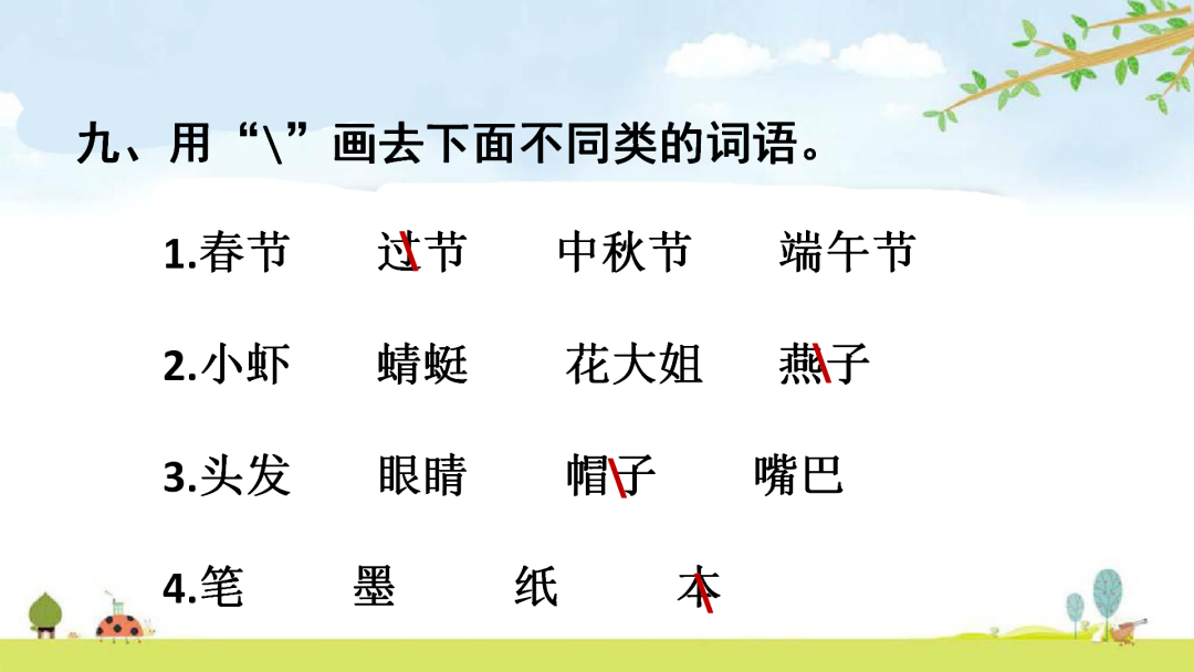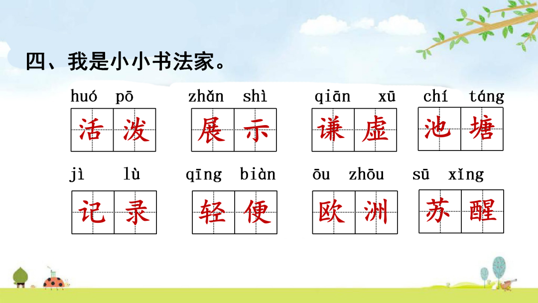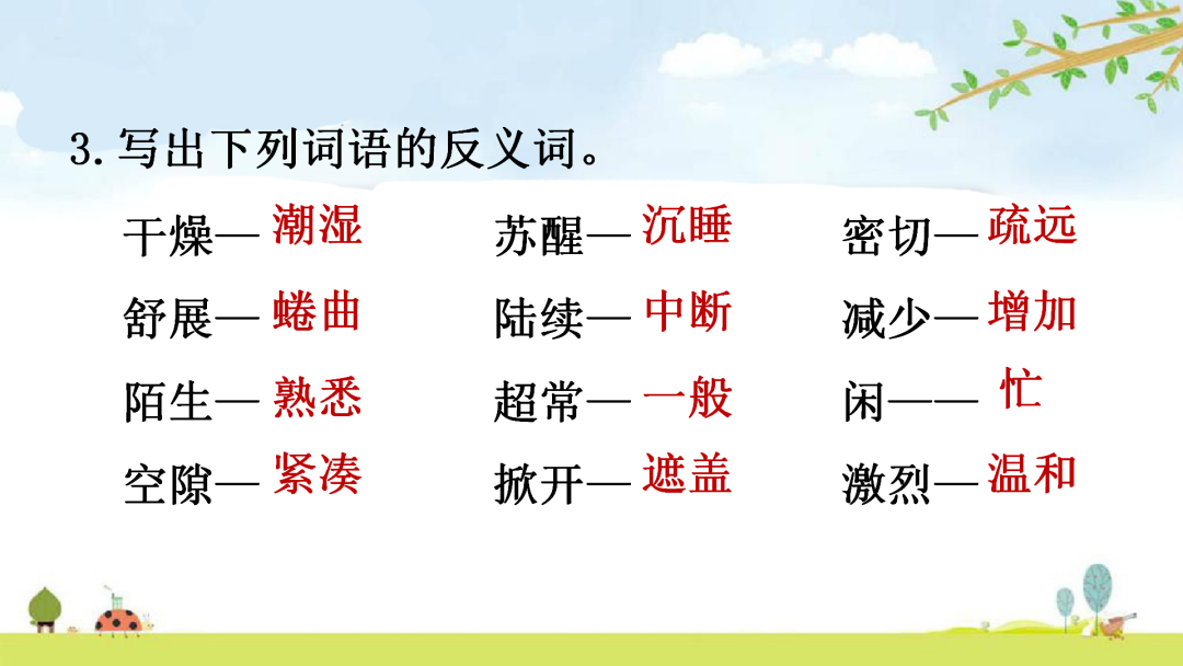 请收藏好以下图片预课资料(点击上图可观看视频及下载课件教案)下载电子版请拉到文末下载电子版请拉到文末下载电子版请拉到文末很多地区已经陆续进入期末复习阶段,对期末资料的需求日益加大,今天,小编老师分享给大家的是:部编版语文三年级下册期末复习资料(识字、组词、句子、看图写话等)可下载打印!需要此份资源的老师或家长建议领取~期末复习资料内容展示:资源内容概览部编三年级语文下册复习资料多音字组词:似sì(似乎)shì(似的) 纤qiān(光纤)xiān(纤细) 散 sàn(散步)sǎn(闲散) 挨 āi(挨挨挤挤) ái(挨打) 骨 gū(花骨朵儿) gǔ(骨头)为wéi(作为)wèi(为什么)折shé(折本)zhé(折断)朝zhāo(朝霞)cháo(王朝)盛shèng(盛开)chéng(盛东西)倒dǎo(跌倒)dào(倒茶)禁jìn(禁止)jīn(不禁)撒sǎ(撒落)sā(撒手)挣zhēng(挣扎)zhèng(挣脱)称chēng(称号)chèn(匀称)划huà(划分)huá(划船)难nàn(苦难)nán(难过) 应yīng(应该)yìng(应答)累lěi(积累)lèi(劳累) 鲜xiān(新鲜)xiǎn(朝鲜)爪zhǎo(前爪)zhuǎ(爪子) 济jǐ(济南)jì(同舟共济)便pián(便宜)biàn(便利)种zhǒng(种子)zhòng(种花)号háo(号叫)hào(记号)闷mèn(愁闷)mēn(闷热)都dū(首都)dōu(都是)背bēi(背东西)bèi(背部)长chánɡ(长短)zhǎng(长大)系jì(系鞋带)xì(关系)担dàn(挑担子)dān(担心)背bēi(背包)bèi(后背)撒sā(撒手)sǎ(撒化肥)扇shàn(扇子)shān(扇风)钻zuàn(电钻)zuān(钻洞)斗dǒu(一斗)dòu(战斗)处chù(好处)chǔ(处置)差chà(差劲)cī(参差不齐)和huò(和弄)huó(和面)薄bò(薄荷)bó(厚此薄彼)散sàn(散步)sǎn(散文)弹tán(弹琴)dàn(子弹)教jiào(教室)jiāo(教书)模mú(模样)mó(模型)降xiáng(投降)jiàng(降落)宁nìng(宁愿)níng(宁静) 参cēn (参差)shēn(人参)似shì(似的)sì(相似)卷juàn (卷子)juǎn(卷住)藏zànɡ(宝藏)cánɡ(收藏)嚷rǎnɡ(叫嚷)rānɡ(嚷嚷)旋xuán(旋涡)xuàn(旋风)涨zhǎnɡ(涨潮)zhànɡ(头昏脑涨)折shé (折了)zhé(折断)古诗三首:1. 《 绝 句 》作者( )( )代,( )( )江 山 丽,( )( )花草香。泥融( )燕子,沙暖( )鸳鸯。2.《 惠崇春江晚景 》作者( )( )代,竹外桃花( )( )枝,春江水暖( )先知。蒌蒿满地芦芽短,正是( )( )欲上时。3.《三衢道中》作者( )( )代,( )( )黄时日日晴,小溪泛尽( )山行。绿阴不( )来时路,添得( )( )四五声。燕子:1.一身( )的羽毛,一对( )的翅膀,加上( )似的尾巴,凑成了( ) 的 小 燕 子 。2.( )的草,( )的叶,( )的花,都像( )似的聚拢来,形成了( )的春天。小燕子从( )赶来,为春光增添了许多( )。在( )中,在( )中,燕子( )身子在天空中( ),唧唧地( ),有的由这边的( )( ),飞到了那边的( )下边;有的( )过湖面,尾尖偶尔( )了一下水面,就看到波纹( )地荡漾开去。3.几对燕子( )了,( )在电线上。( )的天空,( )之间连着( ),多么像( )!停着的燕子成了( ),( )了一支正待。4.二三月的春日里,轻风微微地吹拂着,如毛的( )由天上洒落着,千条万条的( ),红的白的黄的花,青的草,绿的叶,都像赶集似的聚拢来,形成了( )的春天。这时候,那些小燕子,那么( )的小燕子,也由南方飞来,加入了这个( )的图画中,为春光平添了许多生趣。5.小燕子带了它的双剪似的尾巴,在阳光满地时,斜飞于旷(kuà ng)亮无比的天空,叽的一声,已由这里的( )上,飞到那边的( )下了。荷花:1、荷叶( )的,像一个个碧绿的( )。白荷花在这些大圆盘之间( )出来。有的花瓣儿全展开了,露出嫩黄色的( )。有的还是( ),看起来( )得马上要( )似的。2、我忽然觉得自己仿佛就是一朵( )。一阵微风吹过来,我就( ),雪白的的衣裳( )。不光是我一朵,一池的荷花都在( )。风过了,我停止( ),( )站在那儿。( )飞过来,告诉我清早飞行的快乐。( )在脚下游过,告诉我昨夜的好梦......语文园地一:《 忆江南 》作者( )( )代江南好,风景旧曾( )。日出江花红胜( ),春来江( )如蓝,能不( )江南?《守株待兔》作者( )( )代,宋人有( )( )。田中有株。( )走触株,( )。因释(shì)其未(lěi)而守株,冀(jì)复得兔。兔不可复得,而身为( )笑。陶罐和铁罐:这篇( )故事讲的是国王御厨里的( )自恃( ),瞧不起( )。埋在土里许多年以后,陶罐( ),铁罐却( ),不复存在。表现铁罐的( )、( )和陶罐的( )、( )、( )的品格。故事告诉人们,每个人( ),要善于( ),正视( ),( ),( ) 。鹿腿和鹿角:1. 一头狮子正( )地向自己逼近。2.( )的长腿在灌木丛中( )。3. 两只( )的角差点送了我的命,可四条( )的腿却让我狮口逃生!语文园地二1、一棵高大的橡树像( ),挺立在路旁。2、蒲公英的花就像我们的( ),可以张开、合上。3、万壑树参天,( )。(王维)4、( ),阴阴夏木啭 黄 鹂。(王维)5、雨里鸡鸣一两家,( )。(王建)6、池上碧苔三四点,( )。(晏殊)7、( ),点水蜻蜓款款飞。(杜甫)古诗三首:1.《元 日》 作者( )( )代,( )( )声中一岁除,春风送暖入( )( )。千门万户( )( )日,总把( )( )换旧符。2.《清明》 作者( )( )代,( )( )时节雨纷纷,路上行人欲断魂。借问( )( )何处有,牧童遥指( )( )村。3.《九月九日忆山东兄弟》 作者( )( )代,独在( )( )为异客,每逢( )( )倍思亲。遥知( )( )登高处,遍插( )( )少一人。《九月九日忆山东兄弟》是一首抒写( )的千古绝唱,作者是( )代诗人( ),当时诗人在长安恰逢( )佳节倍感( ),非常( ),写出了“( , )”。纸的发明:古人看书需要用车拉,可以用__________这个成语来形容。原因是当时的书用竹简制作,重量太___,后来蔡伦发明了纸,这种纸可以用__________这个成语形容。造纸术发明以前,我们的祖先用刀把文字刻在________________上,或者铸刻在__________