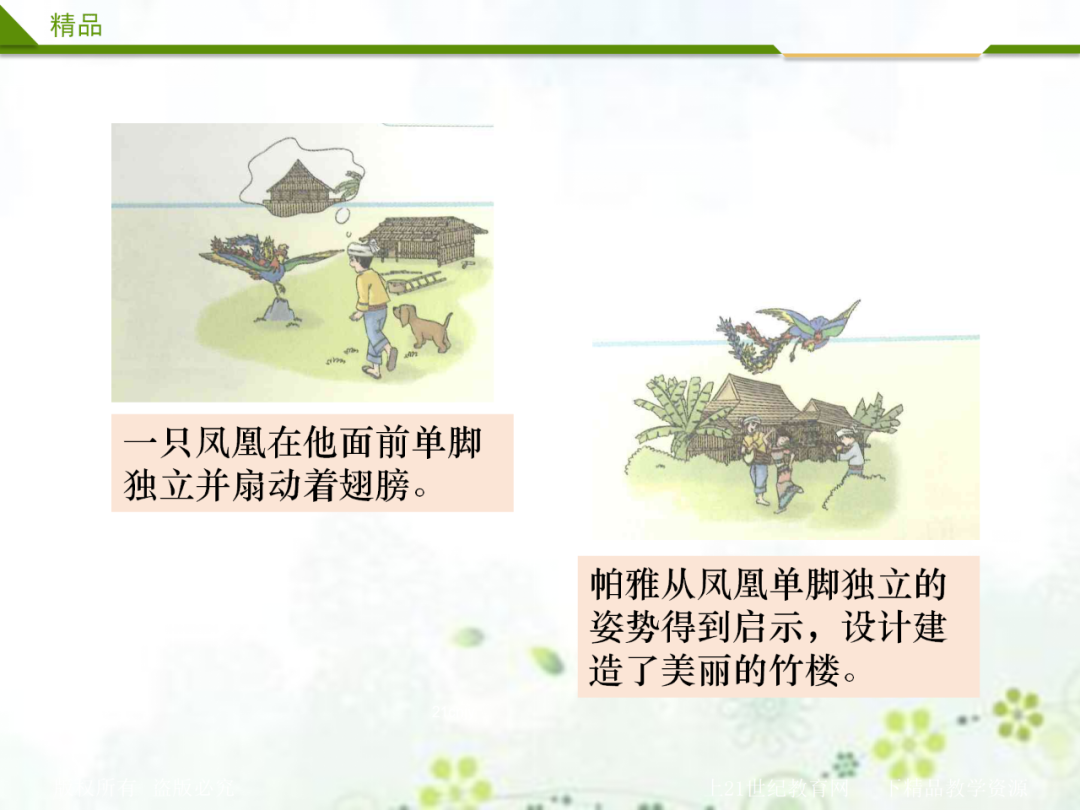 2、我的家乡在(云南),有(滇池)、(石林)、(抚仙湖)等美景。3、傣家竹楼,他见到雨水顺着(狗毛)向下流淌,便建出(坡形窝棚),从(凤凰)单脚独立的姿势得到启示,建造(竹楼)。