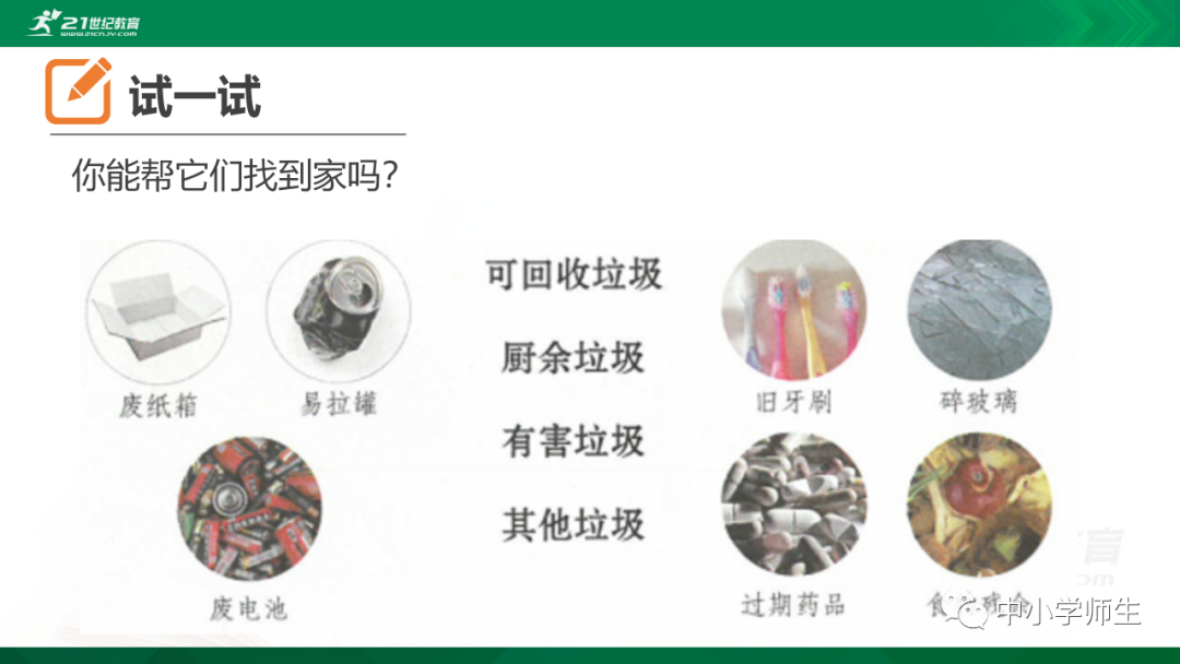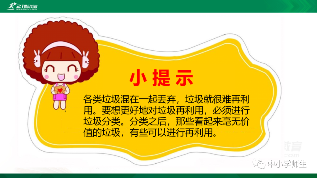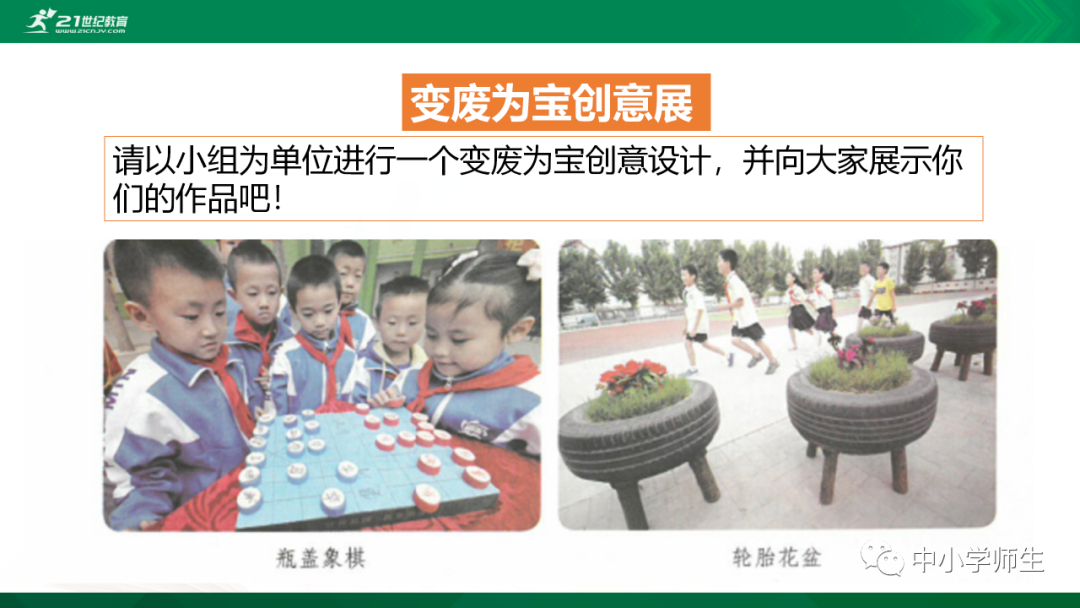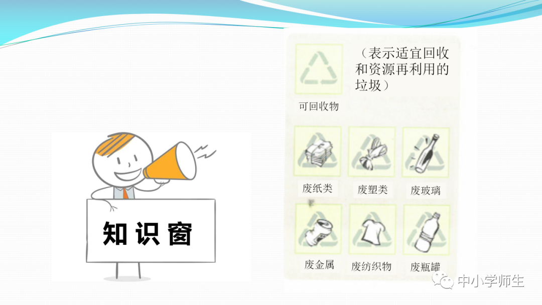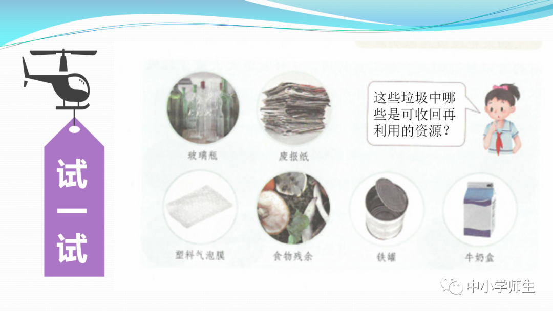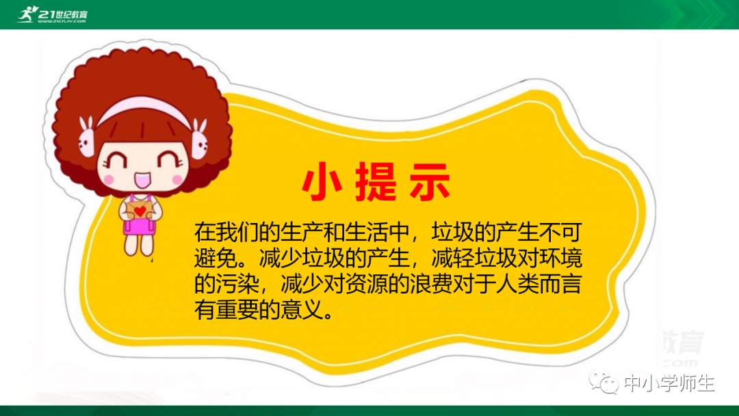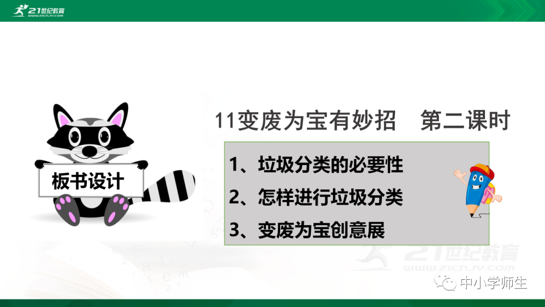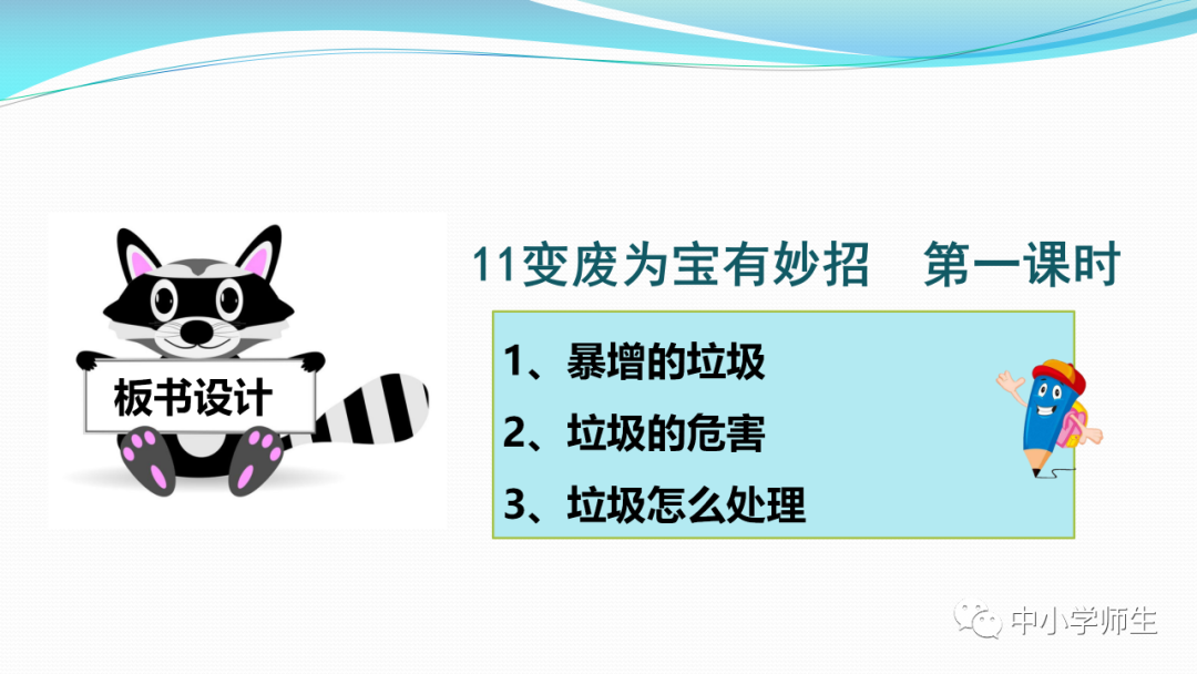 获取配套课件教案习题试卷请拉到文末微课讲解电子课本图文讲解教学设计11《变废为宝有妙招》教学设计教学目标知识与能力:1.引导学生了解生活中的4类垃圾,知道垃圾的危害,懂得垃圾中也蕴藏着丰富的资源,可以回收和再利用。2.引导学生懂得垃圾的分类及其意义,学会垃圾分类,发挥自己的创意使垃圾变废为宝。过程与方法:通过自身体验、观察、调查研究、阅读感悟、举办变废为宝创意展、讨论等活动教学,培养学生动手实践能力,培养学生环保意识。情感态度与价值观:培养学生环保意识。(三)教学重难点1.重点:让学生了解各种各样的垃圾对环境造成的危害,了解垃圾分类、回收的意义,能做到废品的再利用。2.难点:垃圾科学分类,树立环保意识。学情分析。四年级的学生处于从中年级向高年级的过渡期,他们经过前三年课程的学习,对垃圾污染感受较少,但对其危害性认识不够,没有垃圾分类,变废为宝的意识。再根据以上教材分析,为此,确定以下教学方法。教法和学法。1.教法:启发式、小组合作探究2.学法:自主学习法及活动与探究3.教学准备:教师制作PPT课件及搜集资料,学生课前准备好参与活动的资料教学过程。第一课时(一)导入。1.师出示各种垃圾图片,生认真观看体会。2.师:这些垃圾,你见过吗?你还见过哪些垃圾?(生自由回答)今天,老师就带领大家探究“垃圾”问题。板书课题(二)讲授新课目标导学一:暴增的垃圾活动与探究一:看一看,说一说(1)生阅读教材第80页内容(2)小组合作,探究问题☆你在哪里见过这些垃圾?☆你遇到这些垃圾会如何处理?(3)先在小组内交流,各组推荐代表,全班交流与分享(4)师小结。活动与探究二:看一看第81面的活动园(1)生阅读教材第81页内容(2)小组合作,探究问题☆你知道你们家一天会生产多少垃圾吗?☆根据上述材料你有何感想?(3)先在小组内交流,各组推荐代表,全班交流与分享(4)师小结。活动与探究三:看一看第82面的阅读窗。(1)生阅读教材第82页内容(2)小组合作,探究问题☆垃圾有哪些危害呢?☆看了上述材料,你有何敢想?(3)先在小组内交流,各组推荐代表,全班交流与分享(4)师小结:迅速超大了垃圾家族,其危害可不仅仅挤占我们的生存空间。活动与探究四:看一下第83面的知识窗。(1)生阅读教材第83页内容(2)小组合作,探究问题☆你会垃圾分类吗?☆下面哪些垃圾是可回收可再利用的资源?(3)先在小组内交流,各组推荐代表,全班交流与分享(4)师小结:多数废弃物中都有可再利用的宝贵资源,如果不充分利用,不仅危害环境,还会造成巨大的资源浪费。第二课时(一)谈话导入。(二)讲授新课。目标导学二:减少垃圾变废为宝活动与探究一:想一想(1)生阅读教材第84页内容(2)小组合作,探究问题☆在我们的日常生活中,我们需要怎样做才能减少垃圾污染?☆你有什么合适的方法吗?(3)先在小组内交流,各组推荐代表,全班交流与分享(4)师小结:如果把垃圾的源头就分类放置,有的可以直接在利用,有的可以加工再利用,这样就能大大减少垃圾的量,还能让很多垃圾变为资源?活动与探究二:看一看(1)生阅读教材第85页内容(2)小组合作,探究问题☆看到上述材料你有何感想?☆垃圾分类,有什么好处?(3)先在小组内交流,各组推荐代表,全班交流与分享(4)师小结:各种垃圾混合在一起丢,那就很难在利用,要想更好地对垃圾利润,就要进行垃圾分类。从那之后,那些看起来毫无价值的垃圾,有些却可以再利用。活动与探究三:看一看第86面的相关链接(1)生阅读教材第86页内容(2)小组合作,探究问题☆你能为你的生活周边想一个垃圾分类的好妙招吗?☆谈谈你对上述材料的想法?(3)先在小组内交流,各组推荐代表,全班交流与分享(4)生完成教材P86空格内容,师指导、补充活动与探究四:调查(1)生阅读教材第87页内容(2)小组合作,探究问题☆你能研究出以上三种方法吗?☆你会选择哪些废弃物进行分类再改造?(3)先在小组内交流,各组推荐代表,全班交流与分享(4)师小结:有些事物不是他们真的没用了,而是我没有发现在利用他们的方法。(三)师总结:了解了垃圾暴增的现状及危害,懂得垃圾分类、回收、再循环利用的意义。我们要节约资源和再利用资源,从小树立环保意识。板书设计。11.变废为宝有妙招暴增的垃圾:原因及危害措施:减少垃圾 变废为宝同步习题一、填空题1.生活垃圾、( )垃圾、( )垃圾、( )垃圾正在挤占我们宝贵的生存空间。2、目前,生活垃圾分为( )、( )、( )、( )四种。二、判断:1、东东认为各类垃圾混在一起丢弃真方便。( )2、深圳市推广生活垃圾分类率先从学校开始,从娃娃抓起。( )3、要想对垃圾再利用,必须进行垃圾分类。( )4、垃圾分类并不难,关键在于提高每个人对垃圾分类的认识。( )5、垃圾分类可以减轻垃圾对环境的污染,减少对资源的浪费。( )6、到超市购物都提倡自带购物袋,( )三、实战演练:对下列生活垃圾分类连线。【参考答案】一、填空:1、工业 医疗 建筑2、可回收垃圾 厨余垃圾 有害垃圾 其他垃圾 二、判断:1---------6 错对对对对对 三、连线:略怎么获取全册配套课件教案习题试卷等资料?▼领取方法1第一步:长按二维码关注教案课件资源网第二步:回复关键词:0004领取方法2▼打不开百度网盘链接的地区可长按扫码直接进入下载▼▼电脑端下载网址http://jazpan.com/box/595.html▼(回复关键词位置如下图所示)图文来自网络,版权归原作者,