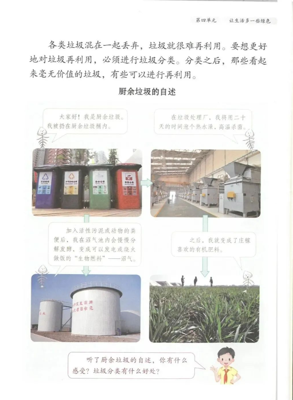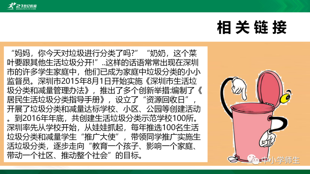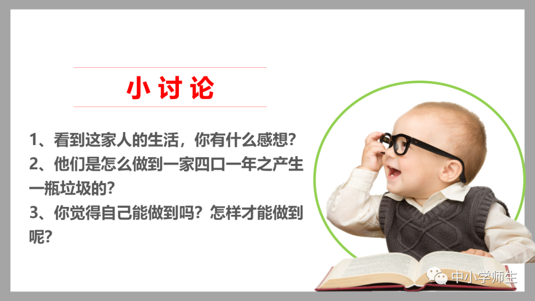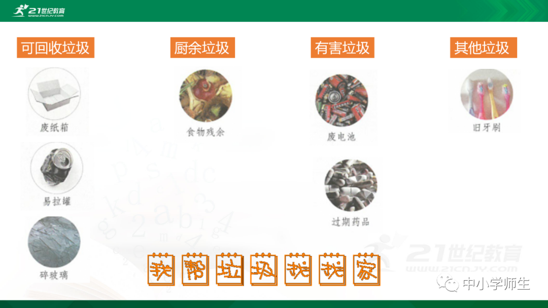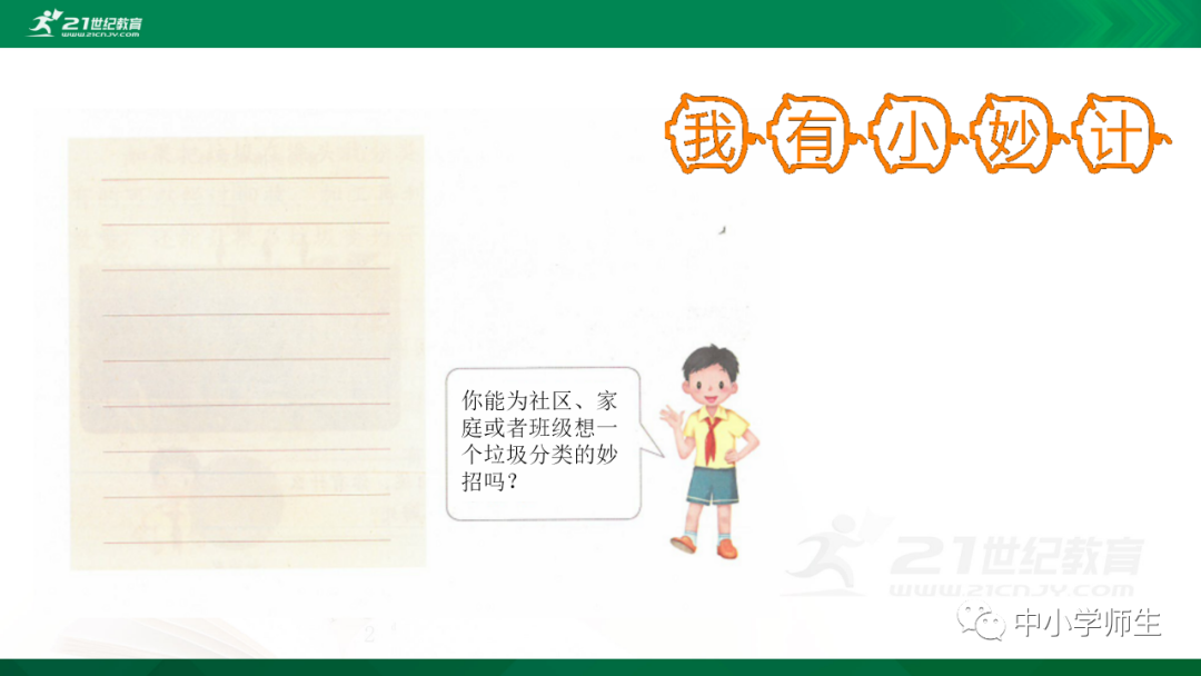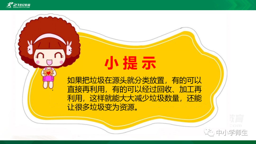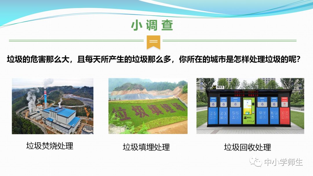 获取配套课件教案习题试卷请拉到文末微课讲解电子课本图文讲解教学设计11《变废为宝有妙招》教学设计教学目标知识与能力:1.引导学生了解生活中的4类垃圾,知道垃圾的危害,懂得垃圾中也蕴藏着丰富的资源,可以回收和再利用。2.引导学生懂得垃圾的分类及其意义,学会垃圾分类,发挥自己的创意使垃圾变废为宝。过程与方法:通过自身体验、观察、调查研究、阅读感悟、举办变废为宝创意展、讨论等活动教学,培养学生动手实践能力,培养学生环保意识。情感态度与价值观:培养学生环保意识。(三)教学重难点1.重点:让学生了解各种各样的垃圾对环境造成的危害,了解垃圾分类、回收的意义,能做到废品的再利用。2.难点:垃圾科学分类,树立环保意识。学情分析。四年级的学生处于从中年级向高年级的过渡期,他们经过前三年课程的学习,对垃圾污染感受较少,但对其危害性认识不够,没有垃圾分类,变废为宝的意识。再根据以上教材分析,为此,确定以下教学方法。教法和学法。1.教法:启发式、小组合作探究2.学法:自主学习法及活动与探究3.教学准备:教师制作PPT课件及搜集资料,学生课前准备好参与活动的资料教学过程。第一课时(一)导入。1.师出示各种垃圾图片,生认真观看体会。2.师:这些垃圾,你见过吗?你还见过哪些垃圾?(生自由回答)今天,老师就带领大家探究“垃圾”问题。板书课题(二)讲授新课目标导学一:暴增的垃圾活动与探究一:看一看,说一说(1)生阅读教材第80页内容(2)小组合作,探究问题☆你在哪里见过这些垃圾?☆你遇到这些垃圾会如何处理?(3)先在小组内交流,各组推荐代表,全班交流与分享(4)师小结。活动与探究二:看一看第81面的活动园(1)生阅读教材第81页内容(2)小组合作,探究问题☆你知道你们家一天会生产多少垃圾吗?☆根据上述材料你有何感想?(3)先在小组内交流,各组推荐代表,全班交流与分享(4)师小结。活动与探究三:看一看第82面的阅读窗。(1)生阅读教材第82页内容(2)小组合作,探究问题☆垃圾有哪些危害呢?☆看了上述材料,你有何敢想?(3)先在小组内交流,各组推荐代表,全班交流与分享(4)师小结:迅速超大了垃圾家族,其危害可不仅仅挤占我们的生存空间。活动与探究四:看一下第83面的知识窗。(1)生阅读教材第83页内容(2)小组合作,探究问题☆你会垃圾分类吗?☆下面哪些垃圾是可回收可再利用的资源?(3)先在小组内交流,各组推荐代表,全班交流与分享(4)师小结:多数废弃物中都有可再利用的宝贵资源,如果不充分利用,不仅危害环境,还会造成巨大的资源浪费。第二课时(一)谈话导入。(二)讲授新课。目标导学二:减少垃圾变废为宝活动与探究一:想一想(1)生阅读教材第84页内容(2)小组合作,探究问题☆在我们的日常生活中,我们需要怎样做才能减少垃圾污染?☆你有什么合适的方法吗?(3)先在小组内交流,各组推荐代表,全班交流与分享(4)师小结:如果把垃圾的源头就分类放置,有的可以直接在利用,有的可以加工再利用,这样就能大大减少垃圾的量,还能让很多垃圾变为资源?活动与探究二:看一看(1)生阅读教材第85页内容(2)小组合作,探究问题☆看到上述材料你有何感想?☆垃圾分类,有什么好处?(3)先在小组内交流,各组推荐代表,全班交流与分享(4)师小结:各种垃圾混合在一起丢,那就很难在利用,要想更好地对垃圾利润,就要进行垃圾分类。从那之后,那些看起来毫无价值的垃圾,有些却可以再利用。活动与探究三:看一看第86面的相关链接(1)生阅读教材第86页内容(2)小组合作,探究问题☆你能为你的生活周边想一个垃圾分类的好妙招吗?☆谈谈你对上述材料的想法?(3)先在小组内交流,各组推荐代表,全班交流与分享(4)生完成教材P86空格内容,师指导、补充活动与探究四:调查(1)生阅读教材第87页内容(2)小组合作,探究问题☆你能研究出以上三种方法吗?☆你会选择哪些废弃物进行分类再改造?(3)先在小组内交流,各组推荐代表,全班交流与分享(4)师小结:有些事物不是他们真的没用了,而是我没有发现在利用他们的方法。(三)师总结:了解了垃圾暴增的现状及危害,懂得垃圾分类、回收、再循环利用的意义。我们要节约资源和再利用资源,从小树立环保意识。板书设计。11.变废为宝有妙招暴增的垃圾:原因及危害措施:减少垃圾 变废为宝同步习题一、填空题1.生活垃圾、( )垃圾、( )垃圾、( )垃圾正在挤占我们宝贵的生存空间。2、目前,生活垃圾分为( )、( )、( )、( )四种。二、判断:1、东东认为各类垃圾混在一起丢弃真方便。( )2、深圳市推广生活垃圾分类率先从学校开始,从娃娃抓起。( )3、要想对垃圾再利用,必须进行垃圾分类。( )4、垃圾分类并不难,关键在于提高每个人对垃圾分类的认识。( )5、垃圾分类可以减轻垃圾对环境的污染,减少对资源的浪费。( )6、到超市购物都提倡自带购物袋,( )三、实战演练:对下列生活垃圾分类连线。【参考答案】一、填空:1、工业 医疗 建筑2、可回收垃圾 厨余垃圾 有害垃圾 其他垃圾 二、判断:1---------6 错对对对对对 三、连线:略怎么获取全册配套课件教案习题试卷等资料?▼领取方法1第一步:长按二维码关注教案课件资源网第二步:回复关键词:0004领取方法2▼打不开百度网盘链接的地区可长按扫码直接进入下载▼▼电脑端下载网址http://jazpan.com/box/595.html▼(回复关键词位置如下图所示)图文来自网络,版权归原作者,