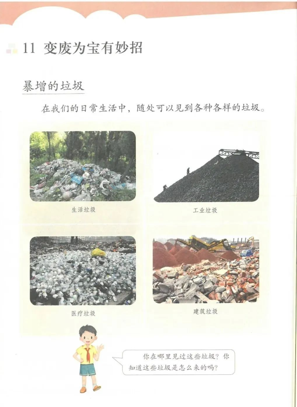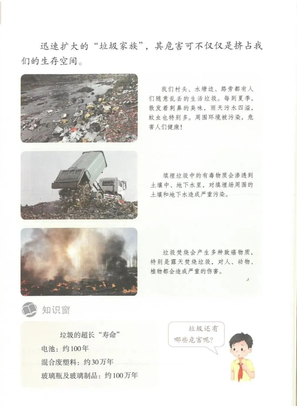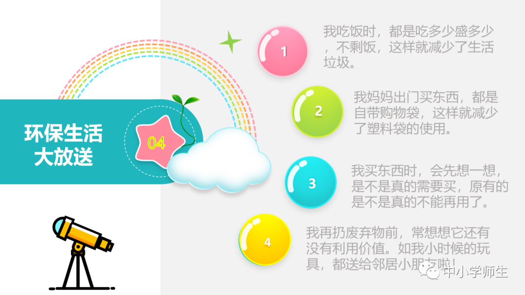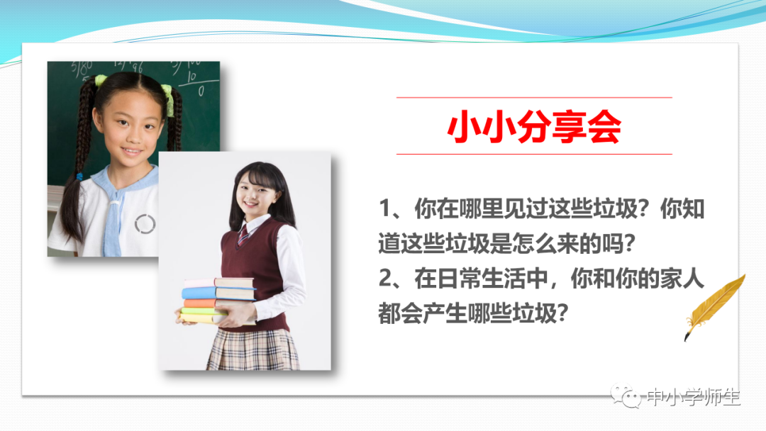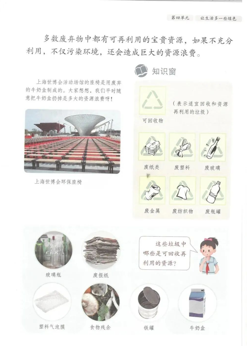 获取配套课件教案习题试卷请拉到文末微课讲解电子课本图文讲解教学设计11《变废为宝有妙招》教学设计教学目标知识与能力:1.引导学生了解生活中的4类垃圾,知道垃圾的危害,懂得垃圾中也蕴藏着丰富的资源,可以回收和再利用。2.引导学生懂得垃圾的分类及其意义,学会垃圾分类,发挥自己的创意使垃圾变废为宝。过程与方法:通过自身体验、观察、调查研究、阅读感悟、举办变废为宝创意展、讨论等活动教学,培养学生动手实践能力,培养学生环保意识。情感态度与价值观:培养学生环保意识。(三)教学重难点1.重点:让学生了解各种各样的垃圾对环境造成的危害,了解垃圾分类、回收的意义,能做到废品的再利用。2.难点:垃圾科学分类,树立环保意识。学情分析。四年级的学生处于从中年级向高年级的过渡期,他们经过前三年课程的学习,对垃圾污染感受较少,但对其危害性认识不够,没有垃圾分类,变废为宝的意识。再根据以上教材分析,为此,确定以下教学方法。教法和学法。1.教法:启发式、小组合作探究2.学法:自主学习法及活动与探究3.教学准备:教师制作PPT课件及搜集资料,学生课前准备好参与活动的资料教学过程。第一课时(一)导入。1.师出示各种垃圾图片,生认真观看体会。2.师:这些垃圾,你见过吗?你还见过哪些垃圾?(生自由回答)今天,老师就带领大家探究“垃圾”问题。板书课题(二)讲授新课目标导学一:暴增的垃圾活动与探究一:看一看,说一说(1)生阅读教材第80页内容(2)小组合作,探究问题☆你在哪里见过这些垃圾?☆你遇到这些垃圾会如何处理?(3)先在小组内交流,各组推荐代表,全班交流与分享(4)师小结。活动与探究二:看一看第81面的活动园(1)生阅读教材第81页内容(2)小组合作,探究问题☆你知道你们家一天会生产多少垃圾吗?☆根据上述材料你有何感想?(3)先在小组内交流,各组推荐代表,全班交流与分享(4)师小结。活动与探究三:看一看第82面的阅读窗。(1)生阅读教材第82页内容(2)小组合作,探究问题☆垃圾有哪些危害呢?☆看了上述材料,你有何敢想?(3)先在小组内交流,各组推荐代表,全班交流与分享(4)师小结:迅速超大了垃圾家族,其危害可不仅仅挤占我们的生存空间。活动与探究四:看一下第83面的知识窗。(1)生阅读教材第83页内容(2)小组合作,探究问题☆你会垃圾分类吗?☆下面哪些垃圾是可回收可再利用的资源?(3)先在小组内交流,各组推荐代表,全班交流与分享(4)师小结:多数废弃物中都有可再利用的宝贵资源,如果不充分利用,不仅危害环境,还会造成巨大的资源浪费。第二课时(一)谈话导入。(二)讲授新课。目标导学二:减少垃圾变废为宝活动与探究一:想一想(1)生阅读教材第84页内容(2)小组合作,探究问题☆在我们的日常生活中,我们需要怎样做才能减少垃圾污染?☆你有什么合适的方法吗?(3)先在小组内交流,各组推荐代表,全班交流与分享(4)师小结:如果把垃圾的源头就分类放置,有的可以直接在利用,有的可以加工再利用,这样就能大大减少垃圾的量,还能让很多垃圾变为资源?活动与探究二:看一看(1)生阅读教材第85页内容(2)小组合作,探究问题☆看到上述材料你有何感想?☆垃圾分类,有什么好处?(3)先在小组内交流,各组推荐代表,全班交流与分享(4)师小结:各种垃圾混合在一起丢,那就很难在利用,要想更好地对垃圾利润,就要进行垃圾分类。从那之后,那些看起来毫无价值的垃圾,有些却可以再利用。活动与探究三:看一看第86面的相关链接(1)生阅读教材第86页内容(2)小组合作,探究问题☆你能为你的生活周边想一个垃圾分类的好妙招吗?☆谈谈你对上述材料的想法?(3)先在小组内交流,各组推荐代表,全班交流与分享(4)生完成教材P86空格内容,师指导、补充活动与探究四:调查(1)生阅读教材第87页内容(2)小组合作,探究问题☆你能研究出以上三种方法吗?☆你会选择哪些废弃物进行分类再改造?(3)先在小组内交流,各组推荐代表,全班交流与分享(4)师小结:有些事物不是他们真的没用了,而是我没有发现在利用他们的方法。(三)师总结:了解了垃圾暴增的现状及危害,懂得垃圾分类、回收、再循环利用的意义。我们要节约资源和再利用资源,从小树立环保意识。板书设计。11.变废为宝有妙招暴增的垃圾:原因及危害措施:减少垃圾 变废为宝同步习题一、填空题1.生活垃圾、( )垃圾、( )垃圾、( )垃圾正在挤占我们宝贵的生存空间。2、目前,生活垃圾分为( )、( )、( )、( )四种。二、判断:1、东东认为各类垃圾混在一起丢弃真方便。( )2、深圳市推广生活垃圾分类率先从学校开始,从娃娃抓起。( )3、要想对垃圾再利用,必须进行垃圾分类。( )4、垃圾分类并不难,关键在于提高每个人对垃圾分类的认识。( )5、垃圾分类可以减轻垃圾对环境的污染,减少对资源的浪费。( )6、到超市购物都提倡自带购物袋,( )三、实战演练:对下列生活垃圾分类连线。【参考答案】一、填空:1、工业 医疗 建筑2、可回收垃圾 厨余垃圾 有害垃圾 其他垃圾 二、判断:1---------6 错对对对对对 三、连线:略怎么获取全册配套课件教案习题试卷等资料?▼领取方法1第一步:长按二维码关注教案课件资源网第二步:回复关键词:0004领取方法2▼打不开百度网盘链接的地区可长按扫码直接进入下载▼▼电脑端下载网址http://jazpan.com/box/595.html▼(回复关键词位置如下图所示)图文来自网络,版权归原作者,