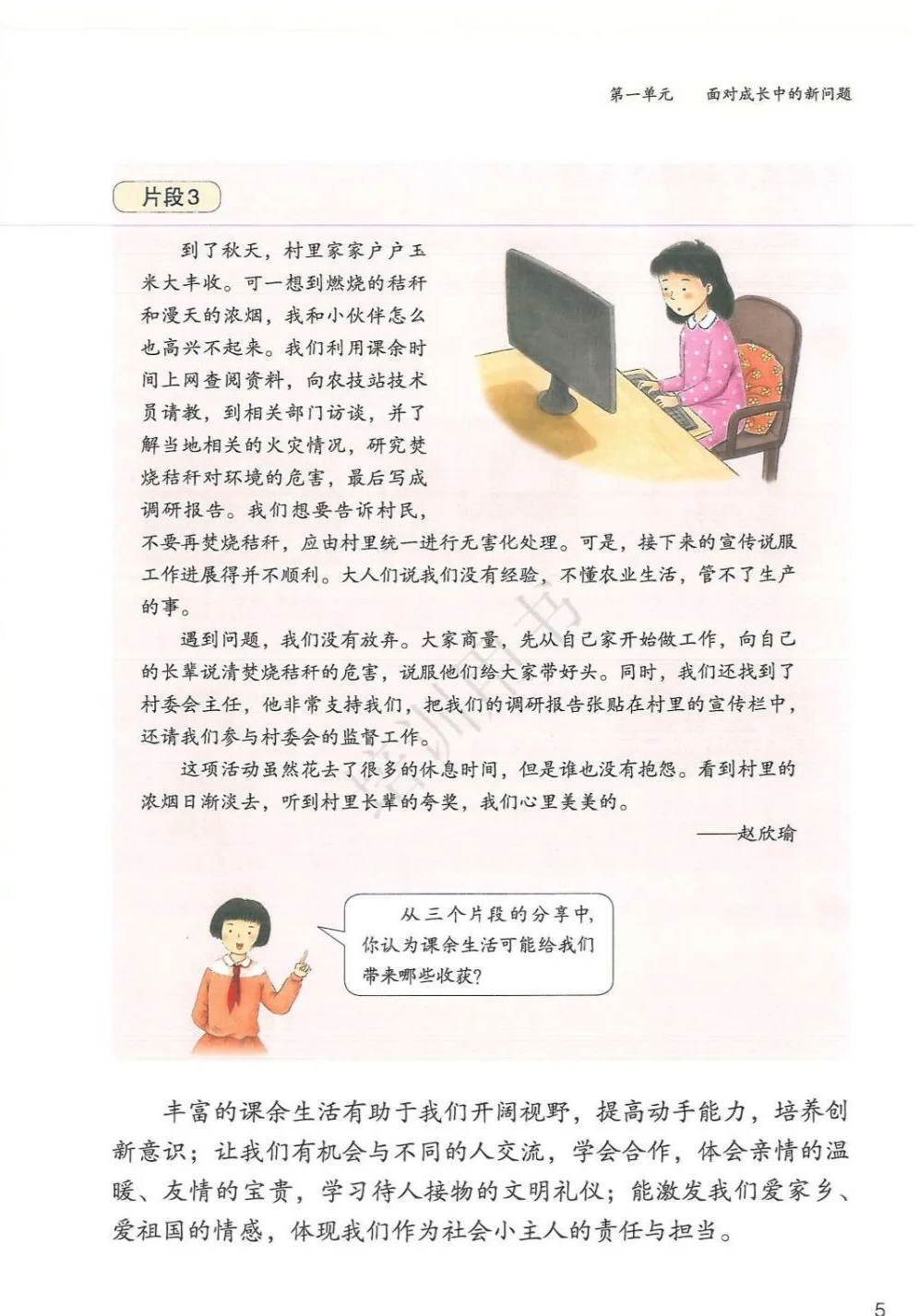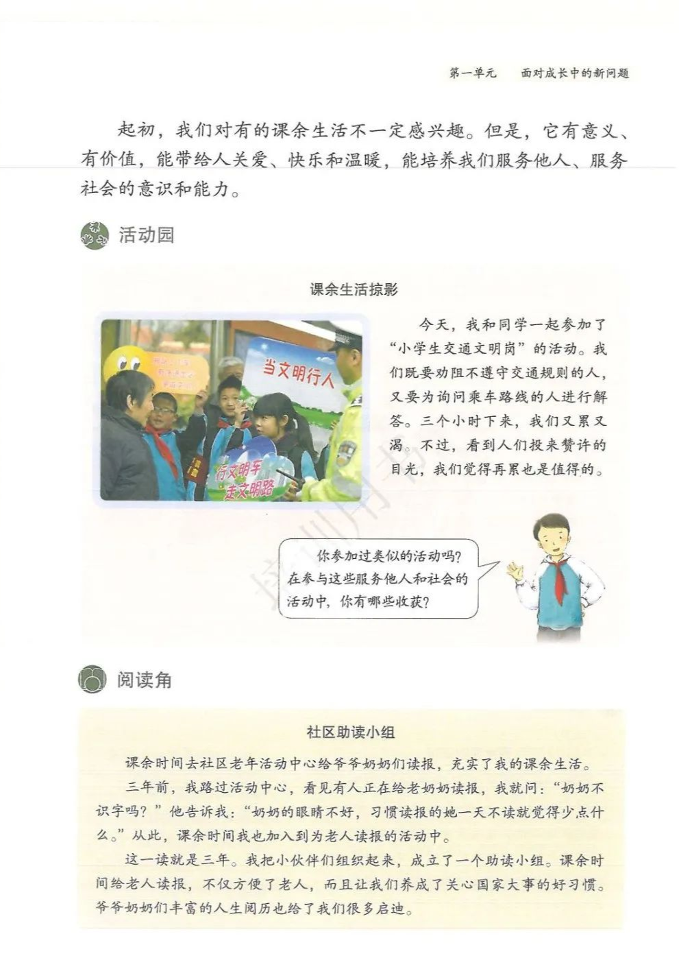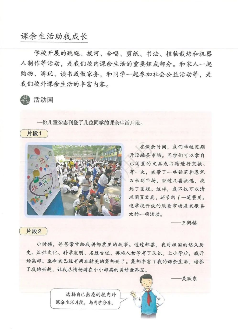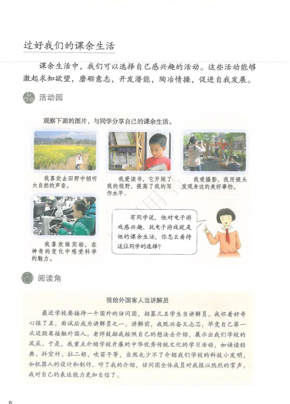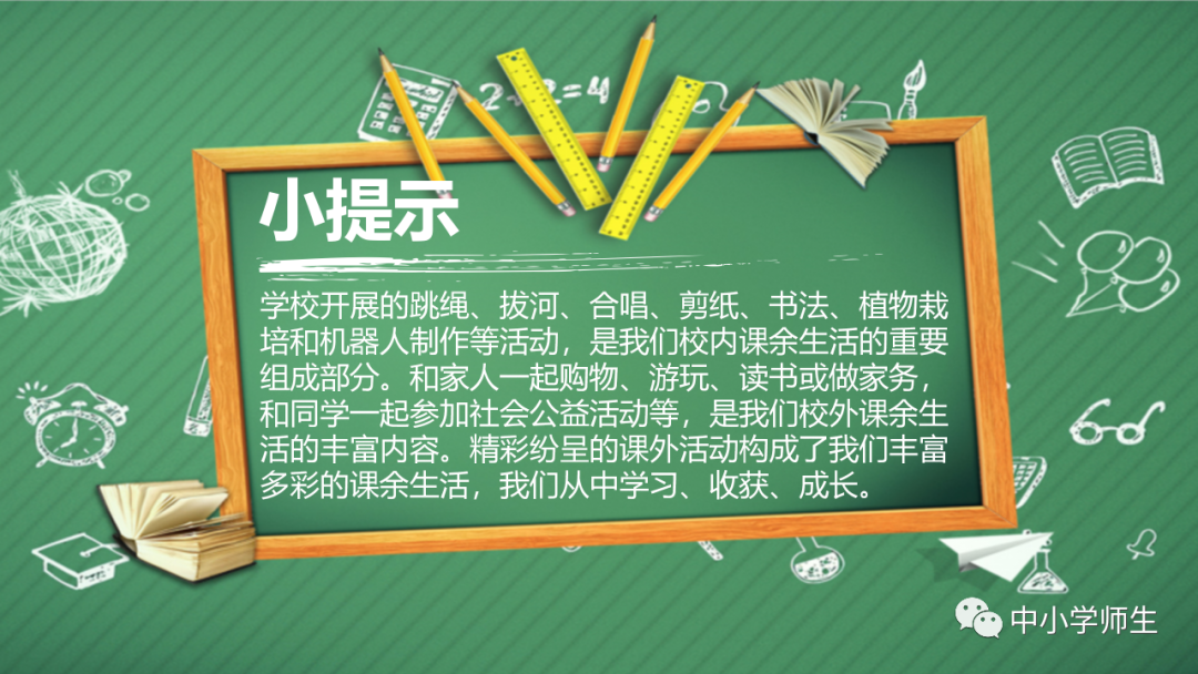 4. 学校开展的跳绳、拔河、合唱、剪纸、书法、植物栽培和机器人制作等活动,是我们校内课余生活的重要组成部分。和家人一起购物、游玩、读书或做家务,和同学一起参加社会公益活动等,是我们校外课余生活的丰富内容。