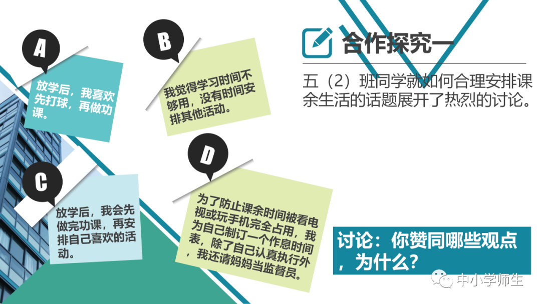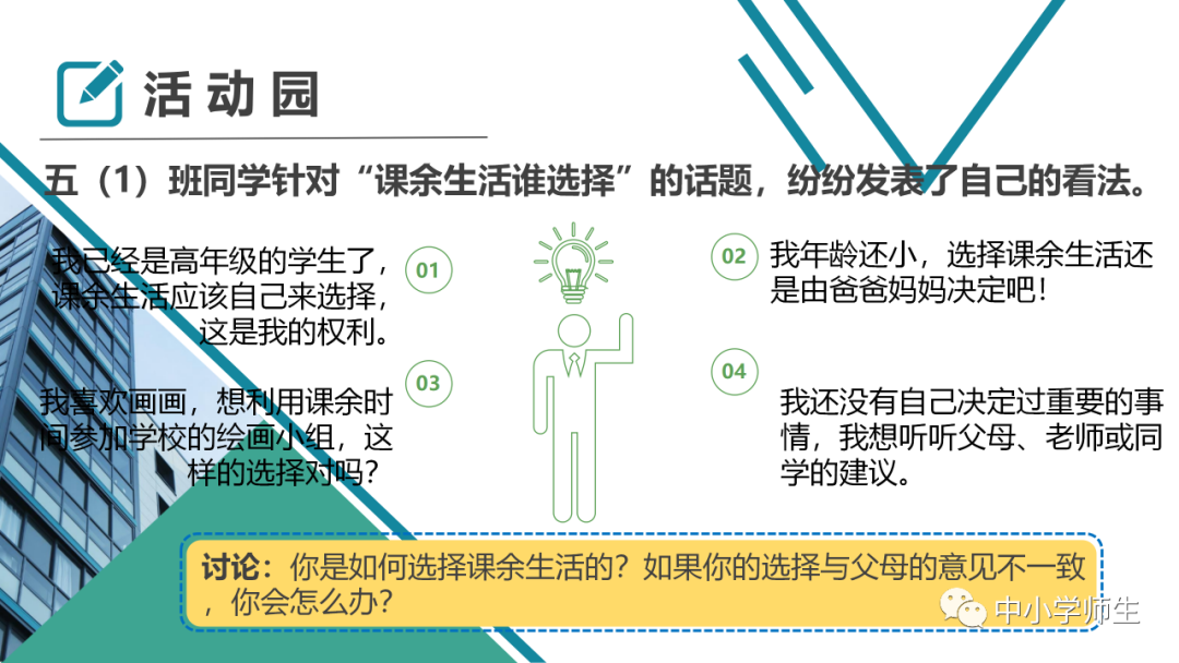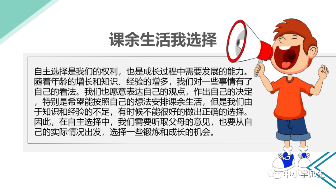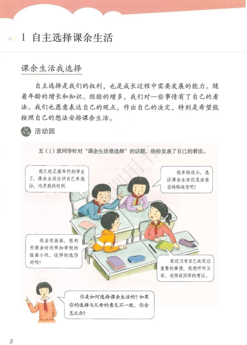 1.自主选择课余生活是我们的权利,也是成长过程中需要发展的能力。随着年龄的增长和知识、经验的增多,我们对一些事情有了自己的看法。我们也愿意表达自己的观点,做出自己的决定,特别是希望按照自己的想法安排课余生活。
