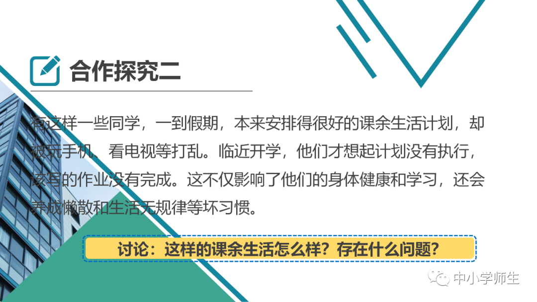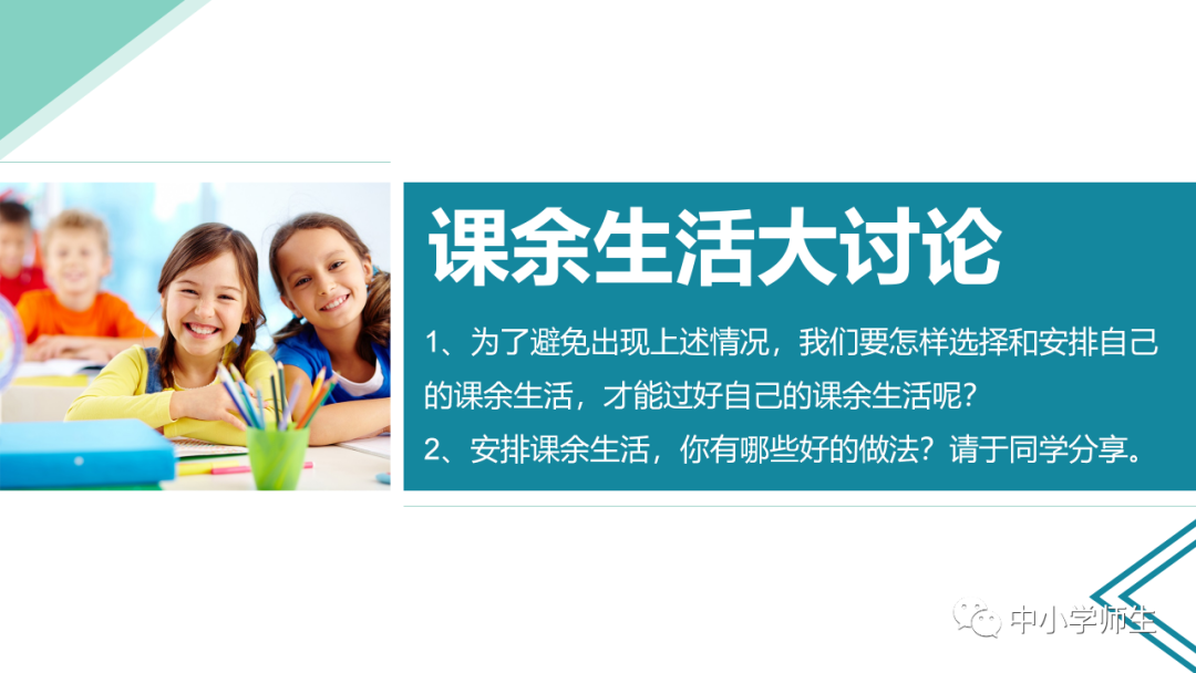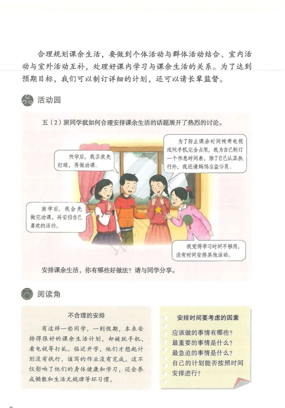 3. 小结:合理规划课余生活,要做到个体活动和群体活动结合、室内活动与室外活动互补,处理好课内学习与课余生活的关系。