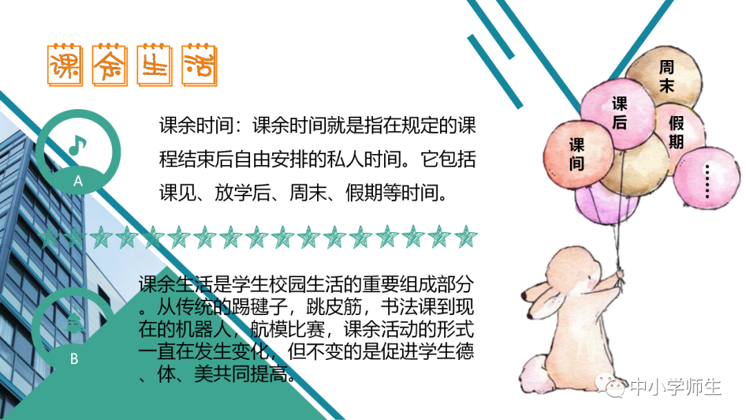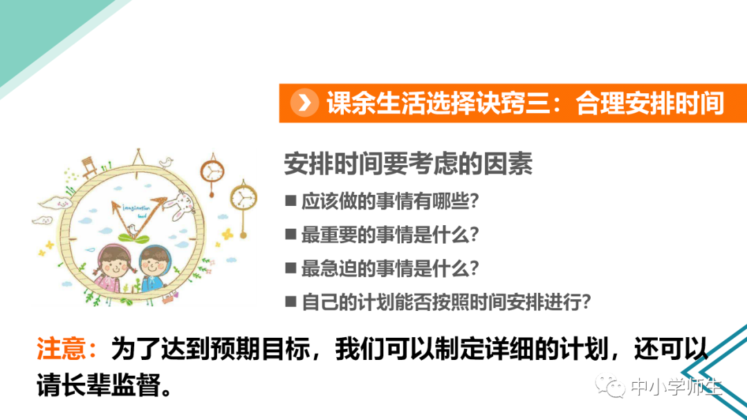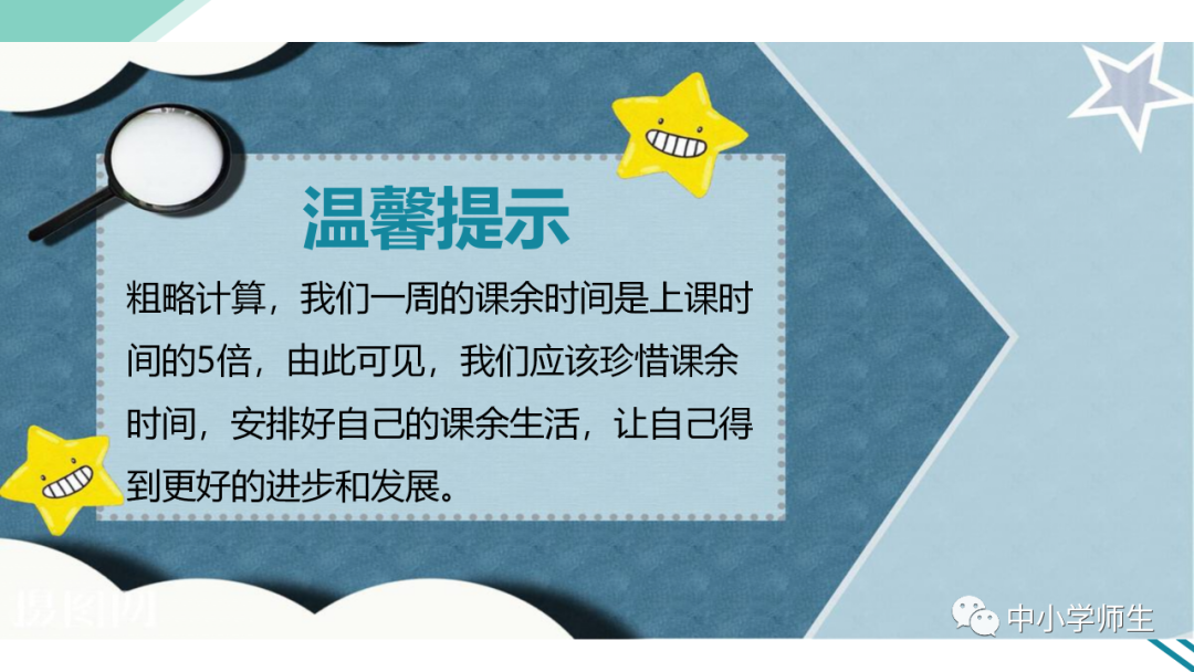 5.温馨提示:粗略计算,我们一周的课余时间是上课时间的5倍!由此可见我们应该珍惜课余时间安排好自己的课余生活让自己得到更好的进步和发展。