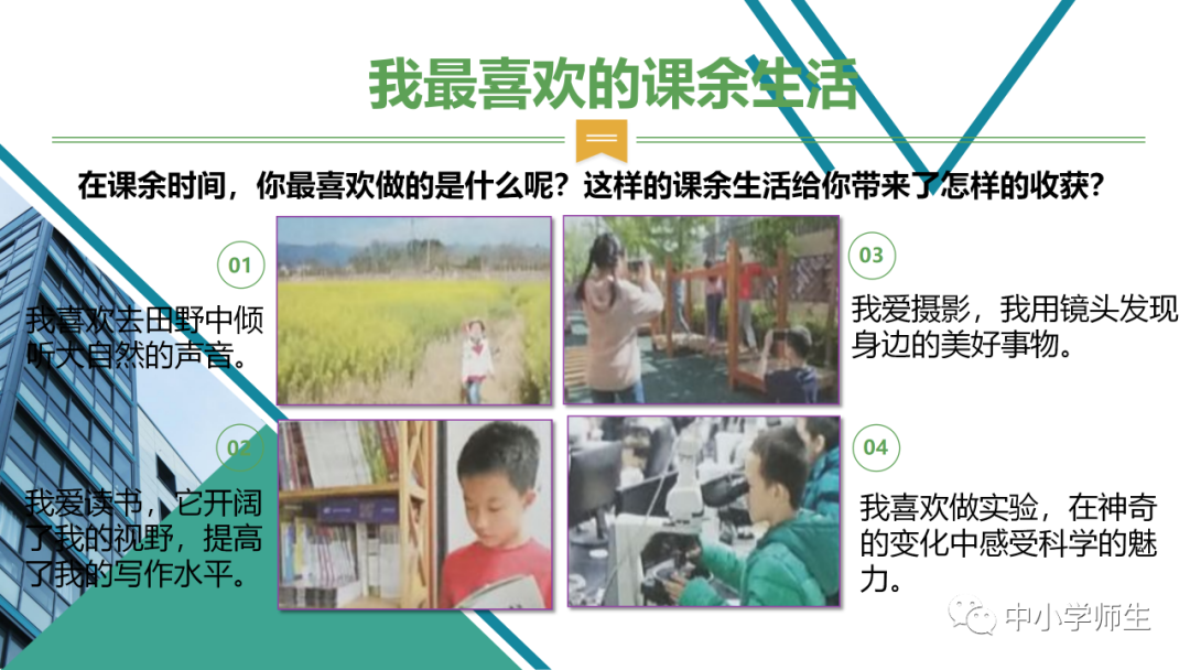 小结:丰富的课余生活有助于我们开阔视野,提高动手能力,培养创新意识;让我们有机会与不同的人交流,学会合作,体会亲情的温暖、友情的宝贵,学习待人接物的文明礼仪;能激发我们爱家乡、爱祖国的情感,体现我们作为社会小主人的责任与担当。