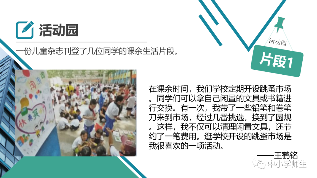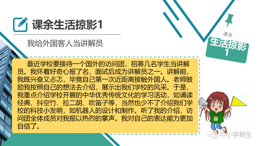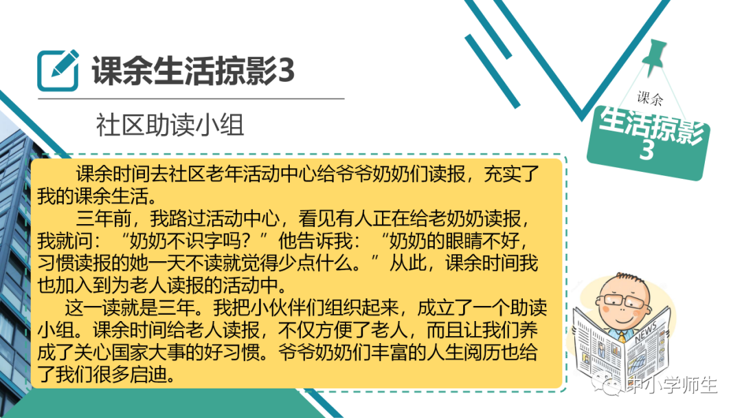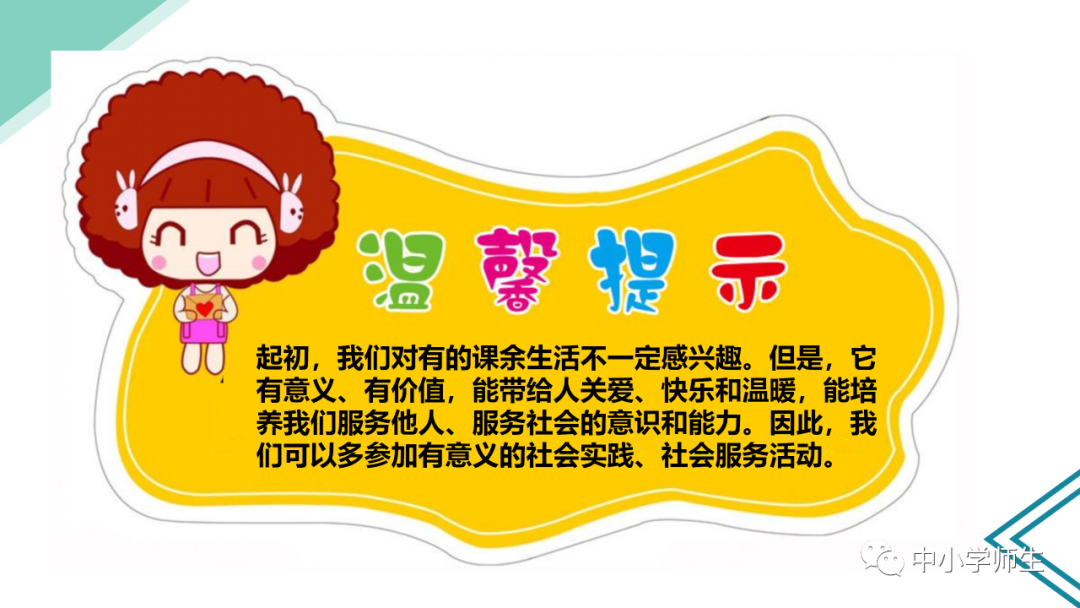 小结:起初,我们对有的课余生活不一定感兴趣。但是,它有意义、有价值,能带给人关爱、快乐和温暖,能培养我们服务他人、服务社会的意识和能力。雪花老师小学资料微信制作:x3481913332