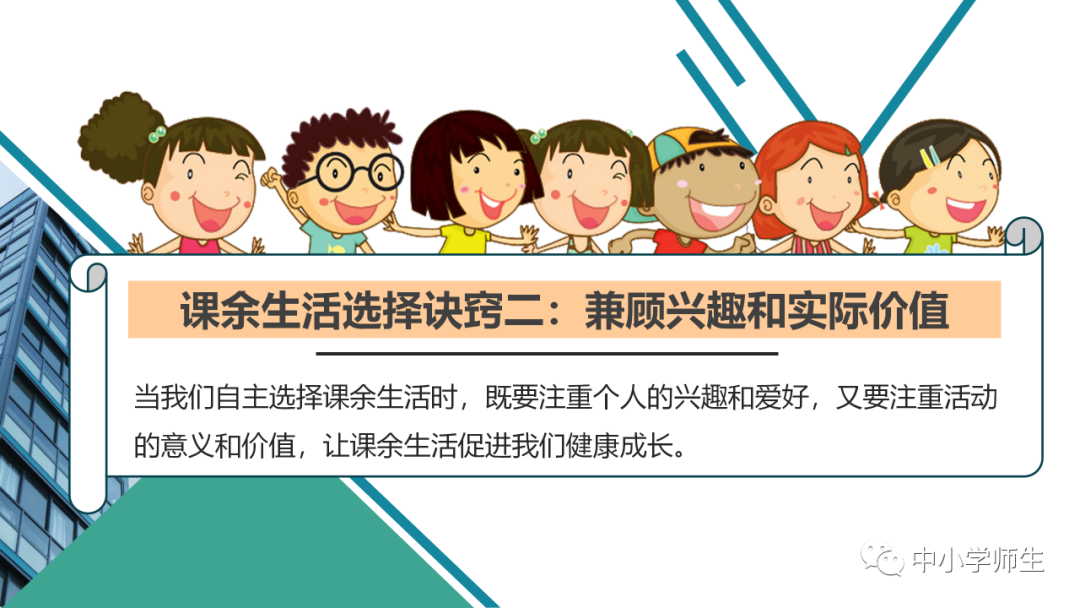 2、当我们自主选择课余生活时,既要注重个人的兴趣和爱好,又要注重活