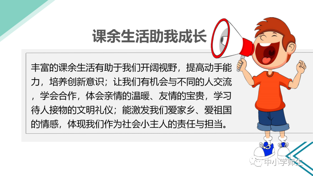 5. 丰富的课余生活的意义: 丰富的课余生活,有助于我们(1)开阔视野,提高动手能力,培养创新意识;(2)让我们有机会与不同的人交流,学会合作,体会亲情的温暖,友谊的宝贵,学习待人接物的文明礼仪;(3)能激发我们爱家乡,爱祖国的情感,体现我们作为社会小主人的责任与担当。