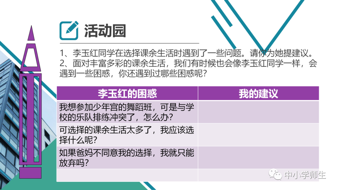 2.过渡:面对丰富多彩的课余生活,我们有时候会遇到一些困惑,需要我们开动脑筋,合理选择。李玉红同学在选择课余生活时就遇到了一些问题。你遇到过类似的困惑吗?请你为她提出合理的建议。(课件出示第三页的活动园。)