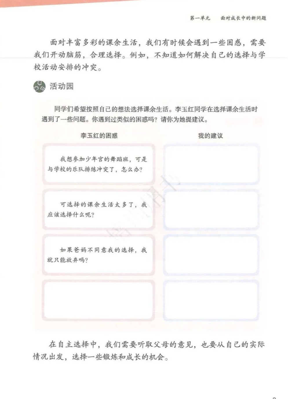 2. 面对丰富多彩的课余生活,我们有时候会遇到一些困惑,需要我们开动脑筋,合理选择。例如不知道如何解决自己的选择与学校活动安排的冲突。