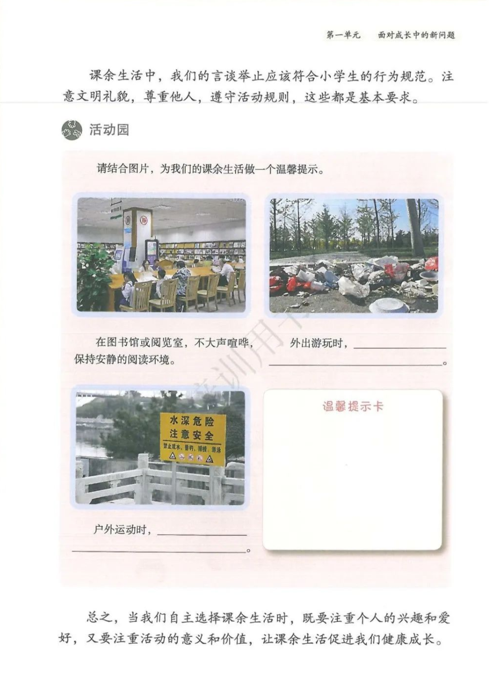 1.结合课本第9页活动园,为我们的课余生活做一个温馨提示。