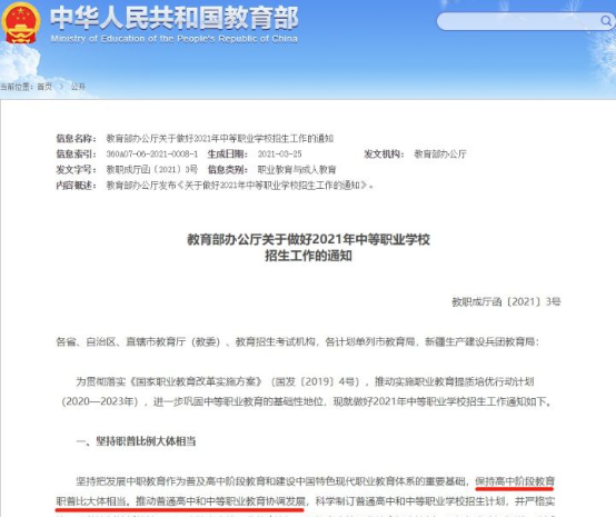甚至好多人觉得,中考也会影响孩子能不能上一个好大学,这也使得不少家长越来越焦虑,尤其是关于不允许初三复读的消息,让家长倍感焦虑, 对此官方给出了回应。社会上关于中考改革政策的传言不少,多数都是关于高中录取比例的情况。相关部分作出了相应的调整,普高和中职录取人数严格控制在5:5,也就是意味着,中考结束后,近半数的初中生上不了普通高中,将去到职高念书。保持高中阶段教育职普大体相当,目的是推动普通高中和中等职业教育协调发展。而那些中考落榜生,是允许在初三复读的,这一点针对的是公办的中学或高中,中考落榜生如果想复读,可以选择去到私立学校,不过学费也是一笔不小的支出。尽管如此,不少家长悬着的心,还是没有放下,因为按照现在的大趋势,考取普通高中的难度还是很大。但是大部分家长对于职高的偏见还是不小,能上普通高中是坚决不会让孩子去职高的。