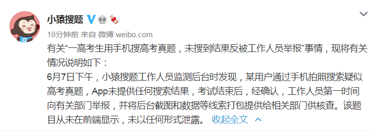 6月7日,2021年高考启幕。全国1078万高考生终于迎来了检验自己三年拼搏成果的时候。但就在7日开考当日,“一高考生用手机搜高考真题,未搜到结果反被工作人员举报”的事件,引发众多网友关注。武汉市黄陂区教育局8日通报称,确认考生吴某某违规携带手机进入考场拍摄试卷事实。已对违规考生作出取消此次考试资格,其所报名参加考试的各阶段、各科成绩无效的处理。6月7日,有网友爆料称,在下午的数学考场上有考生疑似将2021年全国新高考一卷数学卷拍照上传至小猿搜题APP上,被小猿搜题APP工作人员发现后截图举报。网传截图显示,上传的数学试卷截图左上角出现了考生名字吴某某与座位号24。上方显示时间为2021年6月7日15时46分,此时距离高考数学结束时间还有1小时14分。8日,@小猿搜题 在微博回应表示:App未提供任何搜索结果。工作人员第一时间向有关部门举报,并将后台截图和数据等线索打包提供给相关部门供核查。有关“一高考生用手机搜高考真题,未搜到结果反被工作人员举报”事情,现将有关情况说明如下:6月7日下午,小猿搜题工作人员监测后台时发现,某用户通过手机拍照搜索疑似高考真题,App未提供任何搜索结果,考试结束后,经确认,工作人员第一时间向有关部门举报,并将后台截图和数据等线索打包提供给相关部门供核查。该题目从未在前端显示,未以任何形式泄露。