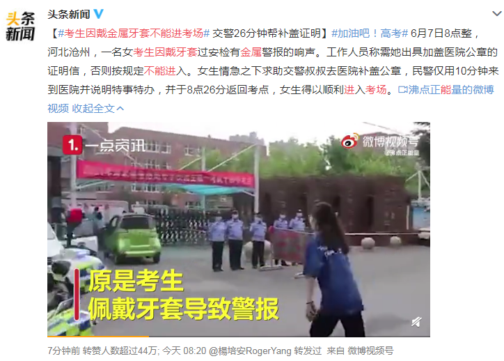 经历过高考的人们都知道,高考前的各项安检是非常严格且细致的,考试中也纪律严明。就在7日,高考第一日,河北沧州的一名考生,就因戴着金属牙套还触发了警报。针对此事,据澎湃新闻报道,教育部考试中心回应称,该考试中心已责成湖北省教育考试院认真调查,依据《国家教育考试违规处理办法》严肃处理,切实维护高考公平公正。此外,湖北省教育考试院高等教育考试办公室一名工作人员表示,已经连夜处理该事件,已对涉事学生的作弊行为进行了认定,学生也已经承认了自己的作弊行为。经了解,该生系武汉市黄陂区某中学的学生,目前该生已认错。武汉市黄陂区教育局官方微博8日发布《关于考生吴某某舞弊处理意见的通报》。![]()