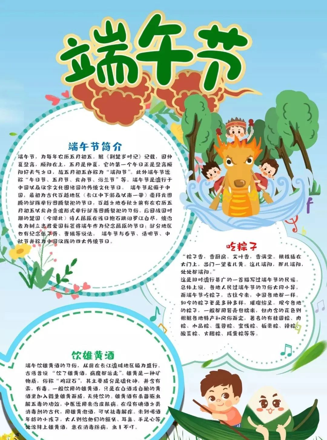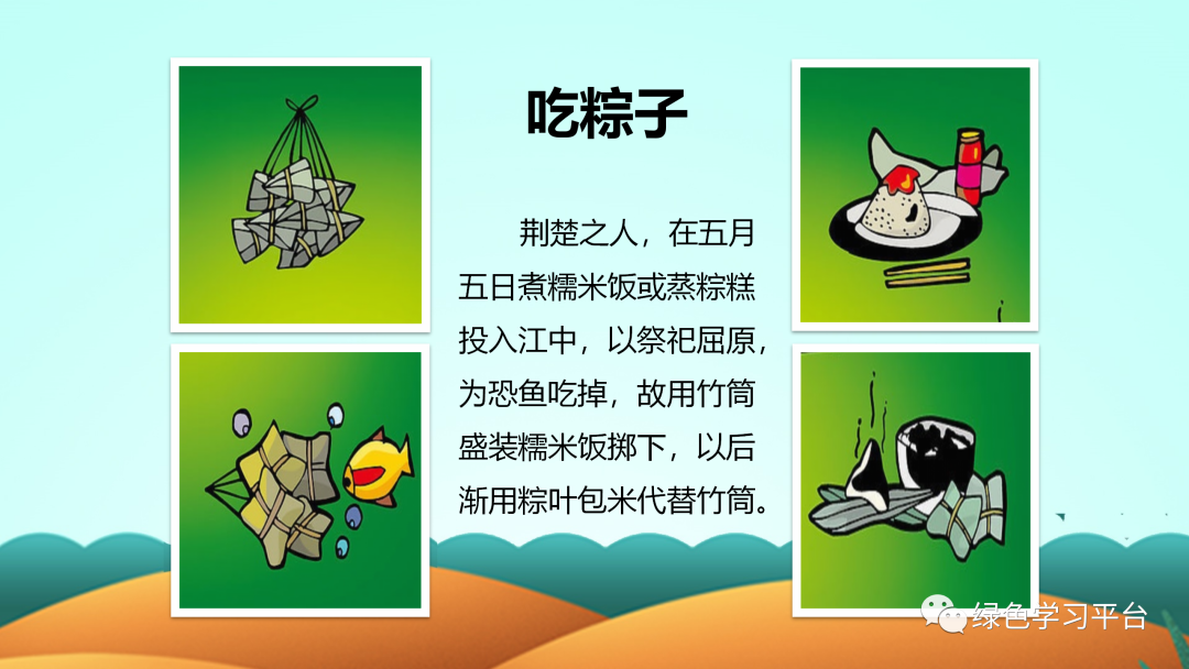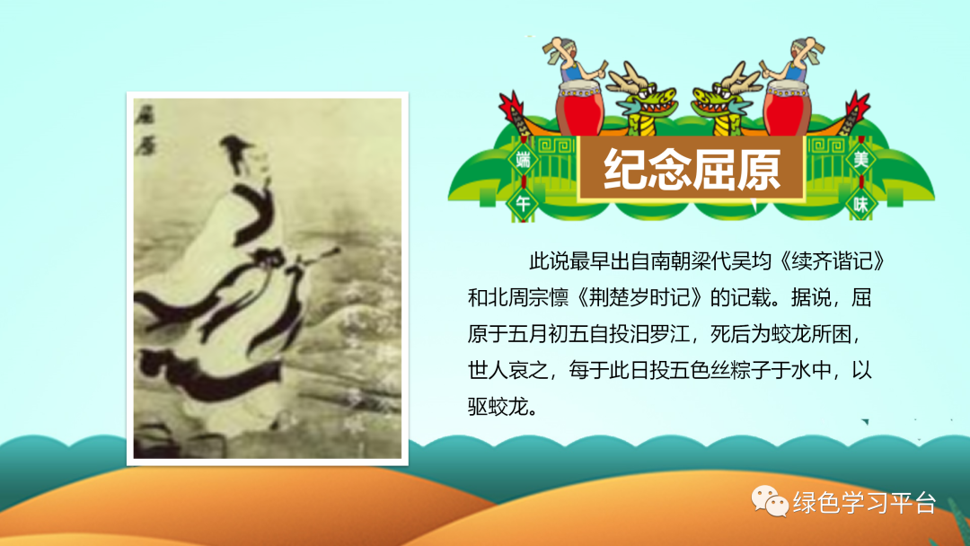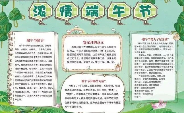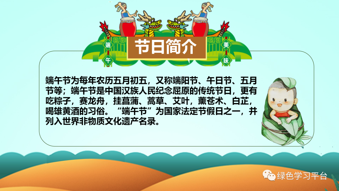 “端午节”为国家法定节假日之一,并被列入世界非物质文化遗产名录。今天,小编给大家分享:端午节主题班会课件PPT模板,及手抄报/范文/文字素材,老师可以领取教孩子了解我国传统文化。