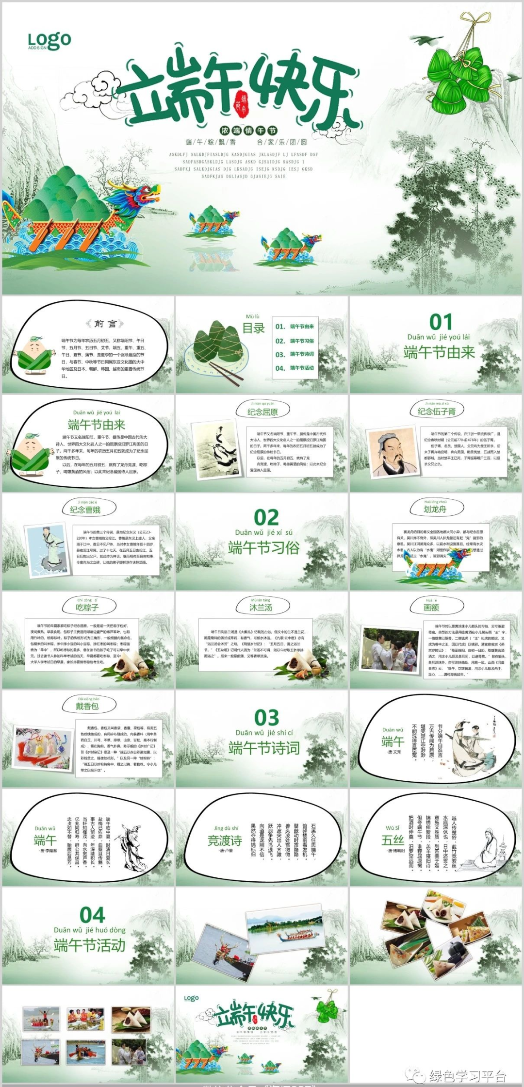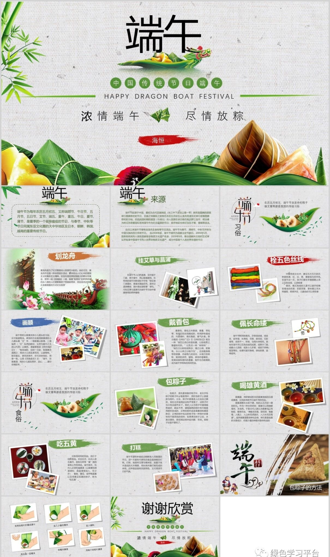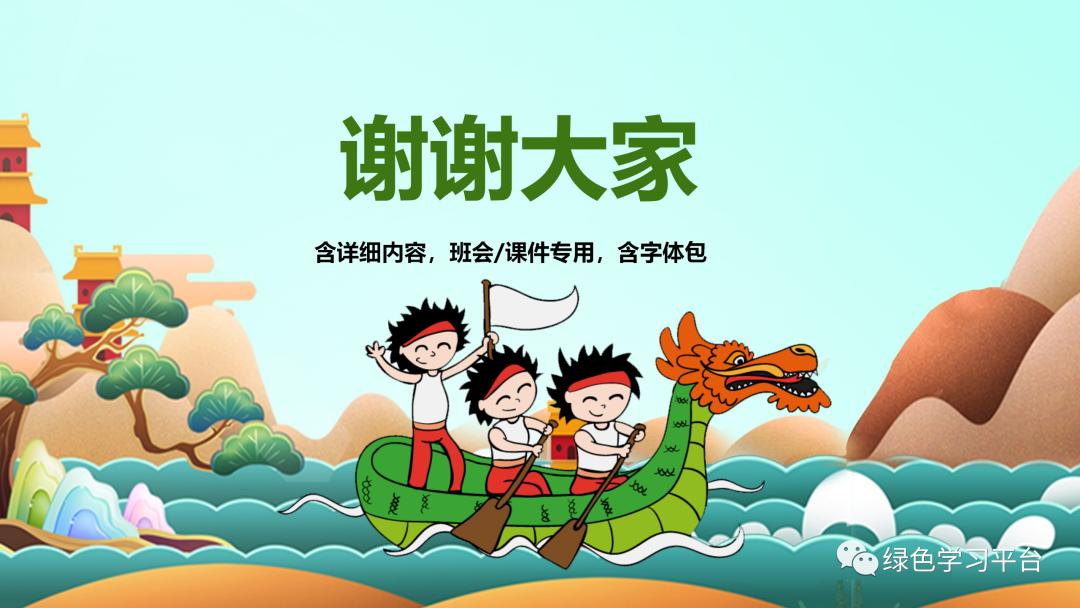 请收藏好以下图片预课资料(点击上图可观看视频及下载课件教案)【关注方法】点开下方,再点击右上方小人像即可轻松关注领取电子版请拉到文末领取电子版请拉到文末领取电子版请拉到文末资料包目录端午节为每年农历五月初五,又称端阳节、午日节、五月节、夏五、重五等。端午节是中国汉族人民纪念屈原的传统节日,民俗文化共享,屈原之名人尽皆知,追怀华夏民族的高洁情怀。端午节有吃粽子,赛龙舟,挂菖蒲、蒿草、艾叶,熏苍术、白芷,喝雄黄酒的习俗。“端午节”为国家法定节假日之一,并被列入世界非物质文化遗产名录。今天,小编给大家分享:端午节主题班会课件PPT模板,及手抄报/范文/文字素材,老师可以领取教孩子了解我国传统文化。主题班会课件下载拉至文末下载拉至文末主题班会课件模板(仅展示部分内容,领取全部请拉至文末)手抄报模板文字素材描写端午的好词端五节、端阳节、重五节、重午节、天中节、夏节、五月节、菖节、蒲节、龙舟节、浴兰节、午日节、女儿节、诗人节、龙日、午日、灯节、五蛋节雄黄酒、赛龙舟、人声鼎沸、包粽子、登山、采艾蒿屈志从俗、阖家团圆、欢歌笑语、粽叶飘香、香嫩糯米、鲜美夹心、龙舟竞渡、屈志从俗、五月端阳、风雨端阳、重五山村、重五恶日、江米粽子、纪念屈原、食古不化、粽子飘香、风雨端阳、人声鼎沸描写端午的绝妙句子1.赛龙舟是端午节的一项重要活动,在我国南方十分流行,它最早当是古越族人祭水神或龙神的一种祭祀活动,其起源有可能始于原始社会末期。2.端午是个美好的节日,在这并不美好的现实中可以寄寓一些幽思,让凡尘蒙蔽的心,在青色的古意间得到片刻的回归,认取生命中的真意,可以让生命更加真实一些。3.端午是传统节日,在莆田就有这么一首不和谐的童谣,五月初一便拉开了端午节的序幕。从初一开始,家家户户都开始忙碌起来,准备端午节的用品,虽然不是很多,其中最让人眼馋的自然要属端午中的美食了。4.端午节早晨,起床后,母亲在我们的手腕和脚踝上缠上五彩的丝线,今后一直带着,据说可以去病除邪。其实在我心里,这些五彩的丝线在我心里是那些精美手镯的替代品。有些人家也会花些钱给自己的小孩买香荷包带在身上,我的母亲是自己亲手用些小布头做的,里面塞些棉花,放些香草,即便是这样我们也很高兴。5.端午节那天,妈妈都会用根根细绳细致地编成筐,按以往的习俗,编8个层,奶奶煮好蛋后就拿出3个最光滑的。底层放一个,接着是桃子。每种都是3个,用了6层。第2层就是一个步老虎,是看护这些东西的。最后挂在门口,按照长辈说的,纪念屈原。取下来时,就把筐整理好,放在一个盒子里,与比她早出生的姐妹团聚。6.当我们面对别人的灾难,日渐麻木时;当我们遇到挫折,愤世嫉俗时,不要让敌意遮住了双眼。去相信世界还有爱。也许曾经被伤害,曾经被欺骗,可是为什么要宁可相信让人痛苦的东西,而拒绝去接受美好呢。7.“长太息以掩涕兮,哀民生之多艰。”屈原就是这样一个诗人,忧国忧民。“举世皆浊我独清,众人皆醉我独醒。”屈原就是这样一个史官,信念坚强。“青云衣兮白霓裳,举长矢兮射天狼。”屈原就是这样一个勇士,斗志昂扬。“亦余心之所善兮,虽九死其犹未悔。”屈原就是这样一个英雄,不畏强暴。8.不管历史如何嬗变,不管时代如何变迁。自从屈原投入汩罗江的那一刻起,他在楚国百姓心中就牢牢凝固和沉淀了,就注定他的灵魂将得到洗练和超度,割之不断、挥之不去,进而升华成为一个伟大的民族精神。9.被忽略的端午,我已过了好几个。竟也习惯了没有彩绳的节日。只是当看到同学手上带着五颜六色的彩绳时,我虽然会不屑一顾,说那是小孩子的东西罢了。但心中,还是会想起奶奶,想起那童年用爱编织的端午的彩绳。10.杯酒过汨罗这个耐人寻味的已然离我们远去,可以探寻的足迹唯有盘中微微泛黄的粽叶,婉转西流的汨罗江和江边那一缕亘古不变的。11.包粽子也是端午的保留节目之一。妈妈和阿姨总会买了好多的粽叶,用水少泡着,洗干净码好。粽子的馅一般是糯米,配上绿豆、红枣等,煮熟。然后在妈妈和阿姨的一阵灵巧的忙碌之后,我们小孩便馋猫般围着蒸笼转,等待粽子出笼的时刻的到来……12.“端午节”是中华民族的一个极其隆重的节日,她是为了纪念中国历史上第一位伟大的浪漫主义爱国诗人屈原而诞生的。可以说,在人类的历史上,还没有哪一个国家,哪一个民族,像我们中华民族一样二千多年来,每年都以一个隆重的节日来纪念一个诗人的逝世。关于端午的好诗端午日赐衣(唐)杜甫宫衣亦有名,端午被恩荣。细葛含风软,香罗叠雪轻。自天题处湿,当暑著来清。意内称长短,终身荷圣情。《乙卯重五诗》陆游·宋重五山村好,榴花忽已繁。粽包分两髻,艾束着危冠。旧俗方储药,羸躯亦点丹。日斜吾事毕,一笑向杯盘。《同州端午》殷尧藩·唐鹤发垂肩尺许长,离家三十五端阳。儿童见说深惊讶,却问何方是故乡。《屈原庙》唐崔·唐谗胜祸难防,沈冤信可伤。本图安楚国,不是怨怀王。庙古碑无字,洲晴蕙有香。独醒人尚笑,谁与奠椒浆。《端午即事》文天祥·宋五月五日午,赠我一枝艾。故人不可见,新知万里外。丹心照夙昔,鬓发日已改。我欲从灵均,三湘隔辽海。《端午日》殷尧藩·唐少年佳节倍多情,老去谁知感慨生;不