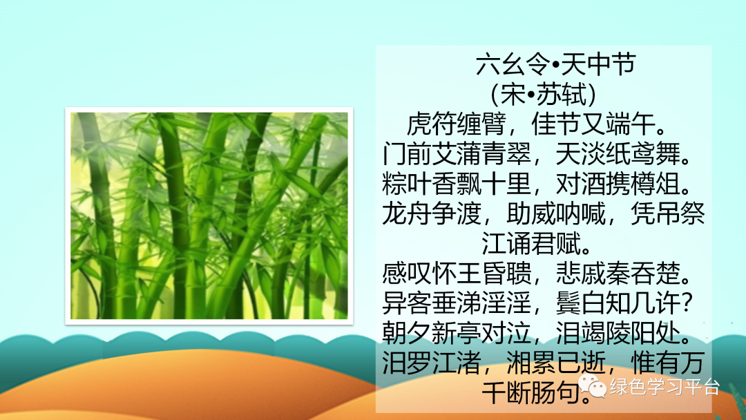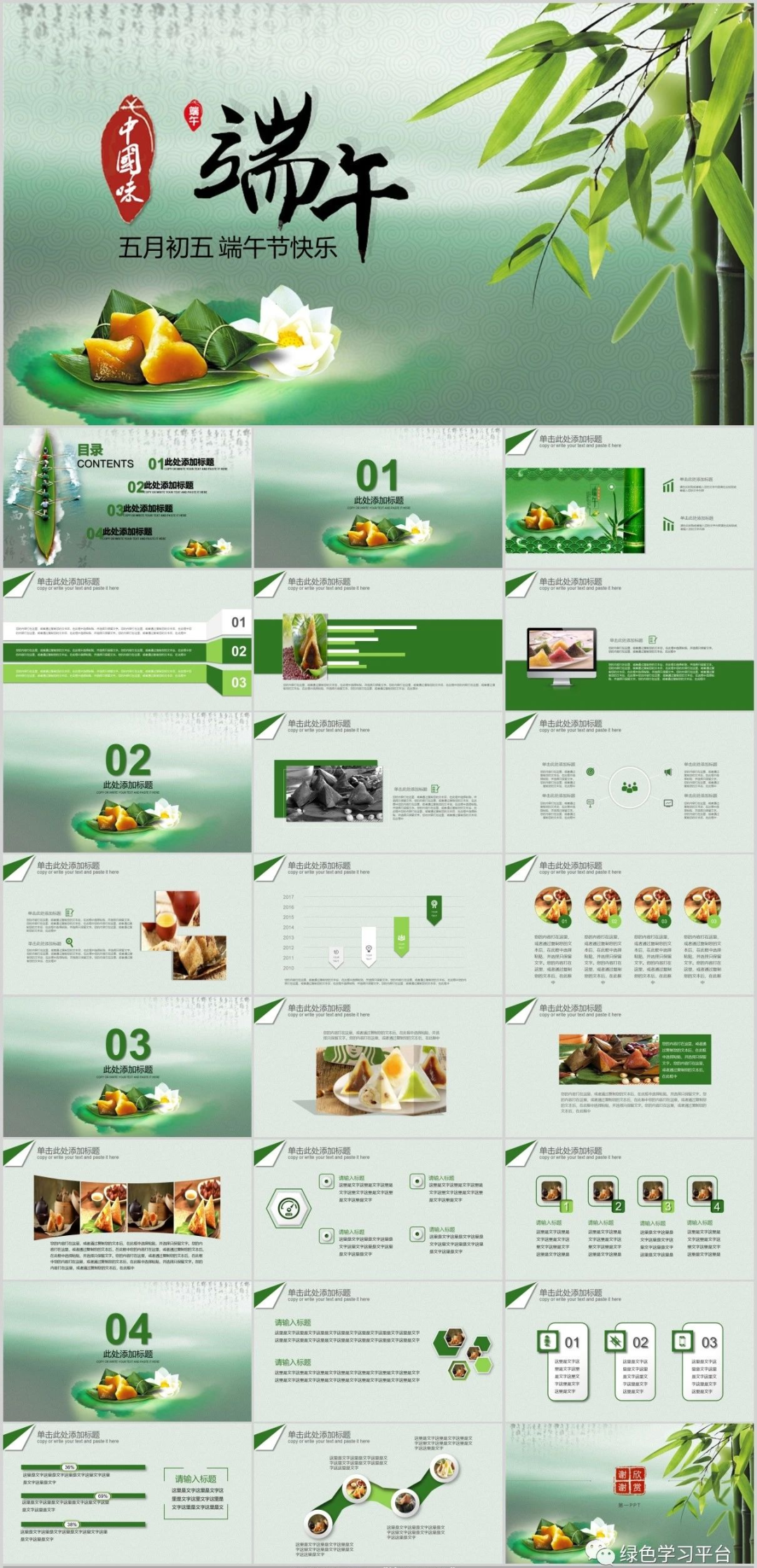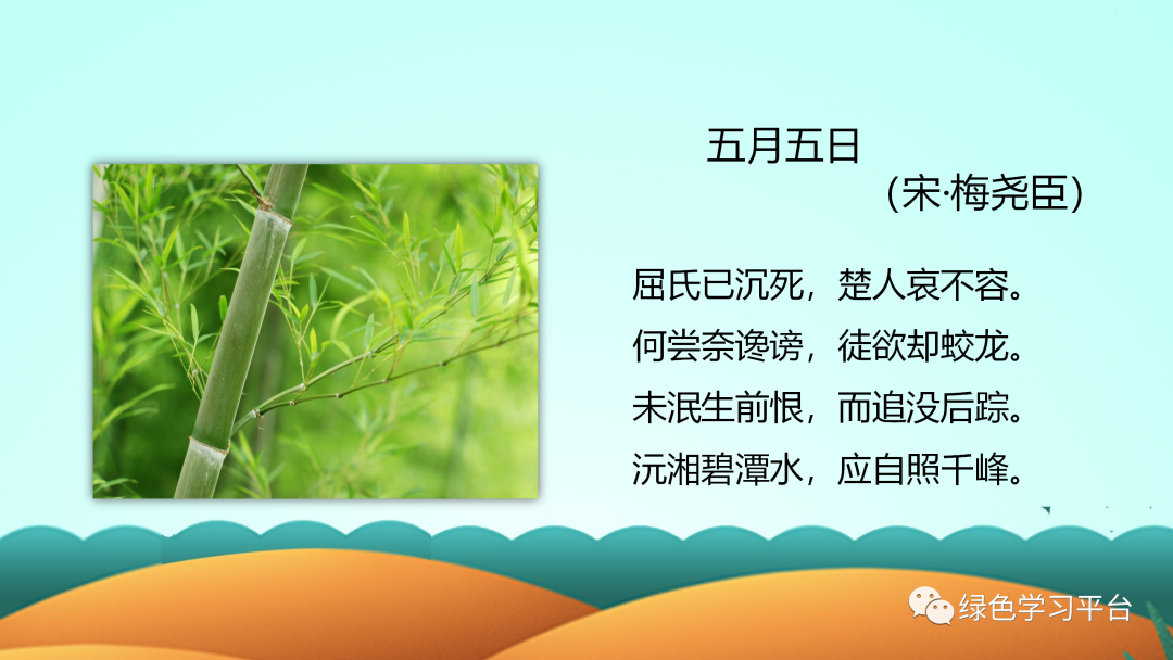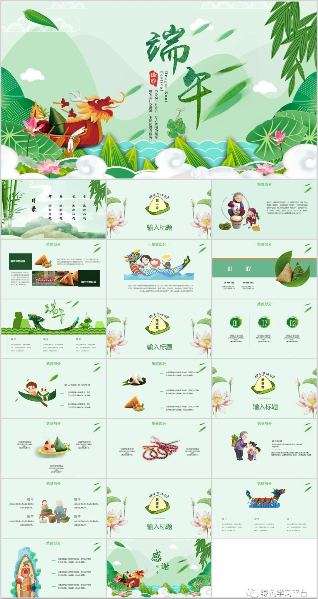 请收藏好以下图片预课资料(点击上图可观看视频及下载课件教案)【关注方法】点开下方,再点击右上方小人像即可轻松关注领取电子版请拉到文末领取电子版请拉到文末领取电子版请拉到文末资料包目录端午节为每年农历五月初五,又称端阳节、午日节、五月节、夏五、重五等。端午节是中国汉族人民纪念屈原的传统节日,民俗文化共享,屈原之名人尽皆知,追怀华夏民族的高洁情怀。端午节有吃粽子,赛龙舟,挂菖蒲、蒿草、艾叶,熏苍术、白芷,喝雄黄酒的习俗。“端午节”为国家法定节假日之一,并被列入世界非物质文化遗产名录。今天,小编给大家分享:端午节主题班会课件PPT模板,及手抄报/范文/文字素材,老师可以领取教孩子了解我国传统文化。主题班会课件下载拉至文末下载拉至文末主题班会课件模板(仅展示部分内容,领取全部请拉至文末)手抄报模板文字素材描写端午的好词端五节、端阳节、重五节、重午节、天中节、夏节、五月节、菖节、蒲节、龙舟节、浴兰节、午日节、女儿节、诗人节、龙日、午日、灯节、五蛋节雄黄酒、赛龙舟、人声鼎沸、包粽子、登山、采艾蒿屈志从俗、阖家团圆、欢歌笑语、粽叶飘香、香嫩糯米、鲜美夹心、龙舟竞渡、屈志从俗、五月端阳、风雨端阳、重五山村、重五恶日、江米粽子、纪念屈原、食古不化、粽子飘香、风雨端阳、人声鼎沸描写端午的绝妙句子1.赛龙舟是端午节的一项重要活动,在我国南方十分流行,它最早当是古越族人祭水神或龙神的一种祭祀活动,其起源有可能始于原始社会末期。2.端午是个美好的节日,在这并不美好的现实中可以寄寓一些幽思,让凡尘蒙蔽的心,在青色的古意间得到片刻的回归,认取生命中的真意,可以让生命更加真实一些。3.端午是传统节日,在莆田就有这么一首不和谐的童谣,五月初一便拉开了端午节的序幕。从初一开始,家家户户都开始忙碌起来,准备端午节的用品,虽然不是很多,其中最让人眼馋的自然要属端午中的美食了。4.端午节早晨,起床后,母亲在我们的手腕和脚踝上缠上五彩的丝线,今后一直带着,据说可以去病除邪。其实在我心里,这些五彩的丝线在我心里是那些精美手镯的替代品。有些人家也会花些钱给自己的小孩买香荷包带在身上,我的母亲是自己亲手用些小布头做的,里面塞些棉花,放些香草,即便是这样我们也很高兴。5.端午节那天,妈妈都会用根根细绳细致地编成筐,按以往的习俗,编8个层,奶奶煮好蛋后就拿出3个最光滑的。底层放一个,接着是桃子。每种都是3个,用了6层。第2层就是一个步老虎,是看护这些东西的。最后挂在门口,按照长辈说的,纪念屈原。取下来时,就把筐整理好,放在一个盒子里,与比她早出生的姐妹团聚。6.当我们面对别人的灾难,日渐麻木时;当我们遇到挫折,愤世嫉俗时,不要让敌意遮住了双眼。去相信世界还有爱。也许曾经被伤害,曾经被欺骗,可是为什么要宁可相信让人痛苦的东西,而拒绝去接受美好呢。7.“长太息以掩涕兮,哀民生之多艰。”屈原就是这样一个诗人,忧国忧民。“举世皆浊我独清,众人皆醉我独醒。”屈原就是这样一个史官,信念坚强。“青云衣兮白霓裳,举长矢兮射天狼。”屈原就是这样一个勇士,斗志昂扬。“亦余心之所善兮,虽九死其犹未悔。”屈原就是这样一个英雄,不畏强暴。8.不管历史如何嬗变,不管时代如何变迁。自从屈原投入汩罗江的那一刻起,他在楚国百姓心中就牢牢凝固和沉淀了,就注定他的灵魂将得到洗练和超度,割之不断、挥之不去,进而升华成为一个伟大的民族精神。9.被忽略的端午,我已过了好几个。竟也习惯了没有彩绳的节日。只是当看到同学手上带着五颜六色的彩绳时,我虽然会不屑一顾,说那是小孩子的东西罢了。但心中,还是会想起奶奶,想起那童年用爱编织的端午的彩绳。10.杯酒过汨罗这个耐人寻味的已然离我们远去,可以探寻的足迹唯有盘中微微泛黄的粽叶,婉转西流的汨罗江和江边那一缕亘古不变的。11.包粽子也是端午的保留节目之一。妈妈和阿姨总会买了好多的粽叶,用水少泡着,洗干净码好。粽子的馅一般是糯米,配上绿豆、红枣等,煮熟。然后在妈妈和阿姨的一阵灵巧的忙碌之后,我们小孩便馋猫般围着蒸笼转,等待粽子出笼的时刻的到来……12.“端午节”是中华民族的一个极其隆重的节日,她是为了纪念中国历史上第一位伟大的浪漫主义爱国诗人屈原而诞生的。可以说,在人类的历史上,还没有哪一个国家,哪一个民族,像我们中华民族一样二千多年来,每年都以一个隆重的节日来纪念一个诗人的逝世。关于端午的好诗端午日赐衣(唐)杜甫宫衣亦有名,端午被恩荣。细葛含风软,香罗叠雪轻。自天题处湿,当暑著来清。意内称长短,终身荷圣情。《乙卯重五诗》陆游·宋重五山村好,榴花忽已繁。粽包分两髻,艾束着危冠。旧俗方储药,羸躯亦点丹。日斜吾事毕,一笑向杯盘。《同州端午》殷尧藩·唐鹤发垂肩尺许长,离家三十五端阳。儿童见说深惊讶,却问何方是故乡。《屈原庙》唐崔·唐谗胜祸难防,沈冤信可伤。本图安楚国,不是怨怀王。庙古碑无字,洲晴蕙有香。独醒人尚笑,谁与奠椒浆。《端午即事》文天祥·宋五月五日午,赠我一枝艾。故人不可见,新知万里外。丹心照夙昔,鬓发日已改。我欲从灵均,三湘隔辽海。《端午日》殷尧藩·唐少年佳节倍多情,老去谁知感慨生;不