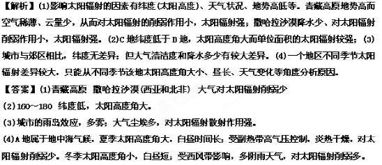 年太阳辐 射总量 | 纬度低,正午太阳高度角大,获得太阳辐射多 | 地势高,大气稀薄,透明度高,固体杂质、水汽少 | 晴天多,到达地面的太阳辐射多 |