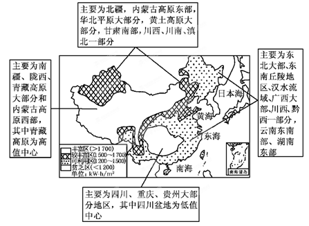 四川盆地为低值中心,其原因在于:盆地地形,水汽不易散发,空气中含水汽的量多,阴天、雾天较多,对太阳辐射削弱作用强,从而造成日照时间短,日照强度弱,太阳能资源匮乏。