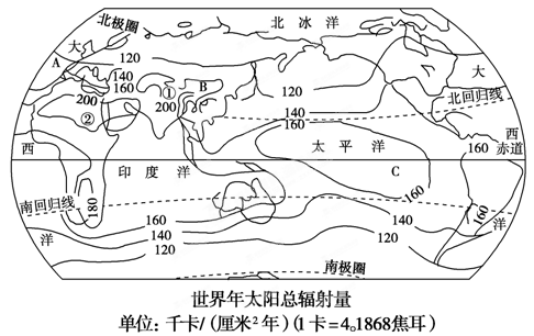 (1)世界太阳辐射强度较高的①、②区域是________和________,这两个区域的太阳辐射强度均高于赤道地区,其共同原因是______________________________。