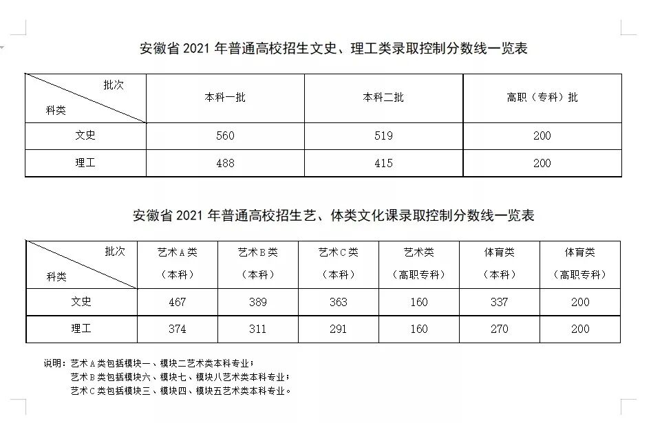 2021年我省艺术、体育类各批次文化录取控制分数线为: