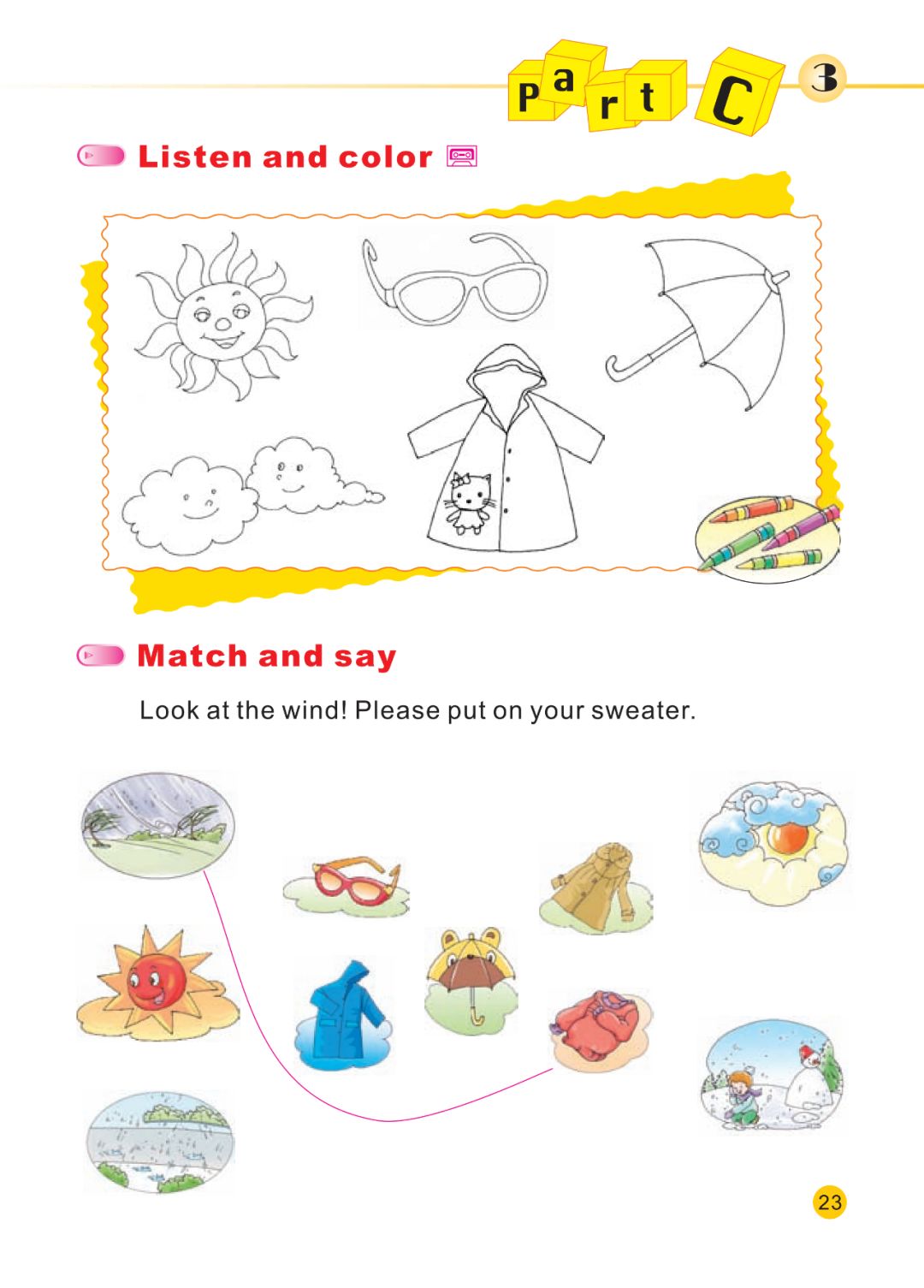 Color the raincoat orange.Please put on your sweater.Please put on your sun glasses.Please put on your raincoat.Please take your umbrella.