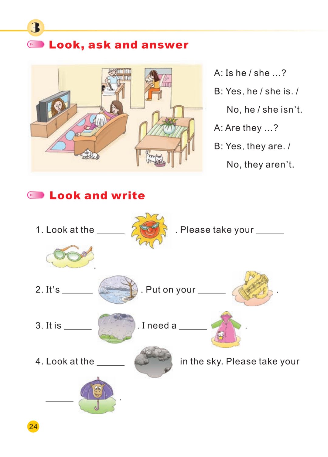 获取配套课件教案习题试卷请拉到文末课文朗读♬点击上方绿标听课文朗读微课讲解微课教学电子课本点击预习:新陕旅版英语四年级下册电子课本课文翻译Listen and colour听一听并涂一涂 1.Color the sun red.把太阳涂成红色。 2.Color the umbrella yellow and green.把伞涂成黄色和绿色。 3.Color the clouds black.把云涂成黑色。 4.Color the glasses brown.把眼镜涂成棕色。5.Color the raincoat orange.把雨衣涂成橙色。 Match and say连一连,说一说 Look at the wind!看风!Please put on your sweater.请穿上你的毛衣。 Look at the sun!看太阳!Please put on your sun glasses.请戴上你的太阳镜。 Look at the rain!看这雨!Please put on your raincoat.请穿上你的雨衣。 Look at the cloud!看云!Please take your umbrella.请带上你的雨伞。 Look at the snow!看这雪!Please put on your coat.请穿上你的外套。Look, ask and answer看,问,答 Is he ... ?他是......吗?Yes, he is.是的,他是。No, he isn’t.不,他不是。 Is she ... ?她是......吗?Yes, she is.是的,她是。No, she isn’t.不,她不是。 Are they ... ?他们是......吗?Yes, they are.是的,他们是。No, they aren’t.不,他们不是。 Look and write看一看,写一写 1.Look at the sun.Please take your sun glasses.看太阳。请带上你的太阳镜。 2.It’s snowy.Put on your coat.下雪了。穿上你的外套。 3.It’s rainy.I need a raincoat.下雨了。我需要一件雨衣。 4.Look at the cloud in the sky.Please take your umbrella.看天上的云。请带上你的雨伞。同步习题一、单项选择题。() 1. It's cold. Please put your sweater. A. on B.in C. out() 2. Look at theclouds.Please yourumbrella to your school. A. take B. take out C. take of() 3. It's . Ineedmysweater. A. snows B. snow C. snowing二、给图片选择合适的句子。三小小翻译家。1.天在下雨吗? it ?2.让我们带上一件雨衣吧. Let's a .3.请穿上你的外套. Please your coat.四、选句子,补全对话。 A. Let's put them on.B. Is there a wind?C. Yes, it isA:Let's go to school now, OK?B: OK.1. .A: Yes, thereis.B: Is it raining?A: 2..B: Let's take out our raincoats.A:3. .B:OK!参考答案:一、1. A 2. A 3. C 二、1. B 2. C 3. A三、1.Is raining 2. take raincoat 3. put on 四、1.B 2. C 3. A怎么获取配套课件教案习题试卷等资料?▼下载方法(务必细看):关注微信公众订阅号【绿色学习平台】(ID:qqyu_520910),在公众号底部菜单中输入下面提示关键字,正常一分钟内即可下载。特别注明:1、如提取不了说明关键字输入错误或操作不当,可以留言等待处理。2、我们不做强制分享获取,但希望你获取资料后还能常来,能帮我们转发分享。3、来了就是朋友,多提意见和建议。 领取方法1 ▼第1步:扫码关注 绿色学习平台第2步:发送关键字【041】即可获取。如有疑问,请添加卿老师微信:yzy5200426。(请按照正确的关键字回复哦,不添字,不错字,不漏字,否则系统无法识别) 领取方法2 ▼打不开百度网盘链接的地区可长按扫码直接进入下载电脑端下载网址http://jazpan.com/view/22807.html▼(回复关键词位置如下图所示)图文来自网络,版权归原作者,如有不妥,告知即删点击阅读原文下载全册PPT课件动画教案习题朗读试卷电子课本整套资料