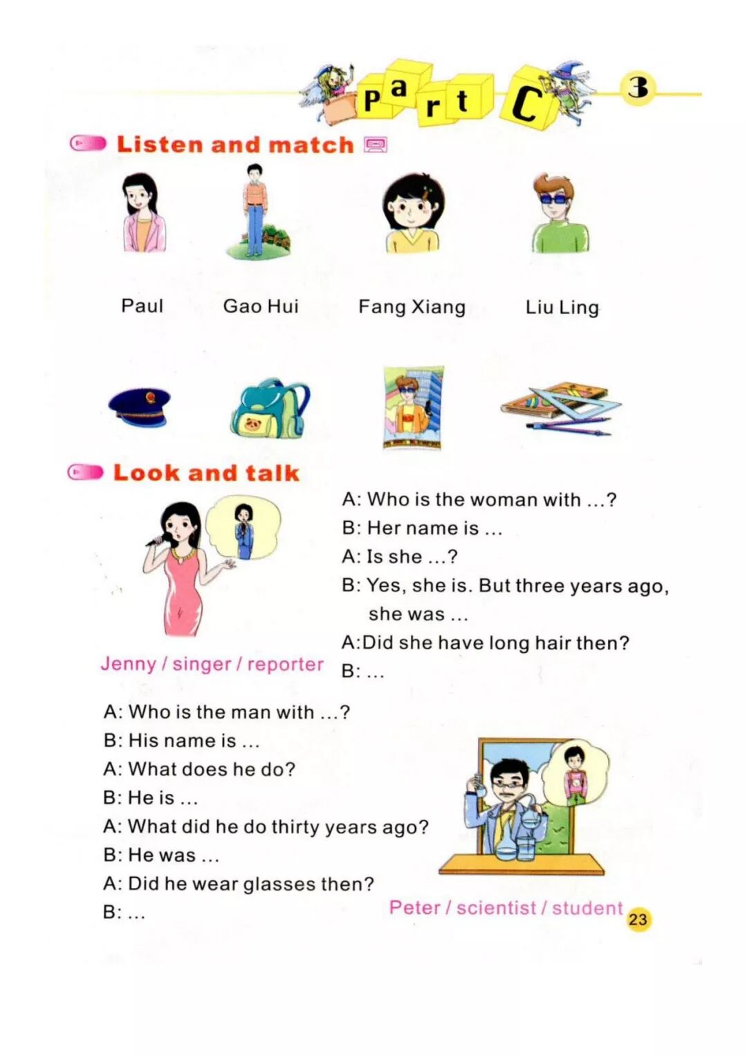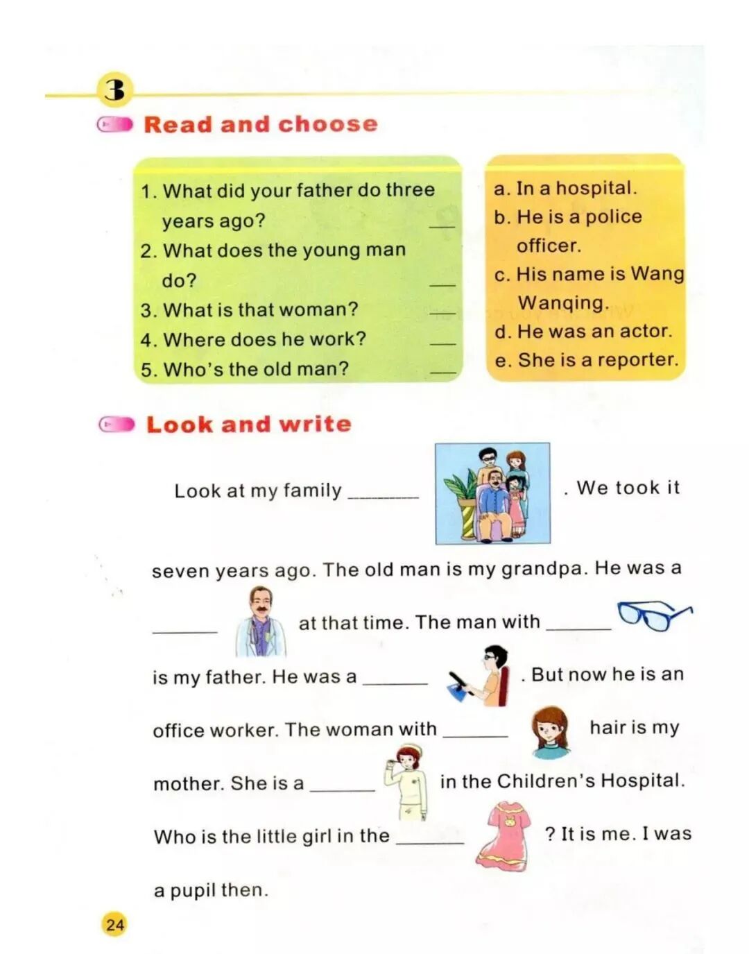 获取配套课件教案习题试卷请拉到文末课文朗读♬点击上方绿标听课文朗读微课讲解微课教学电子课本点击预习:新陕旅版英语六年级下册电子课本课文翻译Listen and match听录音,连线 1.Look, who is that man?看,那个人是谁?Which one?哪个?The tall young man.那个高个子年轻人。His name is Fang Xiang.他的名字叫方想。He is a police officer.他是一名警察。 2.Who’s that woman with long hair?那个长头发的女人是谁?She is Miss Gao.她是高小姐。Is she a teacher?她是老师吗?Yes, she teaches us math.是的,她教我们数学。 3.Who’s that man?那个人是谁?The man with sun glasses.戴太阳镜的男人。Yes, he is Paul.是的,他是保罗。He is an actor.他是一名演员。 4.Who’s the little girl with short hair?那个短发的小女孩是谁?Oh, she is my cousin Liu Ling.哦,她是我的表妹刘玲。Does she go to school?她上学吗?Of course!当然!She looks short, but she is 8 years old.她看起来很矮,但她已经8岁了。She is a pupil.她是一名小学生。 Look and talk看一看,聊一聊 Who is the woman with long hair ?那个留长发的女人是谁?Her name is Jenny.她的名字叫珍妮。Is she a singer ?她是歌手吗?Yes, she is.是的。But three years ago,she was a reporter.但三年前,她是一名记者。Did she have long hair then?她那时是长发吗?No, she didn’t.不,不是。 Who is the man with glasses?戴眼镜的男人是谁?His name is Peter.他的名字叫彼得。What does he do?他是做什么的?He is a scientist.他是一名科学家。What did he do thirty years ago?三十年前他是做什么的?He was a student.那时他是学生。Did he wear glasses then?他那时戴眼镜吗?No, he didn’t.不,他不戴。Read and choose阅读并选择 1.What did your father dothree years ago?你父亲三年前做什么工作?He was an actor.他那时演员。 2.What does the young man do?这个年轻人是做什么的?He is a police officer.他是一名警官。 3.What is that woman?那个女人是什么?She is a reporter.她是一名记者。 4.Where does he work?他在哪里工作?In a hospital.在医院里。 5.Who’s the old man?那个老人是谁?His name is Wang Wanqing.他叫王万清。 Look and write看一看,写一写 Look at my family photo.看我的全家福。We took it seven years ago.我们七年前拍的。The old man is my grandpa.这位老人是我爷爷。He was a doctor at that time.他当时是医生。Then man with glasses is my father.那么戴眼镜的人就是我爸爸。He was a driver.他是名司机。But now he is an office worker.但现在他是上班族。Then woman with long hair is my mother.那个长头发的女人就是我妈。She is a nursein the Children’s Hospital.她是儿童医院的护士。Who is the little girl in the pink dress?穿粉红色连衣裙的小女孩是谁?It is me.是我。I was a pupil then.我那时是小学生。同步习题一、写出下列单词的过去式。1. want_________ 2. learn________ 3. start________ 4. make________ 5. play________ 6. lose________二、单项选择。( )1. We _________ eat fruit for our health. A. have to B. have C. had( )2. _________ beautiful it was! A. Why B. How C. What( )3. _________ a tall boy he is! A. How B. Why C. What( )4. He _________ swim and it did very well A. learned to B. learn C. learned( )5. At the age of ten, he _________ be a reporter. A. wanted B. wanted to C. want三、阅读短文,回答问题。 Little Liu Wei wanted to be a football player. But at the age of nine, he lost his arms. He had to do everything with his feet. He learned to swim and did it very well. But at the age of nineteen, he had to stop because it was bad for him.In 2006, he started to play the piano with his feet. How difficult it was! But he made it. He played seven or eight hours a day. Now he plays it very well.1. What did Liu Wei want to be? ________________________________________2. How long does Liu Wei play the piano every day? ________________________________________3. What happened to him at the age of nine? ________________________________________参考答案:一、1. wanted 2. learned 3. started 4. made 5. played 6. lost二、1. A 2. B 3. C 4. A 5. B三、1. He wanted to be a football player.2. He played seven or eight hours a day.3. He lost his arms.怎么获取配套课件教案习题试卷等资料?▼下载方法(务必细看):关注微信公众订阅号【绿色学习平台】(ID:qqyu_520910),在公众号底部菜单中输入下面提示关键字,正常一分钟内即可下载。特别注明:1、如提取不了说明关键字输入错误或操作不当,可以留言等待处理。2、我们不做强制分享获取,但希望你获取资料后还能常来,能帮我们转发分享。3、来了就是朋友,多提意见和建议。 领取方法1 ▼第1步:扫码关注 绿色学习平台第2步:发送关键字【061】即可获取。如有疑问,请添加卿老师微信:yzy5200426。(请按照正确的关键字回复哦,不添字,不错字,不漏字,否则系统无法识别) 领取方法2 ▼打不开百度网盘链接的地区可长按扫码直接进入下载电脑端下载网址http://jazpan.com/view/22806.html▼(回复关键词位置如下图所示)图文来自网络,版权归原作者,如有不妥,告知即删点击阅读原文下载全册PPT课件动画教案习题朗读试卷电子课本整套资料