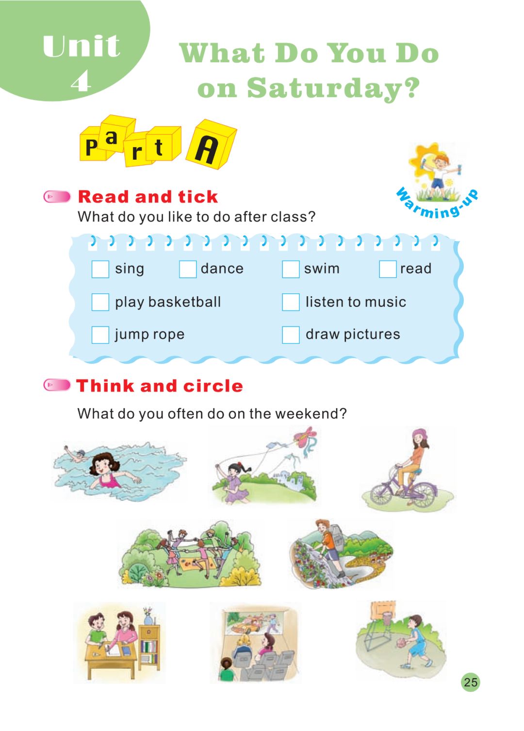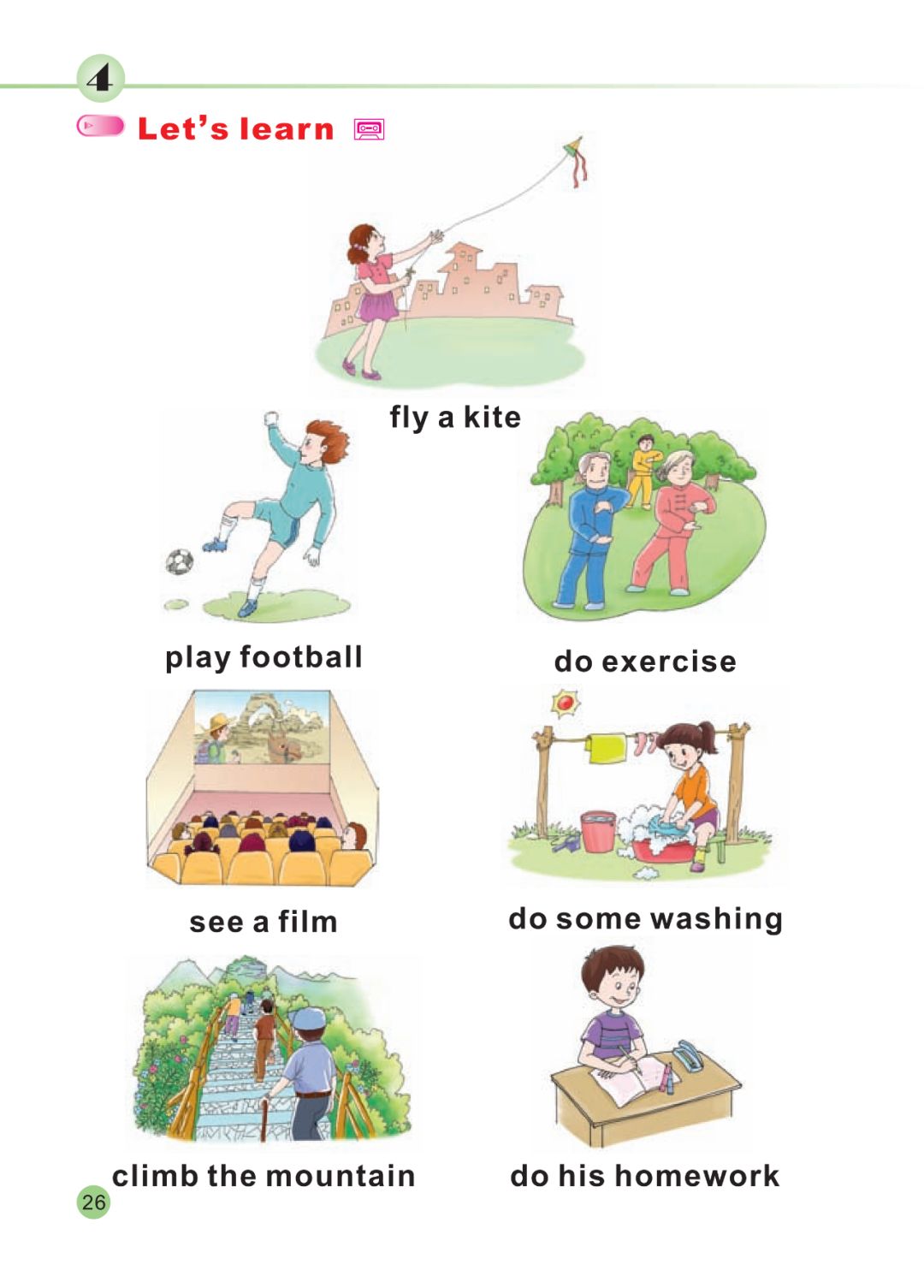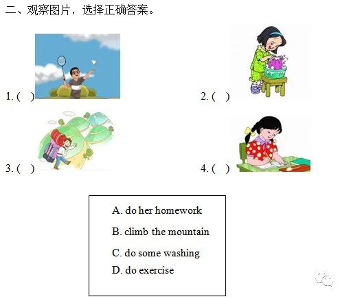 获取配套课件教案习题试卷请拉到文末课文朗读♬点击上方绿标听课文朗读微课讲解微课教学电子课本点击预习:新陕旅版英语四年级下册电子课本课文翻译Unit 4What do you do on Saturday?第四单元 你星期六做什么?Read and tick阅读并打勾 What do you like to do after class?课后你喜欢做什么?sing dance swim read 唱歌跳舞游泳阅读play basketball listen to music jump rope draw pictures打篮球听音乐跳绳画画Think and circle想一想,圈一圈 What do you often do on the weekend?你周末经常做什么? swim fly a kite ride a bike have a picnic climb the mountain do homeworksee a film play basketball游泳放风筝骑自行车野餐爬山做作业看电影打篮球Let's learn我们来学一学 fly a kite放风筝play football踢足球do exercise做运动see a film看电影do some washing洗衣服climb the mountain爬山do his homeworkLet's talk来说一说 Good morning, Grandpa!早上好,爷爷!What are you doing?您正在做什么?I am doing exercise.我正在做运动。 What do you do on Saturday?你在星期六做什么?I do some exercise, too.我也做一些运动。I often play football.我经常踢足球。 What does your father do on the weekend?你的爸爸在周末做什么?He often climbs the mountains.他经常爬山。 What about your mother?你的妈妈呢?She often does some washing.她经常洗衣服。同步习题一、英汉互译。1.flyakite______________ 2.做运动______________3.climb the mountain______________4.踢足球______________5.do some washing______________ 6.做作业______________三、给单词、短语选择正确的汉语意思。( ) 1. exercise A.跳舞 B. 唱歌 C. 锻炼( ) 2.film A. 感觉 B. 电影 C. 一直( ) 3. football A.篮球 B. 排球 C. 足球( ) 4. mountain A.山 B. 跳绳 C. 踢毽子 ( ) 5. kite A.画画 B. 风筝 C. 弹琴 参考答案:一、1. 放风筝 2. do exercise 3. 爬山 4. playfootball 5. 洗衣服 6.do homework二、1.D 2. C 3. B 4. A三、1.C 2. B 3. C 4. A 5. B怎么获取配套课件教案习题试卷等资料?▼下载方法(务必细看):关注微信公众订阅号【绿色学习平台】(ID:qqyu_520910),在公众号底部菜单中输入下面提示关键字,正常一分钟内即可下载。特别注明:1、如提取不了说明关键字输入错误或操作不当,可以留言等待处理。2、我们不做强制分享获取,但希望你获取资料后还能常来,能帮我们转发分享。3、来了就是朋友,多提意见和建议。 领取方法1 ▼第1步:扫码关注 绿色学习平台第2步:发送关键字【041】即可获取。如有疑问,请添加卿老师微信:yzy5200426。(请按照正确的关键字回复哦,不添字,不错字,不漏字,否则系统无法识别) 领取方法2 ▼打不开百度网盘链接的地区可长按扫码直接进入下载电脑端下载网址http://jazpan.com/view/22807.html▼(回复关键词位置如下图所示)图文来自网络,版权归原作者,如有不妥,告知即删点击阅读原文下载全册PPT课件动画教案习题朗读试卷电子课本整套资料