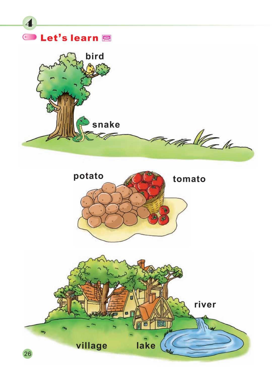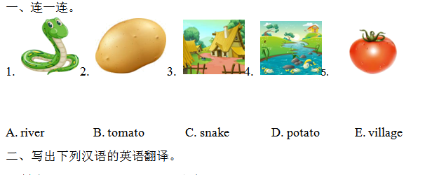 二、1.village 2. bird 3. tomato 4. snake 5. river 6. potato 7. lake