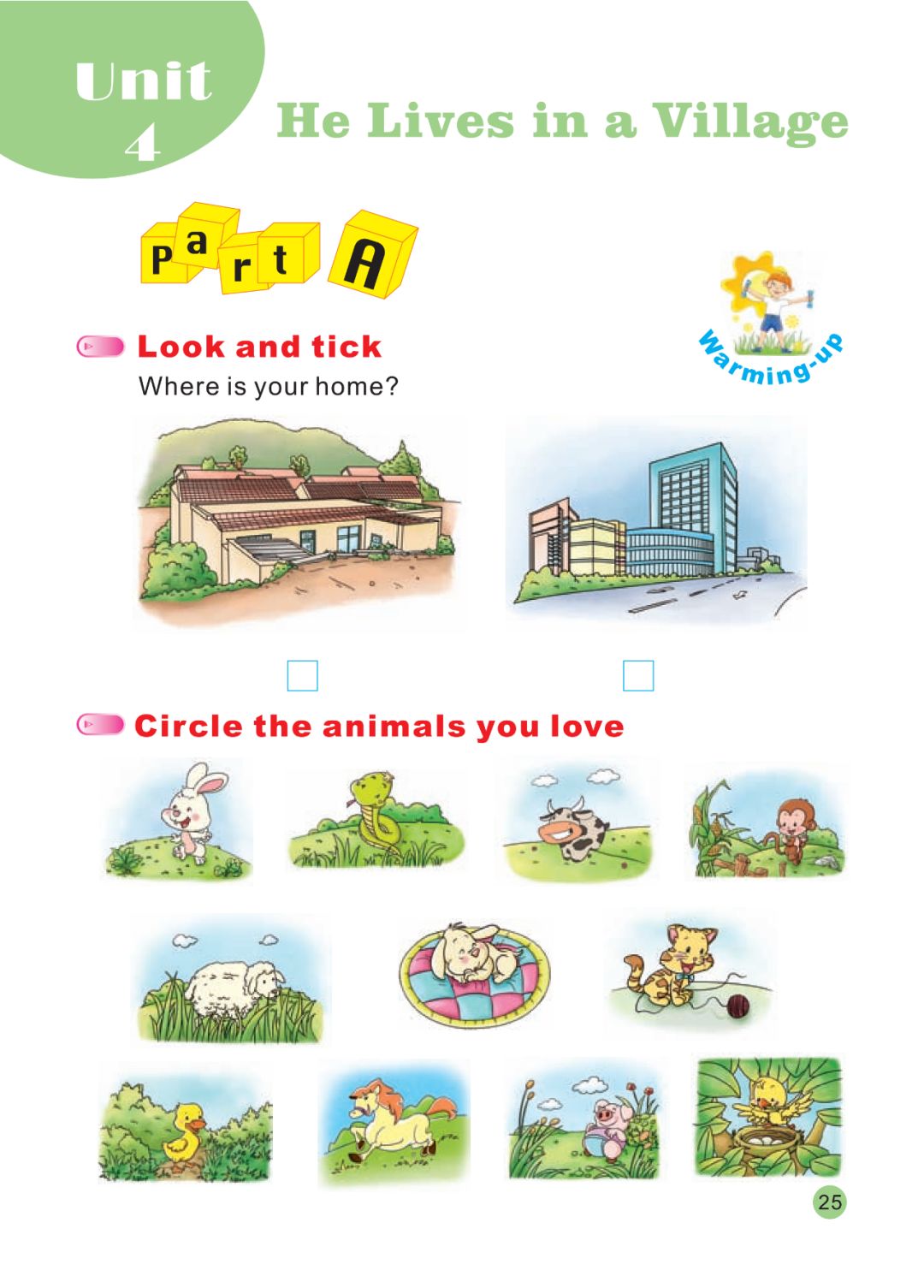 获取配套课件教案习题试卷请拉到文末课文朗读♬点击上方绿标听课文朗读微课讲解微课教学电子课本点击预习:新陕旅版英语五年级下册电子课本课文翻译Unit 4 He lives in a village第四单元 他住在一个村庄里。Look and tick看一看,打勾 Where is your home?你家在哪?In a village在村子里In a city在城市里 Circle the animals you love圈出你喜欢的动物 rabbit snake cow monkey 兔子蛇牛猴子sheep dog cat 绵羊狗猫duck horse pig bird鸭子马猪鸟Let's learn学一学 bird鸟snake蛇potato土豆tomato西红柿river河流village村庄lake湖泊Let's talk说一说 Excuse me,how can I get to the Bell Tower?请问,我怎样才能到钟楼?You can go with me.你可以和我一起走。Thank you.谢谢你。Xi'an is really a beautiful city.西安真是个漂亮的城市。Yes. Do you live in the city, too?是的。你也住在城里吗?No. I live in a village far from the city.不,我住在远离城市的一个村庄里。Is your village big?你们的村子大吗?No. It is small, but very beautiful.不,它很小,但很漂亮。In April and May, there aremany kinds of flowers around.在四月和五月,到处都是各种各样的花儿。 In September and October,we have many fruits.在九月和十月,我们有很多水果。 It sounds very nice.听上去很不错啊。同步习题1. 村庄_________________ 2. 小鸟______________3. 西红柿_______________ 4. 蛇________________5. 小河_________________ 6. 土豆______________7. 湖泊_________________三、选出不同类的一项。( )1. A. me B. get C. you ( )2. A. does B. live C. have ( )3. A. April B. May C. in ( )4. A. from B. very C. on ( )5. A. big B. beautiful C. many 四、单项选择。( )1.Iliveinavillage fromthecity. A. for B. far C. in( )2. — Are these tomatoesbig?— A. Yes,it is.B. No,theyaren’t.C. No, it isn’t.( )3.There manykindsofflowers. A. isB.areC. have参考答案:一、1—C 2—D 3—E 4—A 5—B二、1.village 2. bird 3. tomato 4. snake 5. river 6. potato 7. lake三、1.B 2. A 3. C 4. B 5. C四、1.B 2. B 3. B怎么获取配套课件教案习题试卷等资料?▼下载方法(务必细看):关注微信公众订阅号【绿色学习平台】(ID:qqyu_520910),在公众号底部菜单中输入下面提示关键字,正常一分钟内即可下载。特别注明:1、如提取不了说明关键字输入错误或操作不当,可以留言等待处理。2、我们不做强制分享获取,但希望你获取资料后还能常来,能帮我们转发分享。3、来了就是朋友,多提意见和建议。 领取方法1 ▼第1步:扫码关注 绿色学习平台第2步:发送关键字【052】即可获取。如有疑问,请添加卿老师微信:yzy5200426。(请按照正确的关键字回复哦,不添字,不错字,不漏字,否则系统无法识别) 领取方法2 ▼打不开百度网盘链接的地区可长按扫码直接进入下载电脑端下载网址http://jazpan.com/view/22809.html▼(回复关键词位置如下图所示)图文来自网络,版权归原作者,如有不妥,告知即删点击阅读原文下载全册PPT课件动画教案习题朗读试卷电子课本整套资料