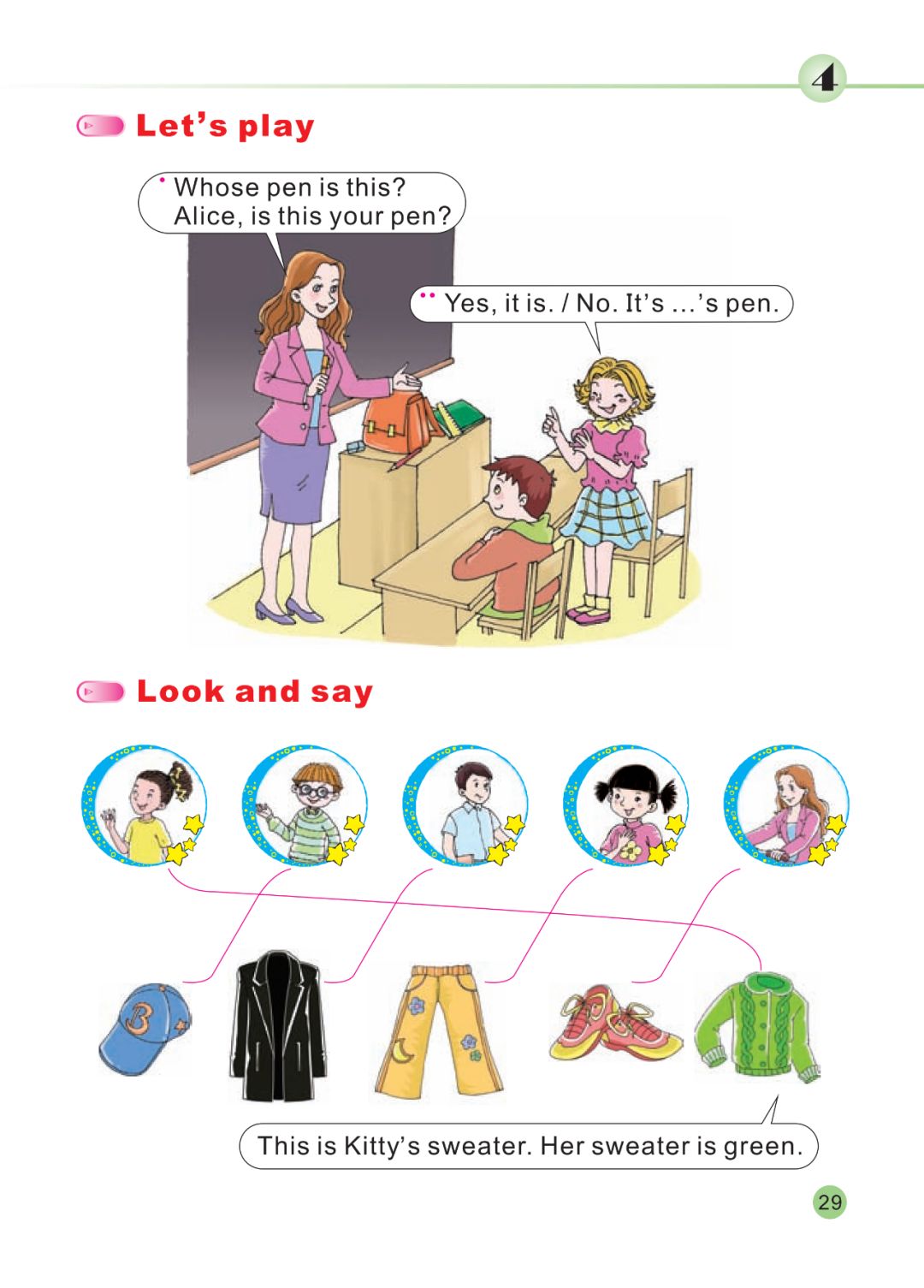 获取配套课件教案习题试卷请拉到文末课文朗读♬点击上方绿标听课文朗读微课讲解微课教学电子课本点击预习:新陕旅版英语三年级下册电子课本课文翻译Let's learn more学习更多 Whose umbrella is this?这是谁的伞?It’s Miss White’s umbrella.它是怀特小姐的伞。Her umbrella is green.她的伞是绿色的。 Whose trousers are these?这是谁的裤子?They are Dad’s trousers.它是爸爸的裤子。His trousers are blue.他的裤子是蓝色的。 Let’s play来玩吧! Whose pen is this?这是谁的钢笔?Alice, is this your pen?爱丽丝,这是你的钢笔吗?Yes, it is.是的。No, it’s Colin’s pen.不,这是科林的钢笔。 Look and say看一看,说一说 This is Kitty’s sweater.Her sweater is green.这是凯蒂的毛衣。她的毛衣是绿色的。 This is Kevin’s cap.His cap is blue.这是凯文的帽子。他的帽子是蓝色的。 This is Mr Zhao’s jacket.His jacket is black.这是赵先生的夹克衫。他的夹克是黑色的。 This is Wu Chen’s trousers.Her trousers are yellow.这是吴晨的裤子。她的裤子是黄色的。 This is Miss White’s shoes.Her shoes are brown.这是怀特小姐的鞋子。她的鞋子是棕色的。 Read a story读故事 Whose shoe is this?这是谁的鞋?It’s my shoe!它是我的鞋! It’s too big! It’s not her shoe.它太大了!它不是她的鞋。It’s too small. It’s not her shoe.它太小了。它不是她的鞋。 Is this her shoe?这是她的鞋子吗?Yes. It’s my shoe.是的。它是我的鞋。How beautiful!好漂亮!同步习题一、英汉互译1. 我的上衣__________ 2. 你的毛衣__________3. 谁的裤子__________ 4. 她的袜子__________5. Jenny’s skirt__________ 6. her dress__________7. Thank you very much.__________8. You’ re welcome.__________二、单项选择。()1. — Whose skirt is this?— It’s _______ skirt.A. I B. My C. my ()2. _______ sweater is that?A. Who B. who C. Whose ()3.— Thank you very much.— _______welcome.A. You’re B. you’re C. It’s()4. — Is this your coat?— _______. It’s Liu Zhaoyang’s coat.A. No, it isn’t. B. Yes, he isC. No, I am not三、连词成句。1.sweater is your this (?)___________________________________1. that whose is dress (?)______________________________________参考答案:一、1. my coat 2. your sweater 3. whose trousers 4. her socks 5. 珍妮的短裙 6. 她的连衣裙 7. 非常感谢。8. 不客气。二、1. C 2. C 3. A 4. A三、1. Isthisyour sweater?2. Whose dress is that?怎么获取配套课件教案习题试卷等资料?▼下载方法(务必细看):关注微信公众订阅号【绿色学习平台】(ID:qqyu_520910),在公众号底部菜单中输入下面提示关键字,正常一分钟内即可下载。特别注明:1、如提取不了说明关键字输入错误或操作不当,可以留言等待处理。2、我们不做强制分享获取,但希望你获取资料后还能常来,能帮我们转发分享。3、来了就是朋友,多提意见和建议。 领取方法1 ▼第1步:扫码关注 绿色学习平台第2步:发送关键字【031】即可获取。如有疑问,请添加卿老师微信:yzy5200426。(请按照正确的关键字回复哦,不添字,不错字,不漏字,否则系统无法识别) 领取方法2 ▼打不开百度网盘链接的地区可长按扫码直接进入下载电脑端下载网址http://jazpan.com/view/22805.html▼(回复关键词位置如下图所示)图文来自网络,版权归原作者,如有不妥,告知即删点击阅读原文下载全册PPT课件动画教案习题朗读试卷电子课本整套资料