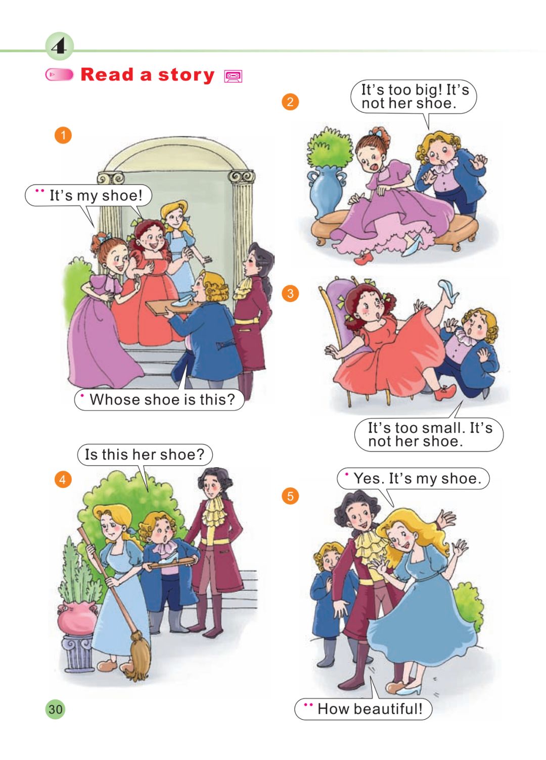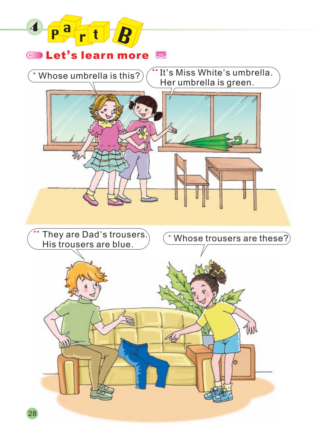 It’s Miss White’s umbrella.Whose trousers are these?This is Mr Zhao’s jacket.This is Wu Chen’s trousers.This is Miss White’s shoes.It’s too big! It’s not her shoe.It’s too small. It’s not her shoe.