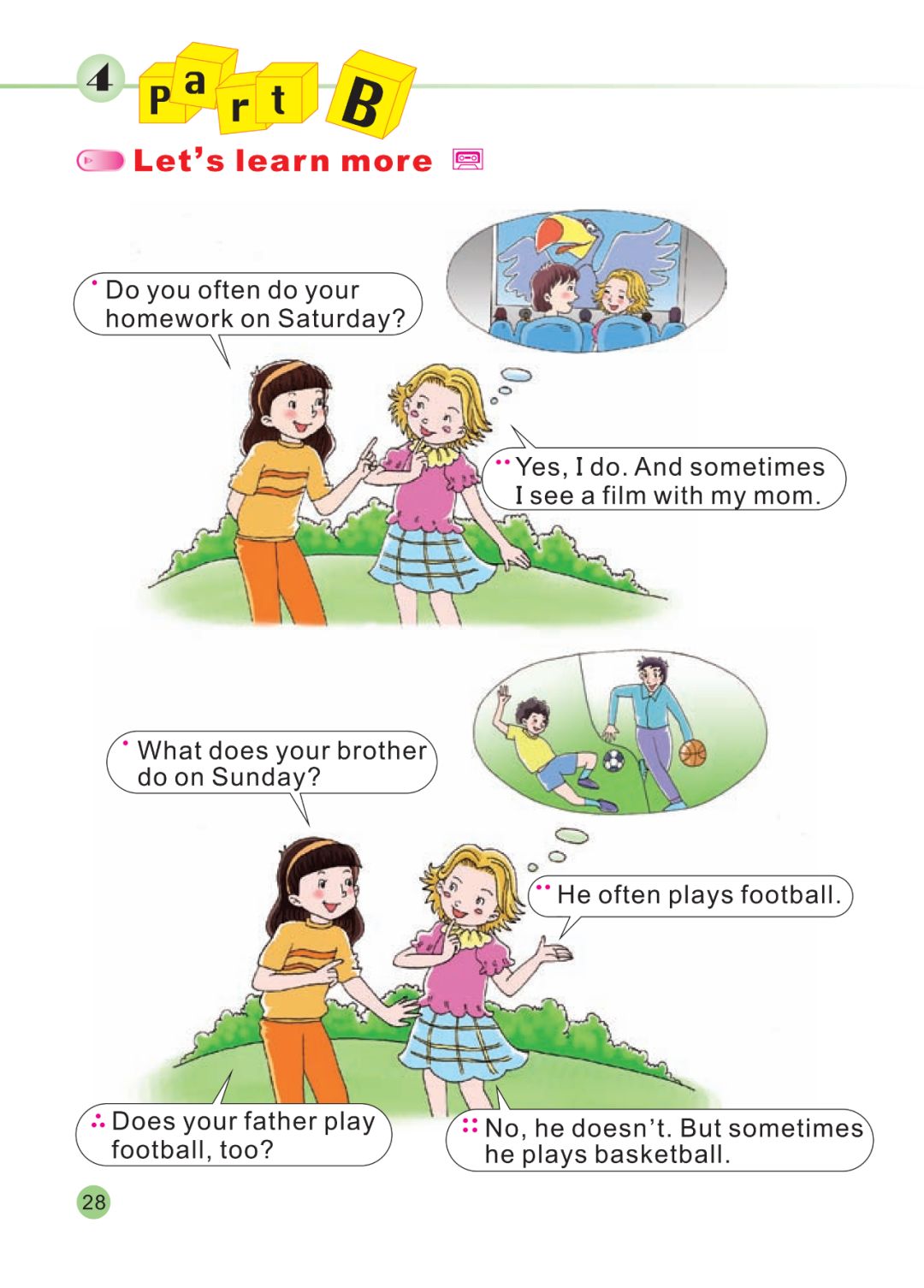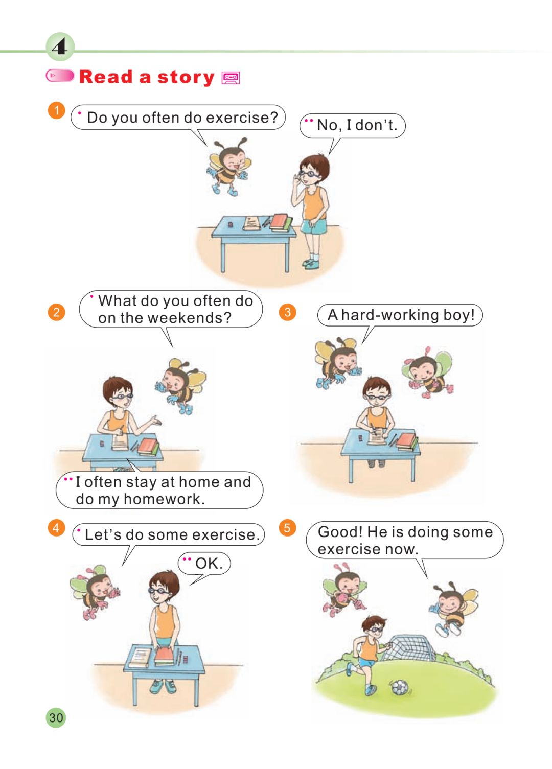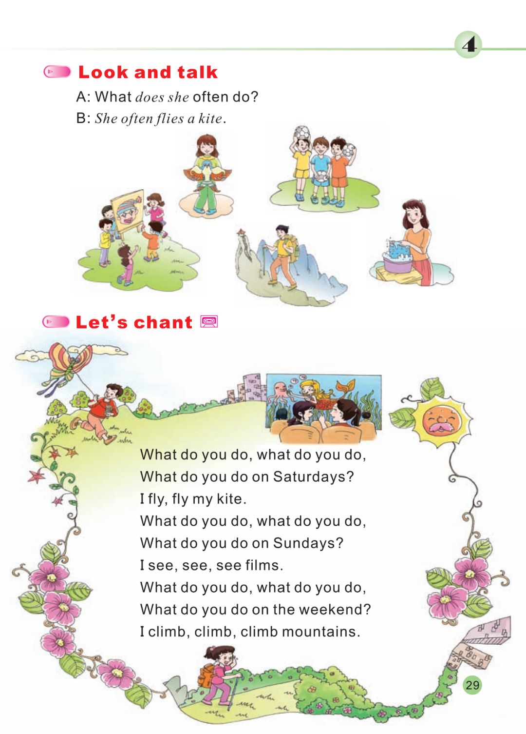 获取配套课件教案习题试卷请拉到文末课文朗读♬点击上方绿标听课文朗读微课讲解微课教学电子课本点击预习:新陕旅版英语四年级下册电子课本课文翻译Let's learn more我们来学习更多知识 Do you often do your homework on Saturday?你经常在星期六做家庭作业吗?Yes, I do.是的,我做家庭作业。And sometimes I see a film with my mom.并且有时候我和我妈妈看电影。 What does your brother do on Sunday?你的弟弟在星期天做什么?He often plays football.他经常踢足球。 Does your father play football, too?你的爸爸也踢足球吗?No, he doesn't.不,他不踢足球。But sometimeshe plays basketball.但是有时候他打篮球。Look and talk看一看,聊一聊 What does she often do?She often flies a kite.她经常做什么?她经常放风筝。 What do they often do?They often play football.他们经常做什么?他们经常踢足球。 What do they often do?They often play a game.他们经常做什么?他们经常玩游戏。 What does he often do?He often climbs the mountain.他经常做什么?他经常爬山。 What does she often do?She often does some washing.她经常做什么?她经常洗衣服。 Let's chant我们来说唱 What do you do, what do you do,你做什么,你做什么,What do you do on Saturdays?星期六你做什么?I fly, fly my kite.我飞,放风筝。 What do you do, what do you do,你做什么,你做什么,What do you do on Sundays?星期天你做什么?I see, see, see films.我看,看,看电影。 What do you do, what do you do,你做什么,你做什么,What do you do on the weekends?你周末做什么?I climb, climb, climb mountains.我爬山,爬山,爬山。Read a story读一个故事 Do you often do exercise?你经常做运动吗?No, I don't.不,我不做运动。 What do you often do on the weekends?你经常在周末做什么?I often stay at home and do my homework.我经常呆在家里做家庭作业。A poor boy!可怜的孩子! Let's do some exercise.我们做一些运动吧。OK.好的。Good!很好!He is doing some exercise now.他现在正在做一些运动。同步习题一、选词填空。fly a kite weekend with often does his homework(1) Whatdo you do on the _________?(2) Heoften _________ after school.(3)There is a wind. Let’s _________.(4)Let’s play football _________Mr. Zhao.(5) My mom_________ reads a book on Sunday.二、选词填空。1._________(Where/How)happyIam! 2.Ioftenplayfootball_________(on/in)Sundays. 3.Myfatheroften_________(read/reads)abookinthemorning. 4.Mymotherisdoingsome_________(washing/wash)now. 5.Doesyourgrandpaoften_________(climb/climbs)mountains? 三、单项选择题。 ( ) 1. _________ are you doing? A. What B.Who C.There( ) 2. I _________ doing exercise. A. is B.am C. be ( ) 3. What do you do _________ Saturday?A. in B.at C.on( ) 4. He often _________ football.A. plays B.play C.is play( ) 5. He is doing some exercise _________. A.yesterday B.now C.tomorrow参考答案:一、1. weekend 2. does his homework 3. fly a kite 4. with 5. often二、1.How 2. on 3. reads 4. washing 5. climbs三、1.A 2. B 3. C 4. A 5. B 怎么获取配套课件教案习题试卷等资料?▼下载方法(务必细看):关注微信公众订阅号【绿色学习平台】(ID:qqyu_520910),在公众号底部菜单中输入下面提示关键字,正常一分钟内即可下载。特别注明:1、如提取不了说明关键字输入错误或操作不当,可以留言等待处理。2、我们不做强制分享获取,但希望你获取资料后还能常来,能帮我们转发分享。3、来了就是朋友,多提意见和建议。 领取方法1 ▼第1步:扫码关注 绿色学习平台第2步:发送关键字【041】即可获取。如有疑问,请添加卿老师微信:yzy5200426。(请按照正确的关键字回复哦,不添字,不错字,不漏字,否则系统无法识别) 领取方法2 ▼打不开百度网盘链接的地区可长按扫码直接进入下载电脑端下载网址http://jazpan.com/view/22807.html▼(回复关键词位置如下图所示)图文来自网络,版权归原作者,如有不妥,告知即删点击阅读原文下载全册PPT课件动画教案习题朗读试卷电子课本整套资料