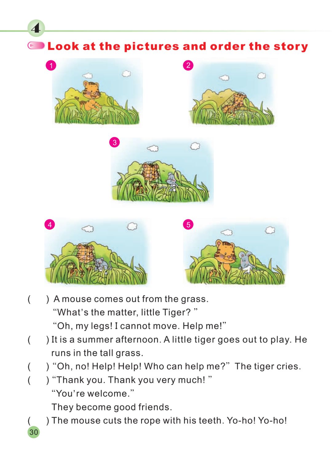 获取配套课件教案习题试卷请拉到文末课文朗读♬点击上方绿标听课文朗读微课讲解微课教学电子课本点击预习:新陕旅版英语五年级下册电子课本课文翻译Let's learn more多学多知 Lele and his parentslive in a village near a lake.乐乐和他的父母住在湖边的一个村庄里。They have a big house there.他们在那儿有一所大房子。A river runs by.小河从旁边流过。His parents work on a farm.他的父母在农场里干活儿。 In spring, they grow tomatoes,potatoes and other vegetables.在春天,他们种下西红柿、土豆和其他蔬菜。 They plant many trees, too.他们还种许多树。The trees are homes for birdsand some wild animals.树是小鸟和一些野生动物的家。 In spring, summer and autumn,在春天、夏天和秋天,Lele can see rabbits, snakes and even monkeys.乐乐能看到兔子、蛇,甚至还能看到猴子。 They live happily together year after year.年复一年,他们幸福地生活在一起。Lele loves his home.乐乐爱他的家。He loves the animals, too.他也爱动物们。Read again and answer the questions再读一遍,回答问题 1.Where does Lele live?乐乐住哪里? 2.What do they grow on the farm?他们在农场种植什么? 3.What animals can Lele see?乐乐能看见什么动物? 4.Does he love his village?他爱他的村庄吗? Let's chant唱歌谣 Home《家》 Home is a place with Dad and Mom.家是一个有爸爸和妈妈的地方。Home is a place full of love.家是一个充满爱的地方。Little birds can grow up there,away from storm.小鸟可以在那儿长大,远离风暴。 Home is a placewith care and warm.家是一个有着关怀和温暖的地方。Home is a place full of love.家是一个充满爱的地方。Look at the pictures and order the story看图,给故事排序 It is a summer afternoon.这是一个夏天的下午。A little tiger goes out to play.一只小老虎出去玩。He runs in the tall grass.他在高高的草丛中奔跑。 “Oh, no! Help! “哦,不!救命啊!Who can help me?”谁能帮帮我?”The tiger cries.老虎哭了。 A mouse comes out from the grass.一只老鼠从草丛中出来。“What’s the matter, little Tiger?”“怎么了,小老虎?”“Oh, my legs! I cannot move. Help me!”“哦,我的腿!我不能动了。救命!” The mouse cuts the rope with his teeth.老鼠用牙齿割断了绳子。Yo-ho! Yo-ho!哟嗬!哟嗬! “Thank you. Thank you very much!”“谢谢你。非常感谢!”“You’re welcome.”“不客气。”They become good friends.他们成了好朋友。同步习题一、写出下列汉语的英语翻译。1. 听起来_________________ 2. 湖泊_______________3. 种类___________________ 4. 村庄_______________5. 到处;围绕___________________二、选出不同类的一项。( )1.A. carrot B. potato C. nice( )2.A. parents B. father C. mother( )3.A. tomato B. potato C. vegetable( )4.A. bird B. animal C. snake( )5.A. village B. lake C. river三、单项选择。( )1.It_______ very good. A. sound B.sounds C. sounding( )2.We have many_______. A. fruit B.fruits C. a fruit( )3.Where do you_______? A. live in B.live C. lives( )4.What’s_______ the city? A. on B.at C. in( )5._______ can I get there? A. What B.how C. How四、翻译下列句子。1. You can gowith me._____________________________2. Ilive in a village far from the city.______________________________参考答案:一、1.sound 2. lake 3. kind 4. village 5. around二、1.C 2. A 3. C 4. B 5. A三、1.B 2. B 3. B 4. C 5. C四、1.你可以和我一起去。2. 我住在远离城市的一个村庄里。怎么获取配套课件教案习题试卷等资料?▼下载方法(务必细看):关注微信公众订阅号【绿色学习平台】(ID:qqyu_520910),在公众号底部菜单中输入下面提示关键字,正常一分钟内即可下载。特别注明:1、如提取不了说明关键字输入错误或操作不当,可以留言等待处理。2、我们不做强制分享获取,但希望你获取资料后还能常来,能帮我们转发分享。3、来了就是朋友,多提意见和建议。 领取方法1 ▼第1步:扫码关注 绿色学习平台第2步:发送关键字【052】即可获取。如有疑问,请添加卿老师微信:yzy5200426。(请按照正确的关键字回复哦,不添字,不错字,不漏字,否则系统无法识别) 领取方法2 ▼打不开百度网盘链接的地区可长按扫码直接进入下载电脑端下载网址http://jazpan.com/view/22809.html▼(回复关键词位置如下图所示)图文来自网络,版权归原作者,如有不妥,告知即删点击阅读原文下载全册PPT课件动画教案习题朗读试卷电子课本整套资料