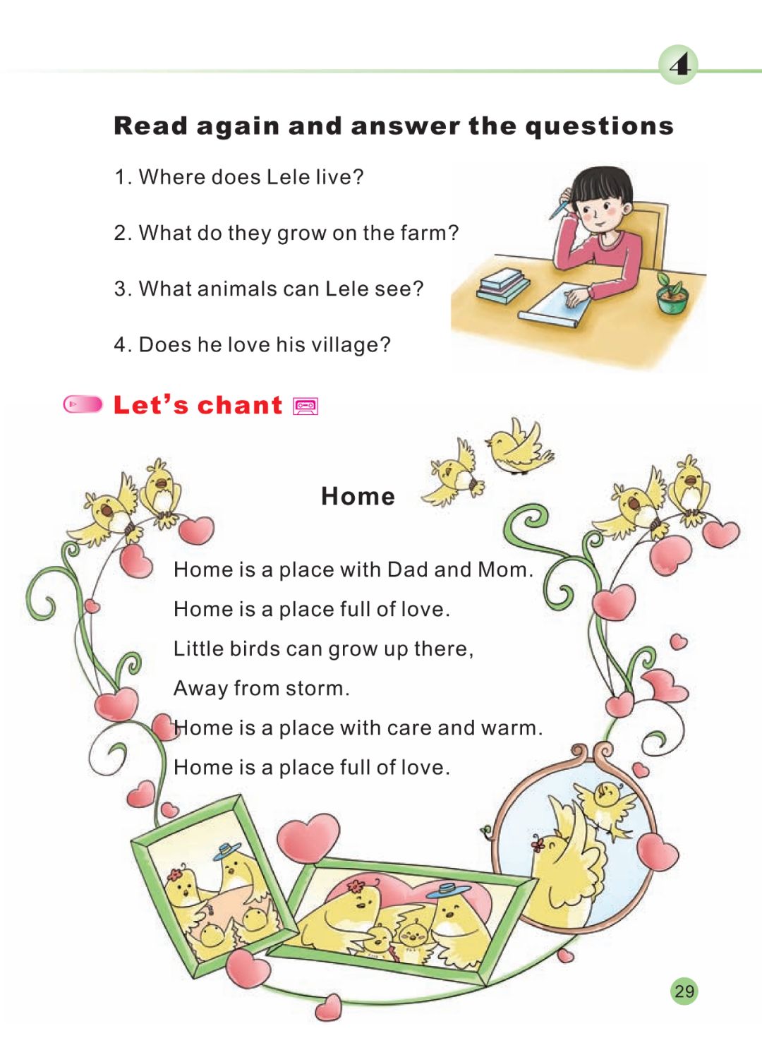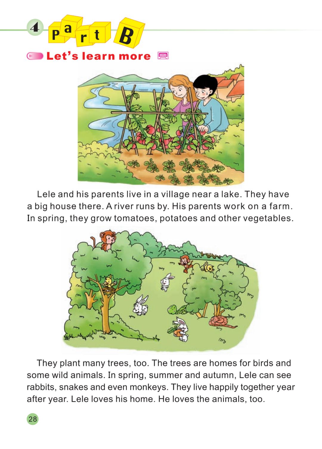 live in a village near a lake.They have a big house there.His parents work on a farm.In spring, they grow tomatoes,potatoes and other vegetables.They plant many trees, too.The trees are homes for birdsIn spring, summer and autumn,They live happily together He loves the animals, too.What do they grow on the farm?What animals can Lele see?Does he love his village?Home is a place full of love.Little birds can grow up there,Home is a place full of love.It is a summer afternoon.A little tiger goes out to play.He runs in the tall grass.“What’s the matter, little Tiger?”They become good friends.