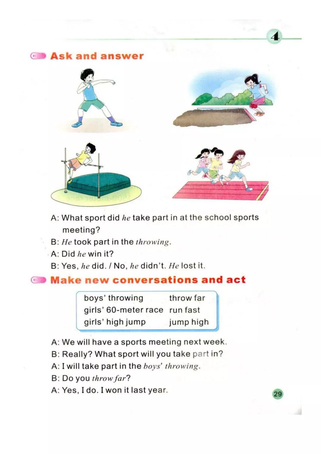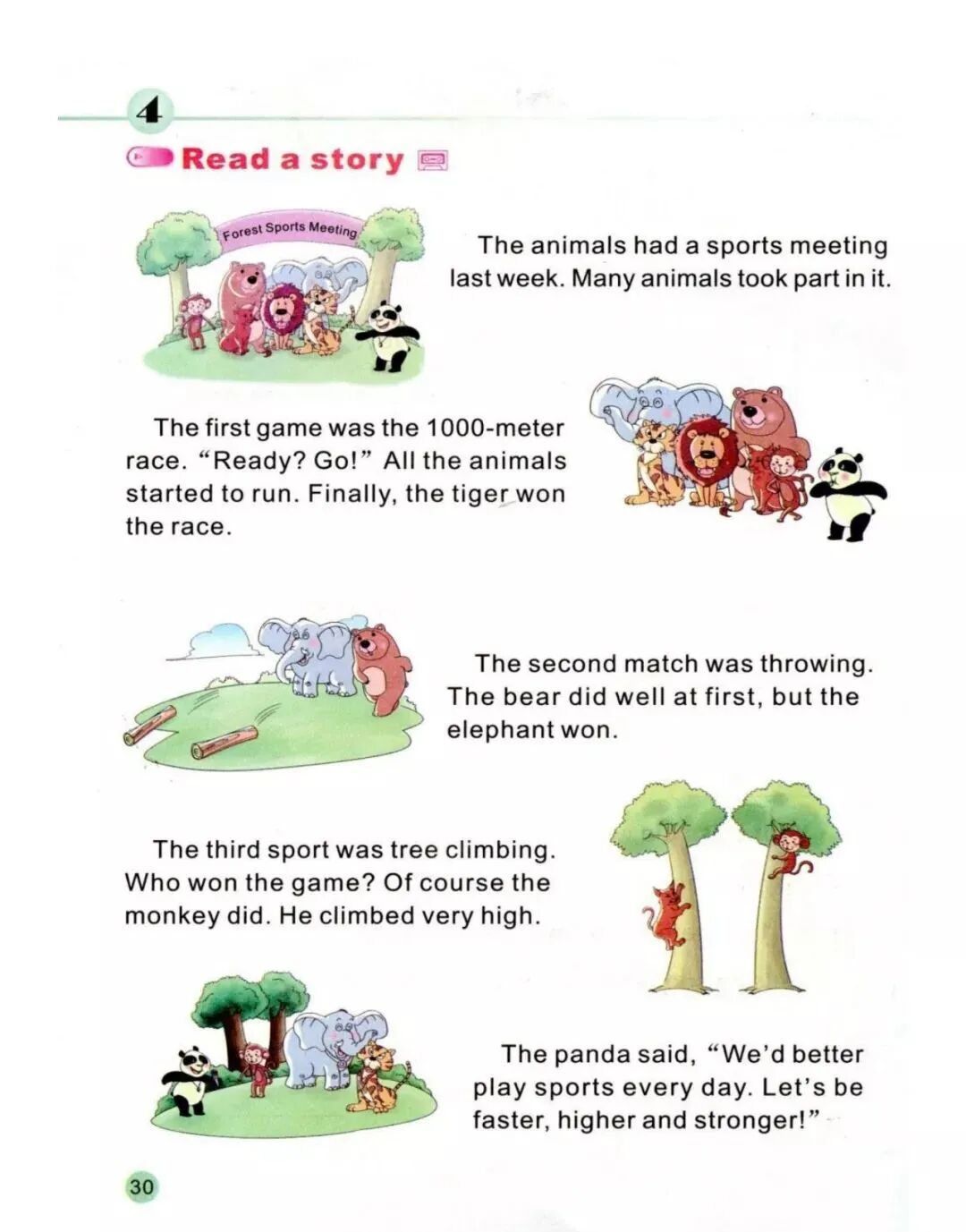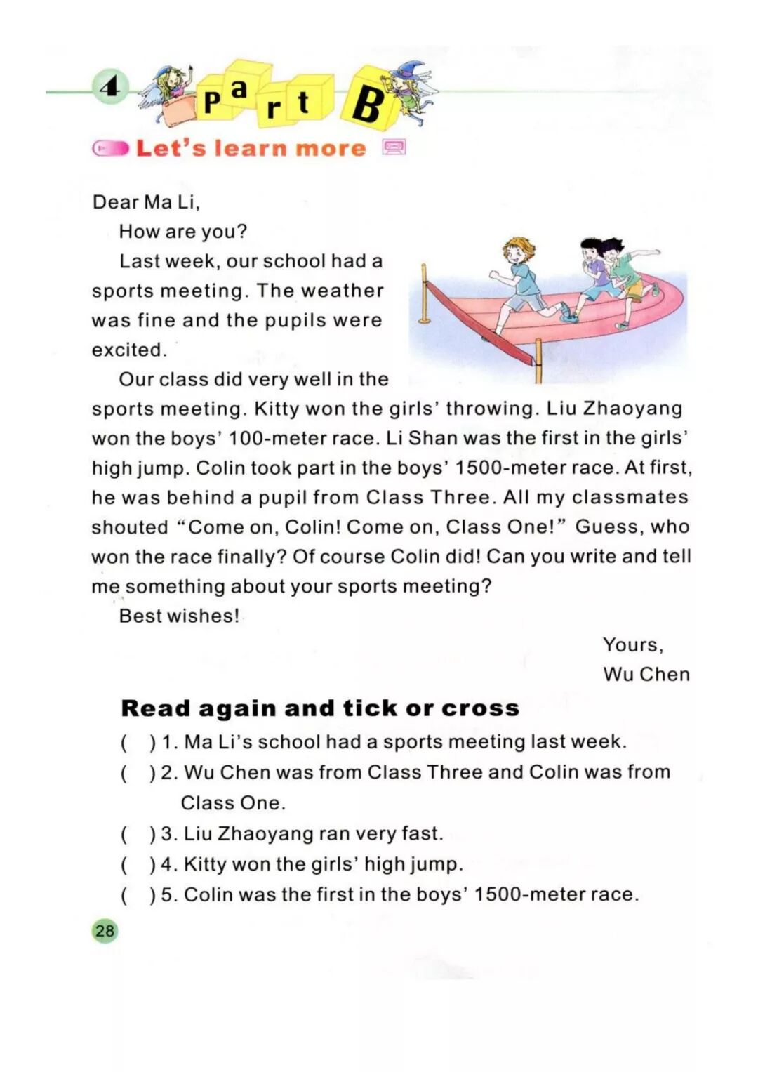 our school had a sports meeting.and the pupils were excited.Kitty won the girls' throwing.the boys' 100-meter race.the boys' 1500-meter race.a pupil from Class Three.All my classmates shouted Guess, who won the race finally?about your sports meeting?Read again and tick or crosshad a sports meeting last week.Wu Chen was from Class Three and Colin was from Class One.Liu Zhaoyang ran very fast.Kitty won the girls’ high jump.in the boys’ 1500-meter race.What sport did he take part in at the school sports meeting?He took part in the throwing.No, he didn’t. He lost it.Make new conversations and actWe will have a sports meeting What sport will you take part in?I will take part in the boys’ throwing.Yes, I do. I won it last year.had a sports meeting last week.Many animals took part in it.All the animals started to run.Finally, the tiger won the race.The second match was throwing.The bear did well at first, The third sport was tree climbing.Of course the monkey did."We'd better play sports every day.