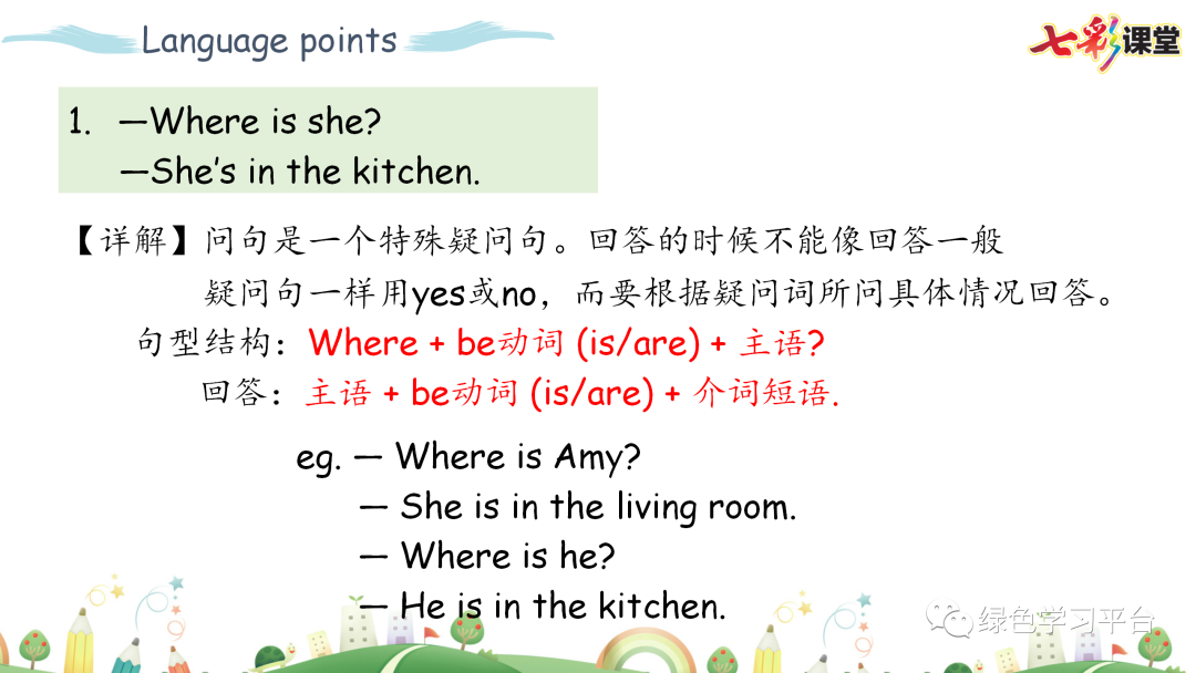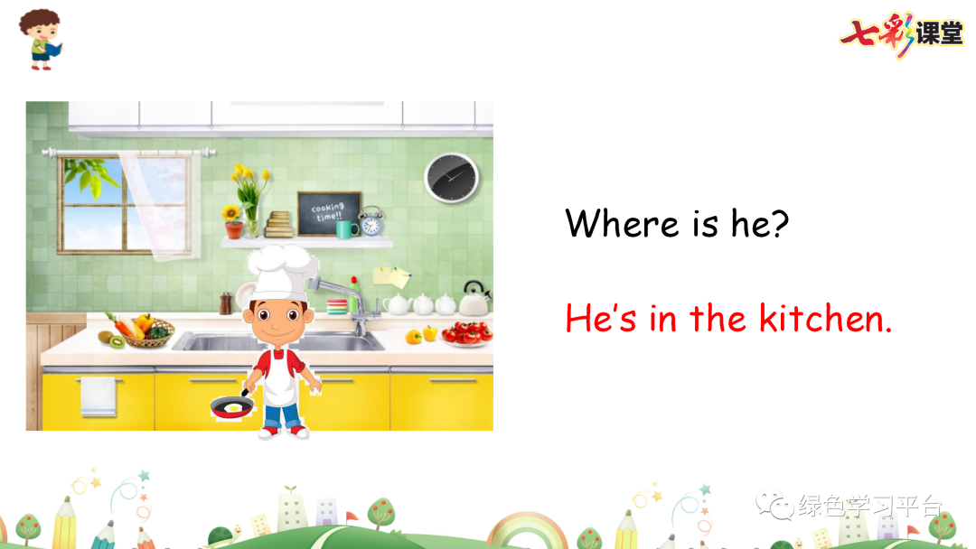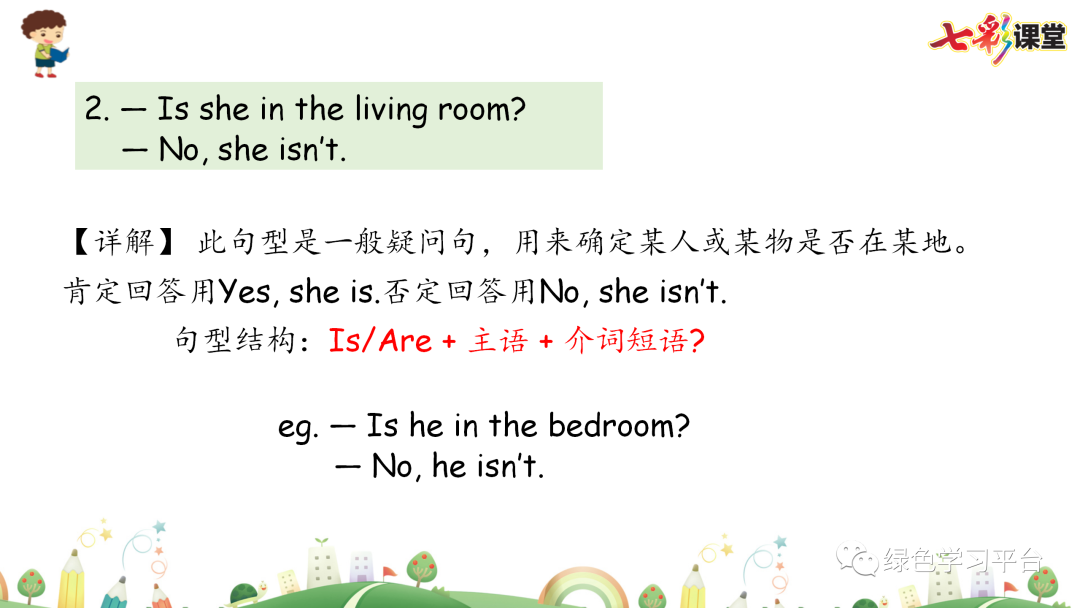 1. 能够听懂、会说句型:Where is she? Is she in the living room? Is she in the study? Yes, she is. / No, she isn’t. She is in the kitchen.