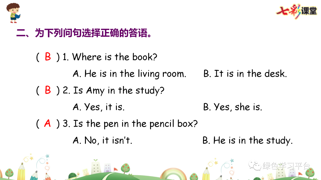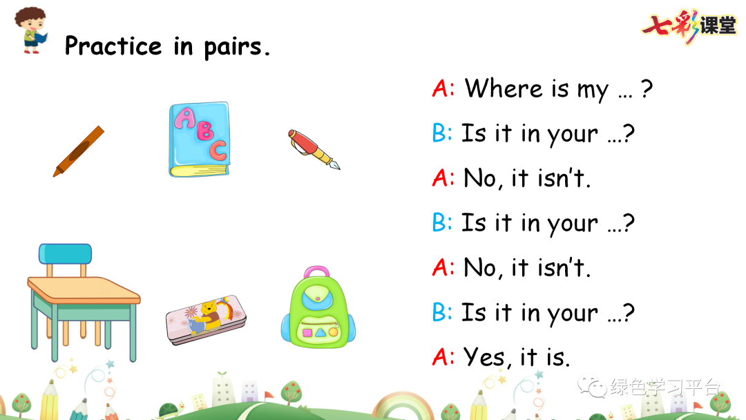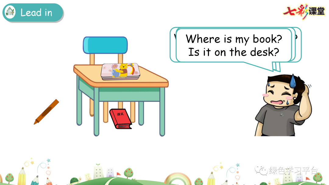 Teacher:Where is my book? Is it in the desk? Is it in your schoolbag? Is it under the desk? Is it on the desk. 引导学生回答:No, it isn’t. Yes, it is.