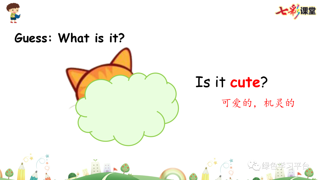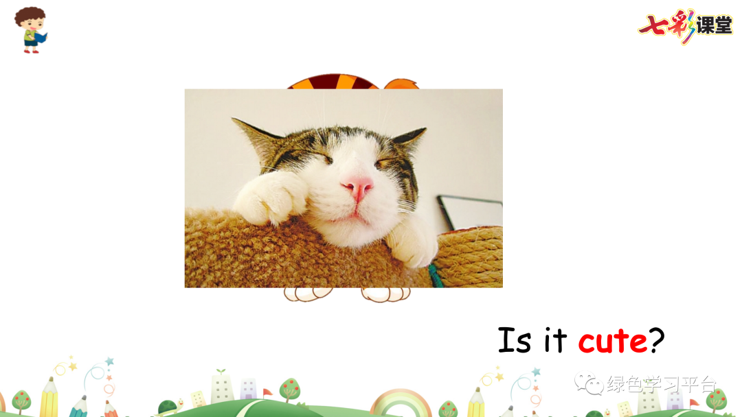 设计意图:以猜测使学生来练习一般疑问句及其回答。同时通过猫的形象来使学生理解词语cute的含义。