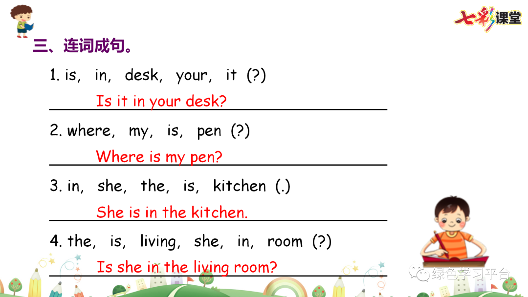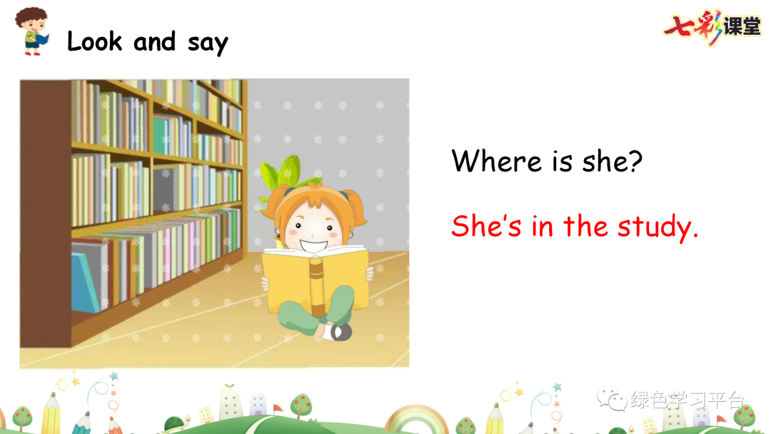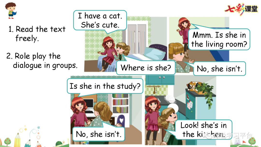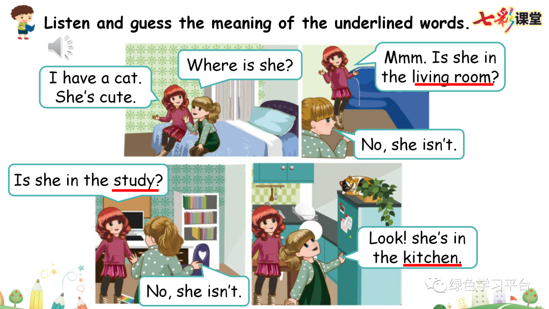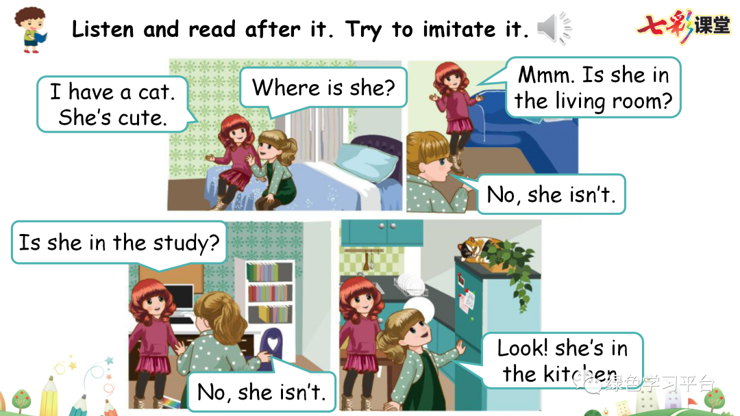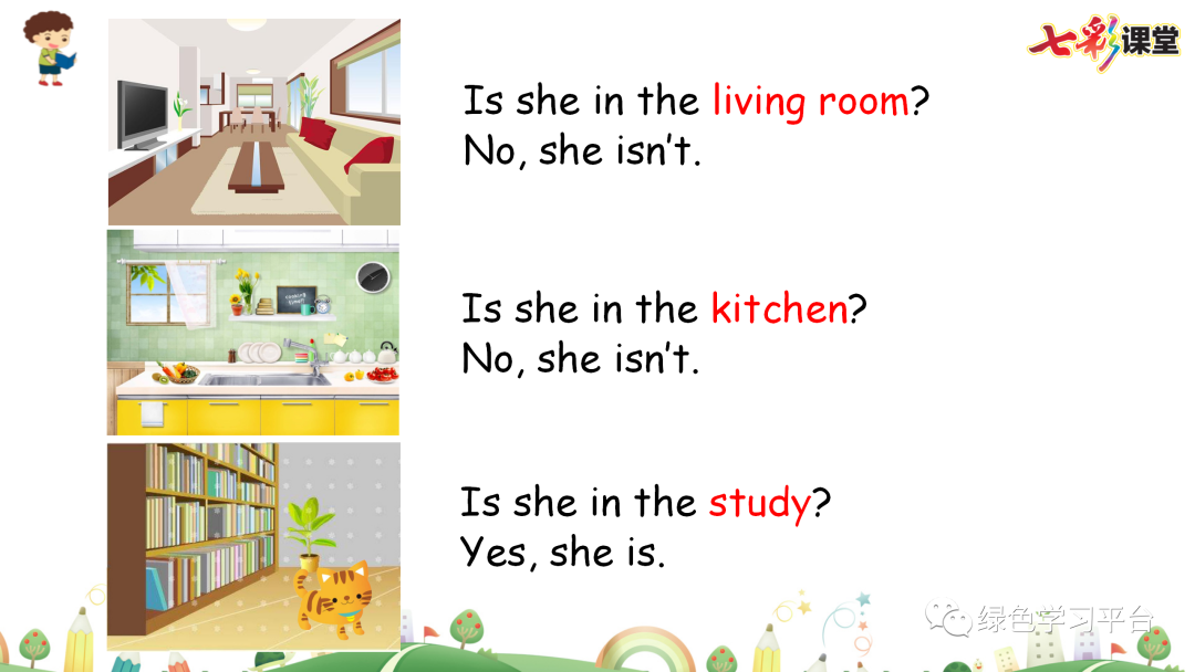 能够听懂、会说句型:Where is she? Is she in the living room? Is she in the study? Yes, she is. / No, she isn’t. She is in the kitchen.