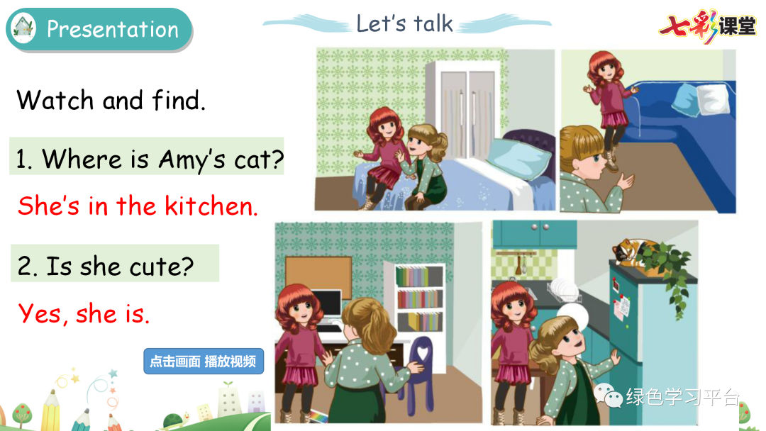 Teacher:Do you like cats? Do you have a cat? Amy has a cat. Is it cute? Where is it? Let’s listen and find.