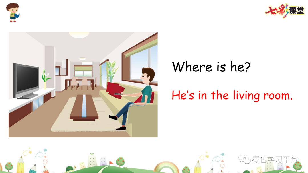 Teacher:Look at me, what am I doing? I am watching TV. So what room am I in? Yes, I am in the living room.