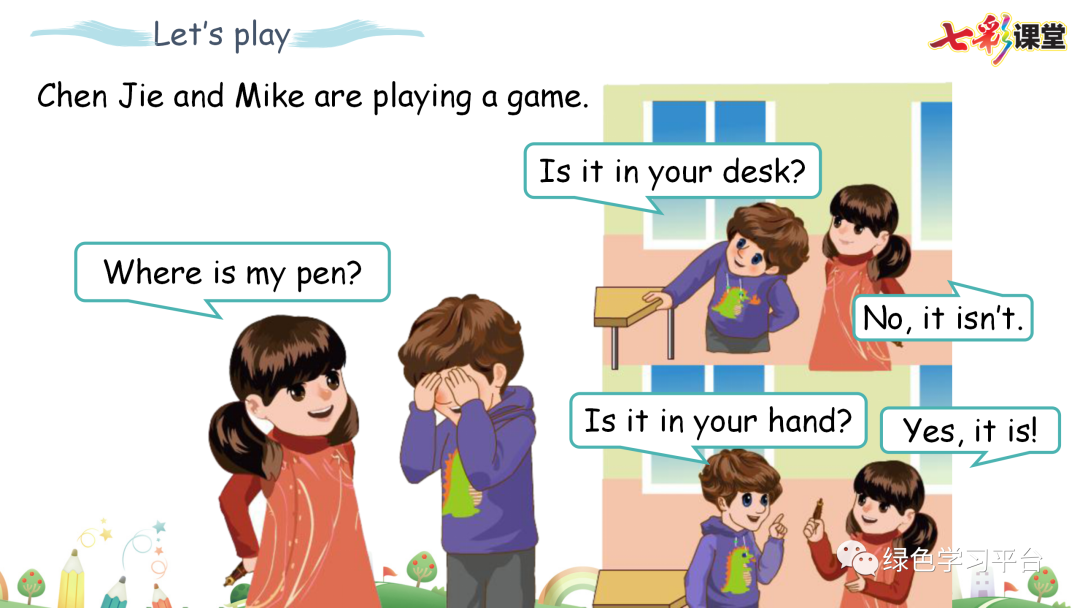 Let’s play是个猜物品位置的游戏。一个同学把自己的文具藏起来,让另外一个同学找一找。在找的过程中,要使用句式:Where is my...? Is it in...? Is it on...? 等。使学生在相对真实的语境中理解重点句式,感受重点句式的含义和用法。同时,在游戏中做到可以自由地表达。