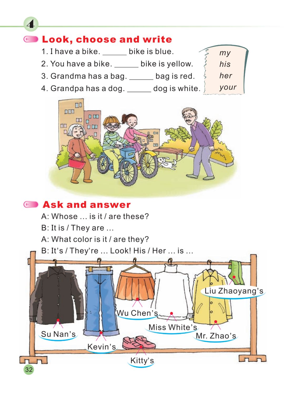 获取配套课件教案习题试卷请拉到文末课文朗读♬点击上方绿标听课文朗读微课讲解微课教学电子课本点击预习:新陕旅版英语三年级下册电子课本课文翻译Look and complete看一看,补充完整 coat cap trousers socks外套帽子裤子袜子sweater shoes skirt bag毛衣鞋裙子包Listen and match听录音并匹配 1.This is Alice’s car.这是爱丽丝的车。 2.That is Colin’s plane.那是科林的飞机。 3.These are Liu Zhaoyang’s balls.这些都是刘兆阳的球。 4.It is Li Shan’s kite.这是李珊的风筝。 5.That’s Aggie’s bike.那是阿吉的自行车。Look, choose and write.看,选,写。 1.I have a bike.My bike is blue.我有一辆自行车。我的自行车是蓝色的。 2.You have a bike.Your bike is yellow.你有一辆自行车。你的自行车是黄色的。 3.Grandma has a bag.Her bag is red.奶奶有一个包。她的包是红色的。 4.Grandpa has a dog.His dog is white.爷爷有一条只狗。他的狗是白色的。 Ask and answer问答 Whose coat is it?It is Su Nan’s.这是谁的外套?是苏楠的。What color is it?It’s black.是什么颜色?是黑色的。 Whose trousers are these?They are Kevin’s.这是谁的裤子?是凯文的。What color are they?They’re blue.是什么颜色的?是蓝色的。 Whose skirt is it?It is Wu Chen’s.这是谁的裙子?这是吴晨的。What color is it?It’s orange.是什么颜色?是橙色的。 Whose shoes are these?They are Kitty’s.这是谁的鞋?是凯蒂的。What color are they?They’re pink.是什么颜色的?是粉红色的。 Whose shirt is it?It is Mr Zhao’s.这是谁的衬衫?是赵先生的。What color is it?It’s yellow.是什么颜色?是黄色的。 Whose socks are these?They are Liu Zhaoyang’s.这是谁的袜子?是刘兆阳的。What color are they?They’re green.是什么颜色的?是绿色的。同步习题一、单项选择。()1. Whose trousers______ they? A. is B. areC. am()2. Whose socks are ______?A. it B. theyC. this()3. ______trousers are blue.A. his B. His C. He二、选词填空。1.— Whose socks _______(A. is B. are)these? — They _______(A. is B. are)my socks.2.— _______(A. Is B. Are)this Su Nan’s skirt?— No. It _______( A. is B. are) Li Yu’s.1. My father has a car. _______( A. Her B. His) car is white.2. — What colour _______(A. is B. are)the socks? — They _______(A. are B. is)blue.三、连词成句1. this your book is(.) _______________________________________2. teacher that my is (.) _______________________________________3. you here are (.) _______________________________________4. come school I by to taxi (.)_______________________________________5. trousers whose these are (?)________________________________________参考答案:一、1. B 2. B 3. B二、1.B B 2.A A 3.B 4. B A三、1.Is this your book?2. That is my teacher.3.Here you are.4.I come to school by taxi.5.Whose trousers are these?怎么获取配套课件教案习题试卷等资料?▼下载方法(务必细看):关注微信公众订阅号【绿色学习平台】(ID:qqyu_520910),在公众号底部菜单中输入下面提示关键字,正常一分钟内即可下载。特别注明:1、如提取不了说明关键字输入错误或操作不当,可以留言等待处理。2、我们不做强制分享获取,但希望你获取资料后还能常来,能帮我们转发分享。3、来了就是朋友,多提意见和建议。 领取方法1 ▼第1步:扫码关注 绿色学习平台第2步:发送关键字【031】即可获取。如有疑问,请添加卿老师微信:yzy5200426。(请按照正确的关键字回复哦,不添字,不错字,不漏字,否则系统无法识别) 领取方法2 ▼打不开百度网盘链接的地区可长按扫码直接进入下载电脑端下载网址http://jazpan.com/view/22805.html▼(回复关键词位置如下图所示)图文来自网络,版权归原作者,如有不妥,告知即删点击阅读原文下载全册PPT课件动画教案习题朗读试卷电子课本整套资料