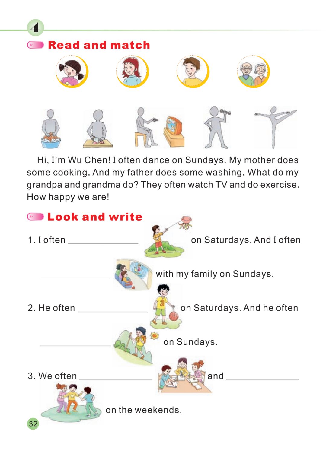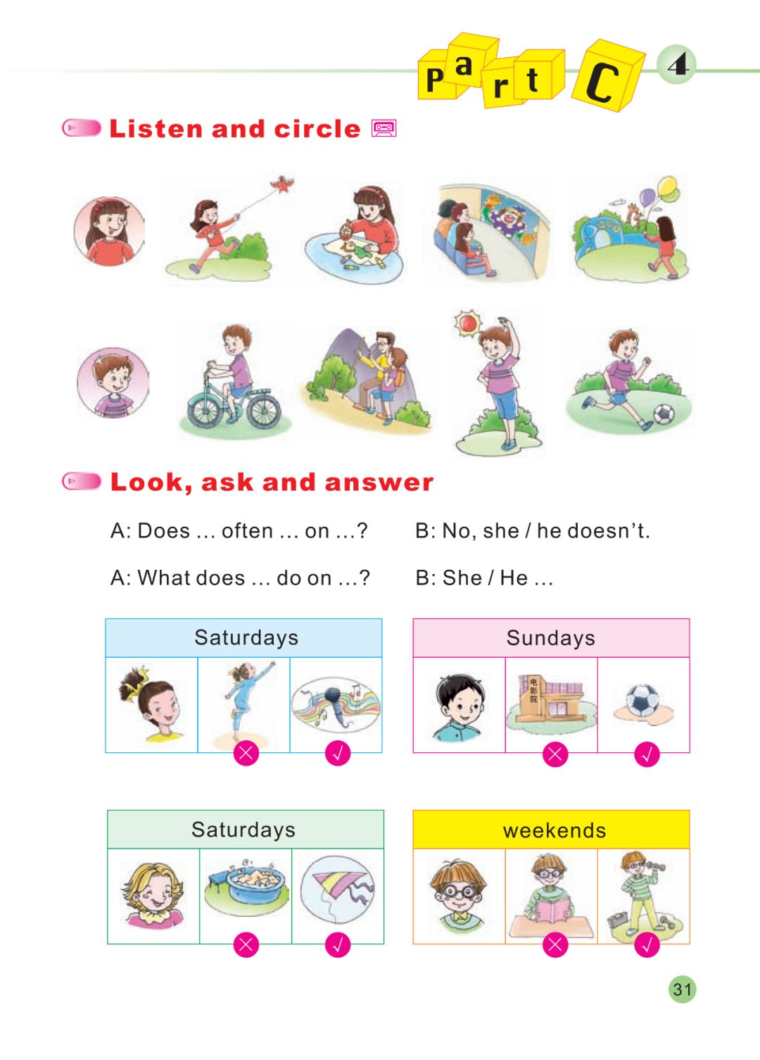 获取配套课件教案习题试卷请拉到文末课文朗读♬点击上方绿标听课文朗读微课讲解微课教学电子课本点击预习:新陕旅版英语四年级下册电子课本课文翻译Listen and circle听一听并圈一圈 What do you do on Sunday?星期天你做什么?I often see a film with my family.我经常和家人一起看电影。Sometimes, I go to the zoo.有时候,我去动物园。Do you often see a film?你经常看电影吗?No, I often climb the mountains with my father.不,我经常和爸爸一起爬山。Sometimes, I play football.有时候,我踢足球。 Look, ask and answer看,问,答 Does Kitty often dance on Saturdays?凯蒂星期六经常跳舞吗?No, she doesn’t.不,她没有。Do she often sing on Saturdays?她星期六经常唱歌吗?Yes, she does.是的,她有。 Does Su Nan often see a film on Sundays?苏楠经常在星期天看电影吗?No, he doesn’t.不,他没有。Does he often play football on Sundays?他经常在星期天踢足球吗?Yes, he does.是的。 Does Alice often do some washing?爱丽丝经常洗衣服吗?No, she doesn’t.不,她没有。Does she often fly a kite on Saturdays?她星期六经常放风筝吗?Yes, she does.是的,她有。 Does Kevin often read a book on the weekends?凯文经常在周末看书吗?No, he doesn’t.不,他没有。Does he often sing on the weekends?他经常在周末唱歌吗?Yes, he does.是的,他有。Read and match读一读,连一连 Hi, I’m Wu Chen!嗨,我是吴晨!I often dance on Sundays.我经常在星期天跳舞。My mother does some cooking.我妈妈做饭。And my fatherdoes some washing.我父亲洗衣服。What do my grandpa and grandma do?我爷爷奶奶是做什么的?They often watch TV and do exercise.他们经常看电视和做运动。How happy we are!我们多幸福啊! Look and write看一看,写一写 1.I often fly a kite on Saturdays.我经常在星期六放风筝。And I often see a film with my family on Sundays.我经常在星期天和家人一起看电影。 2.He often plays basketball on Saturdays.他经常在星期六打篮球。And he often climbs the mountain on Sundays.他经常在星期天爬山。 3.We often do homework and sing on the weekends.周末我们经常做作业和唱歌。同步习题一、选择合适的句子补全对话。1.— DoesheoftenplaybasketballonSunday?A.Yes,hedoes.— 2. — WhatdoyoudoonSaturday?B.Idosomeexercise.— 3. — Doesheoftenseeafilm?C.Butsometimesheplaysbasketball.— Heoftenruns. 4. — Whatdoesyourbrotherdoontheweekend?D.Heoftenclimbsthemountain.— 5. — Doesyourbrotherplayfootball?E.No,hedoesn’t.— 二、连词成句。1. are doing you what (?)_______________________________________________2. often washing some does she (.)_______________________________________________3. see I a with film mom my (.)_______________________________________________三、情景交际。( )1.当你想知道对方正在做什么时,你可以问: A. Whatareyoudoing?B.Whatdoyoudo?( )2.当你想告诉别人你正在做锻炼时,你可以说: A. Iamdoingexercise.B.Heisdoingexercise.( ) 3.当你想知道李娜经常做什么时,你可以问: A. WhatdoesLiNaoftendo?B.WhereisLiNa?( ) 4.当你想知道对方是否经常放风筝时,你可以问: A. Doesheoftenflykites?B.Doyouoftenflykites?参考答案:一、1. D 2. B 3. E 4. D 5. A二、1. What are you doing?2. She often does some washing.3. I see a film with my mom.三、1. A 2. A 3. A 4. B 怎么获取配套课件教案习题试卷等资料?▼下载方法(务必细看):关注微信公众订阅号【绿色学习平台】(ID:qqyu_520910),在公众号底部菜单中输入下面提示关键字,正常一分钟内即可下载。特别注明:1、如提取不了说明关键字输入错误或操作不当,可以留言等待处理。2、我们不做强制分享获取,但希望你获取资料后还能常来,能帮我们转发分享。3、来了就是朋友,多提意见和建议。 领取方法1 ▼第1步:扫码关注 绿色学习平台第2步:发送关键字【041】即可获取。如有疑问,请添加卿老师微信:yzy5200426。(请按照正确的关键字回复哦,不添字,不错字,不漏字,否则系统无法识别) 领取方法2 ▼打不开百度网盘链接的地区可长按扫码直接进入下载电脑端下载网址http://jazpan.com/view/22807.html▼(回复关键词位置如下图所示)图文来自网络,版权归原作者,如有不妥,告知即删点击阅读原文下载全册PPT课件动画教案习题朗读试卷电子课本整套资料