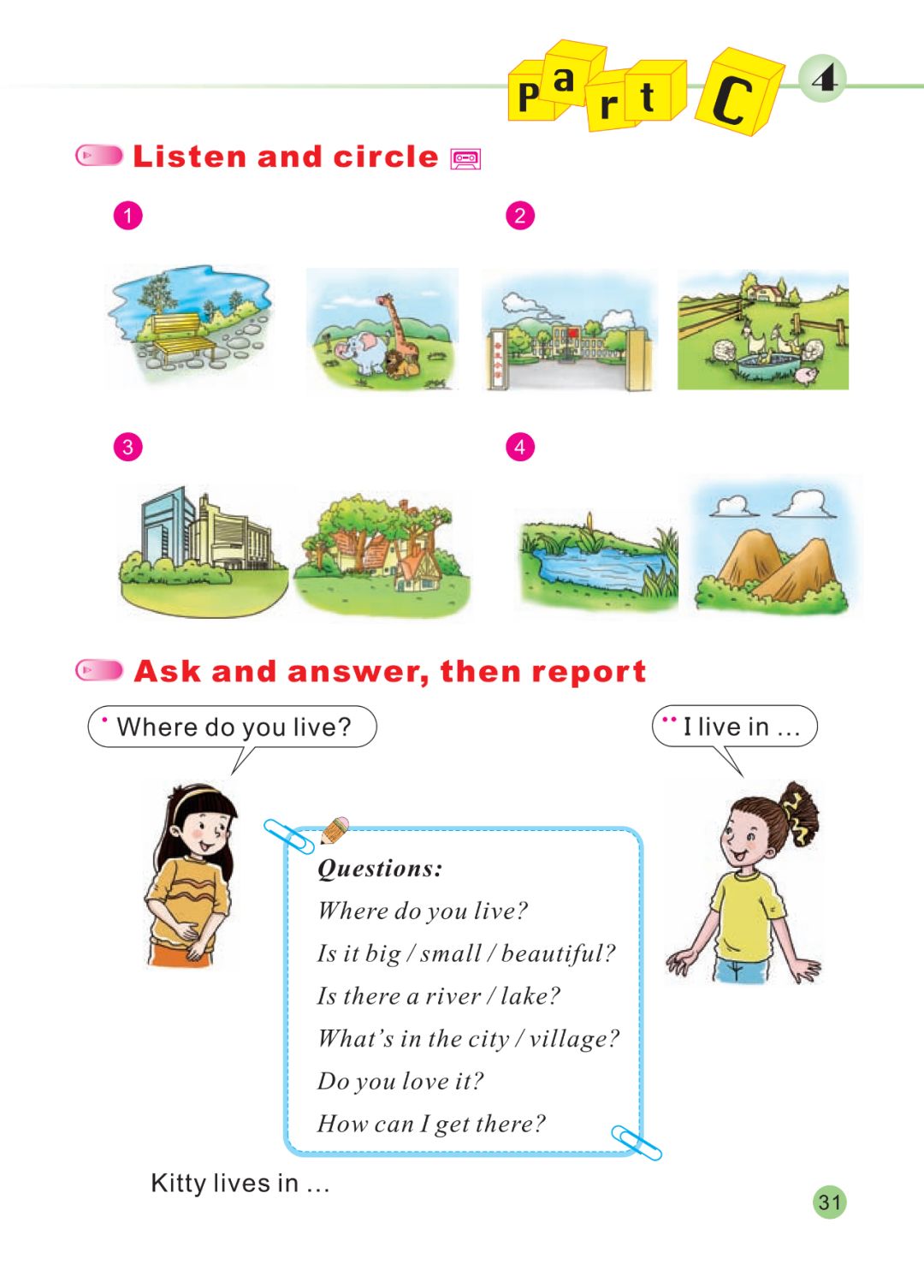 获取配套课件教案习题试卷请拉到文末课文朗读♬点击上方绿标听课文朗读微课讲解微课教学电子课本点击预习:新陕旅版英语五年级下册电子课本课文翻译Listen and circle听录音,圈出正确答案。 1.It’s Sunday, many people come here.今天是星期天,很多人来这里。Some are going around the lake.有些人正在湖边散步。Children are playing games happily.孩子们正在快乐地玩游戏。 2.People here plant many things in spring, summer and autumn.这里的人们在春天、夏天和秋天种植许多东西。They have fruits and vegetables.他们有水果和蔬菜。 3.People here get up early in the morningfrom Monday to Friday.这里的人从周一到周五早上起床很早。Some go to work by bus.有些人乘公共汽车去上班。Some go by cars.有些人开车去。And some ride their bikes.有些人骑自行车。 4.In spring, trees become green again.春天,树木又变绿了。People like to camp and play there.人们喜欢在那里露营和玩耍。 Ask and answer. Then report.问答。然后做报告。 Where do you live?你住在哪里?I live in ...我住在...... Questions: 问题:Where do you live?你住在哪里?Is it big/ small/ beautiful?它大/小/漂亮吗?Is there a river / lake?有河流/湖泊吗?What’s in the city / village?城市/村庄里有什么?Do you love it?你喜欢吗?How can I get there?怎么去? Kitty lives in ...凯蒂住在......Read and number阅读并编号 1.Can you see the birds?你能看见鸟儿吗?No. They are singing in the tree.不。它们在树上唱歌。But I can’t see them.但是我看不到它们。 2.It is near our village.它在我们村子附近。Fish live happily in the water.鱼在水中快乐地生活。 3.What is your father?你父亲是干什么的?He is a farmer.他是一个农民。He plants potatoes, tomatoes and many fruits with my mother.他和我妈妈一起种土豆、西红柿和许多水果。 Read and complete阅读并完成 Mr. Smith has a farm near a river.史密斯先生在河边有一个农场。He grow tomatoes, potatoes and other vegetables.他种植西红柿、土豆和其他蔬菜。 He plants trees and flowers on the farm, too.他也在农场种树和种花。The trees are homesfor birds and some wild animals.这些树是鸟类和一些野生动物的家园。In spring, summer and autumn, 在春天、夏天和秋天,he can see rabbits, snakes and even monkeys.他可以看到兔子、蛇,甚至猴子。In the river, he can catch fish.在河里,他可以抓鱼。Mr. Smith lives happily there.史密斯先生在那里快乐地生活着。同步习题一、根据汉语意思写单词。1. ______________(野生的) 2. ______________[从……旁边(过去)]3.______________(种植;生长) 4. ______________(其他的;别的)5.______________(甚至)二、按要求完成下列各题。1. he(形容词性物主代词)__________ 2. run(第三人称单数形式)________3. tomato(复数形式)_________ 4.summer(对应词)__________5. by(同音词)___________ 6.happy(副词)___________7. tree(复数形式)____________ 8. potato(复数形式)___________三、翻译下列句子。1. Do you livein a city, too?__________________________2. How can I getthere ?__________________________2. Theyhave a big house there.__________________________3. Ariver runs by.__________________________4. Hisparents work on a farm.__________________________四、连词成句。1. your house Is small (?)___________________________2. home Where your is (?)___________________________3. very sounds It nice (.)___________________________参考答案:一、1.wild 2. by 3. grow 4. other 5. even二、1.his 2. runs 3. tomatoes 4. winter 5. buy 6. happily 7. trees 8. potatoes三、1.你也住在城市里吗? 2. 我怎么能到达那里?3.他们在那有一栋大房子。4.一条河流经过。5. 他的父母在农场工作。四、1.Is your house small?2.Where is your home?3.It sounds very nice.怎么获取配套课件教案习题试卷等资料?▼下载方法(务必细看):关注微信公众订阅号【绿色学习平台】(ID:qqyu_520910),在公众号底部菜单中输入下面提示关键字,正常一分钟内即可下载。特别注明:1、如提取不了说明关键字输入错误或操作不当,可以留言等待处理。2、我们不做强制分享获取,但希望你获取资料后还能常来,能帮我们转发分享。3、来了就是朋友,多提意见和建议。 领取方法1 ▼第1步:扫码关注 绿色学习平台第2步:发送关键字【052】即可获取。如有疑问,请添加卿老师微信:yzy5200426。(请按照正确的关键字回复哦,不添字,不错字,不漏字,否则系统无法识别) 领取方法2 ▼打不开百度网盘链接的地区可长按扫码直接进入下载电脑端下载网址http://jazpan.com/view/22809.html▼(回复关键词位置如下图所示)图文来自网络,版权归原作者,如有不妥,告知即删点击阅读原文下载全册PPT课件动画教案习题朗读试卷电子课本整套资料